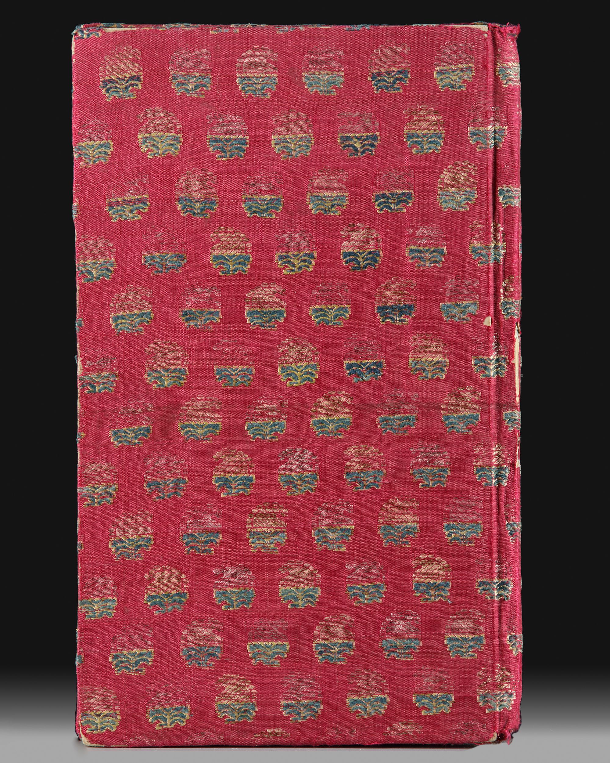 Jalal al-Din Muhammad Rumi, known as 'Molavi', Masnavi, book 3 only (of 6), in Farsi, illuminated manuscript on paper [Northern India (possibly Kashmir), dated 1243 AH/1827-18 AD) 60 leaves (plus 2 flyleaves), wanting one bifolia (from centre of second gathering), 4 columns, 22 lines black nasta'liq per page, headings in red, large illuminated heading opening the text, leaves ruled in orange, blue and gold, catch-words throughout, contemporary foliation, contemporary brocade decorated silk over paste boards, spine and outer extremities a little rubbed and worn, overall very attractive and presentable volume The third book of Rumi's six-part epic. Often considered a complete work in itself, it deals primarily with themes around epistemology delivered to the reader by interweaving and amusing stories. borders wormed with some occasional losses to text, 31 x 19 cm.
