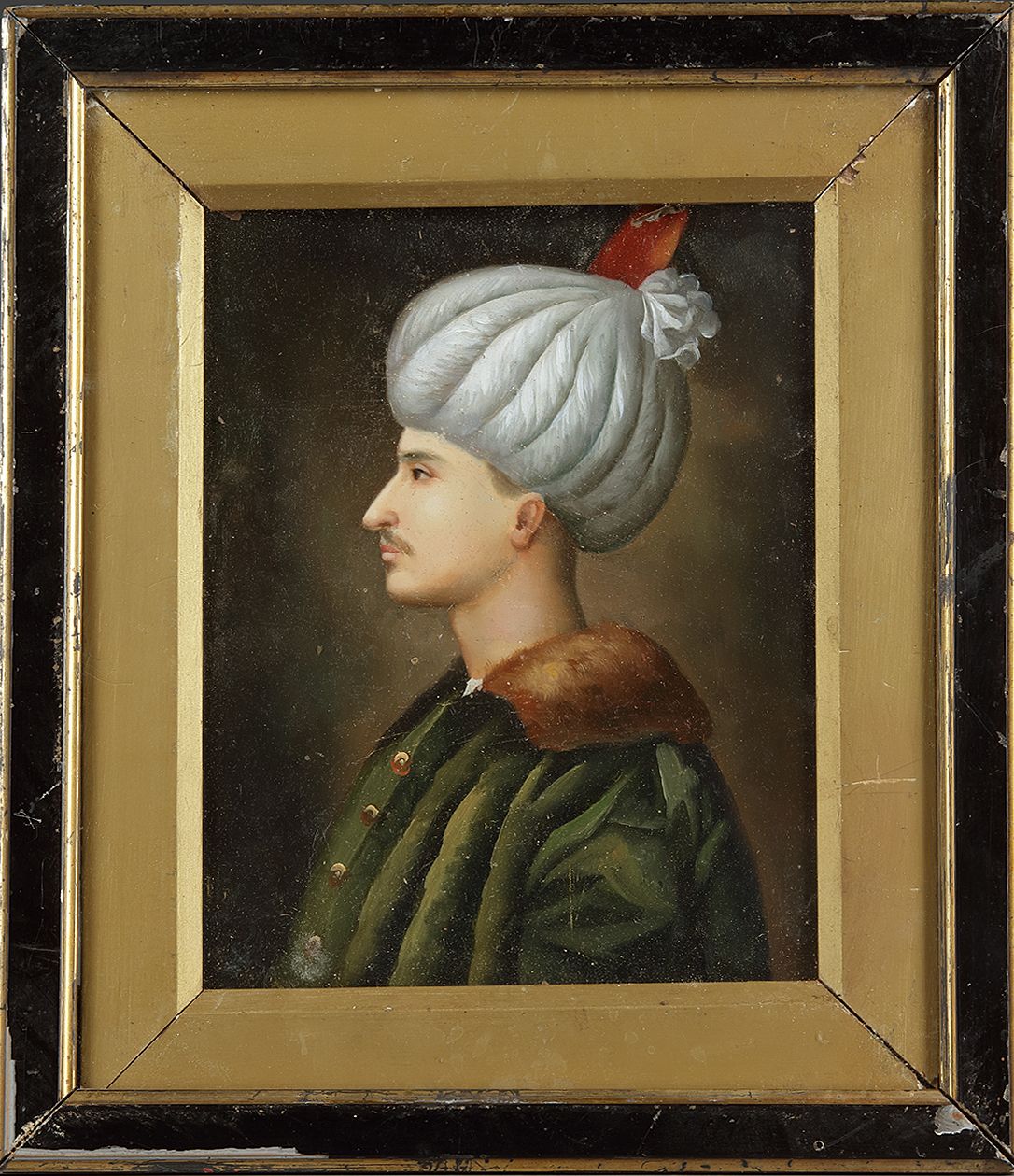 A portrait of Suleiman the Magnificent. Oil on wood. 25 by 19 cm.