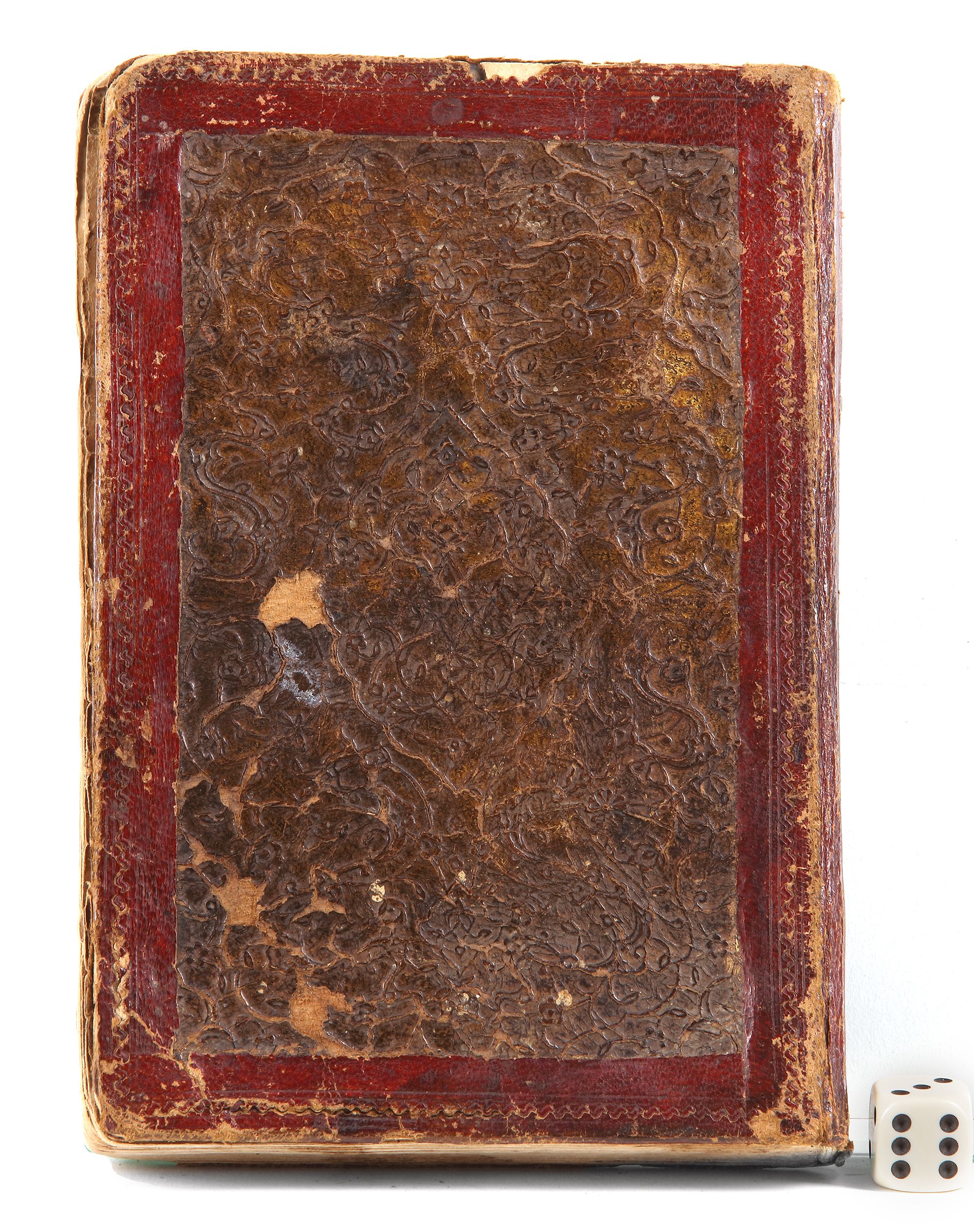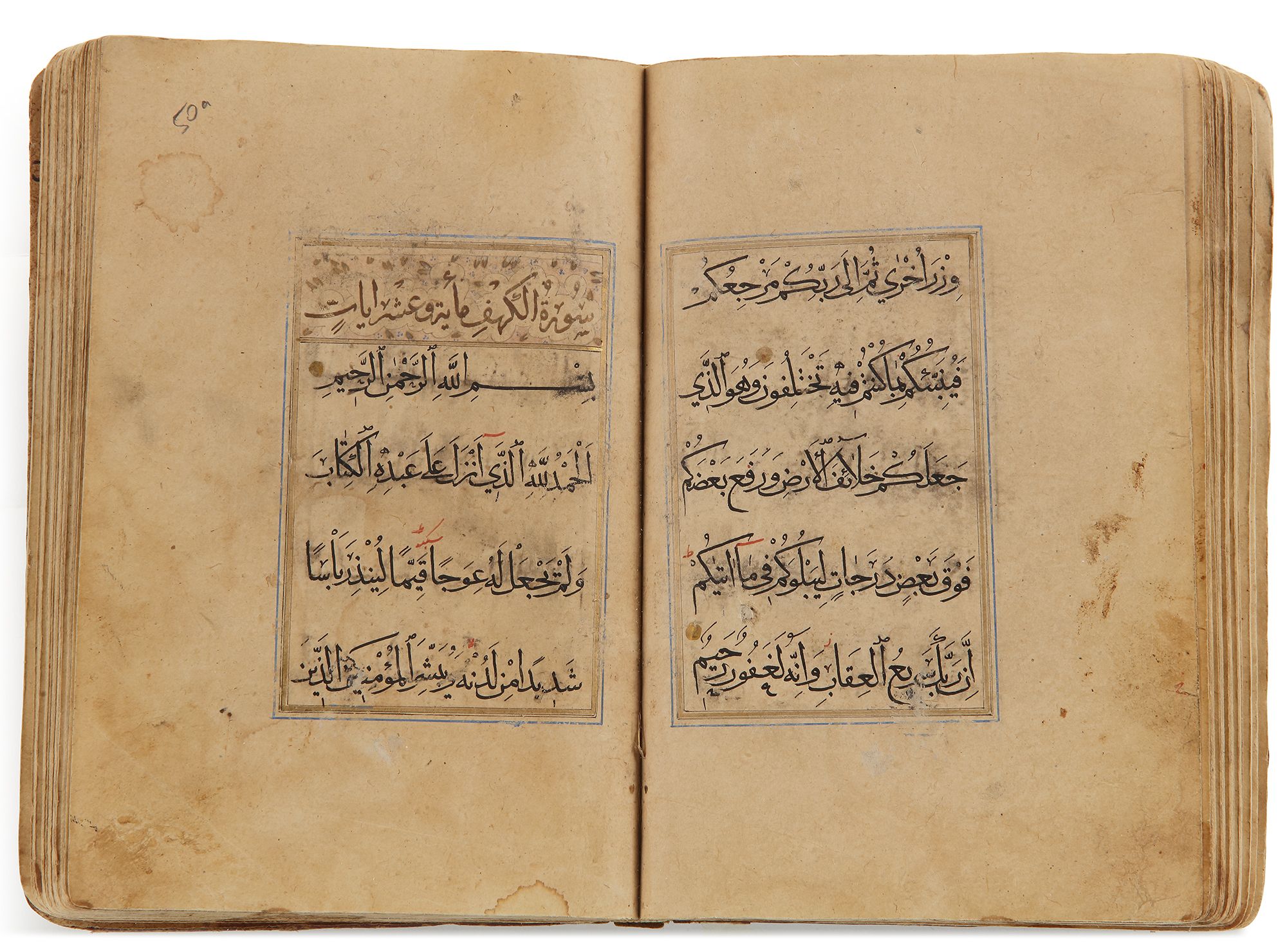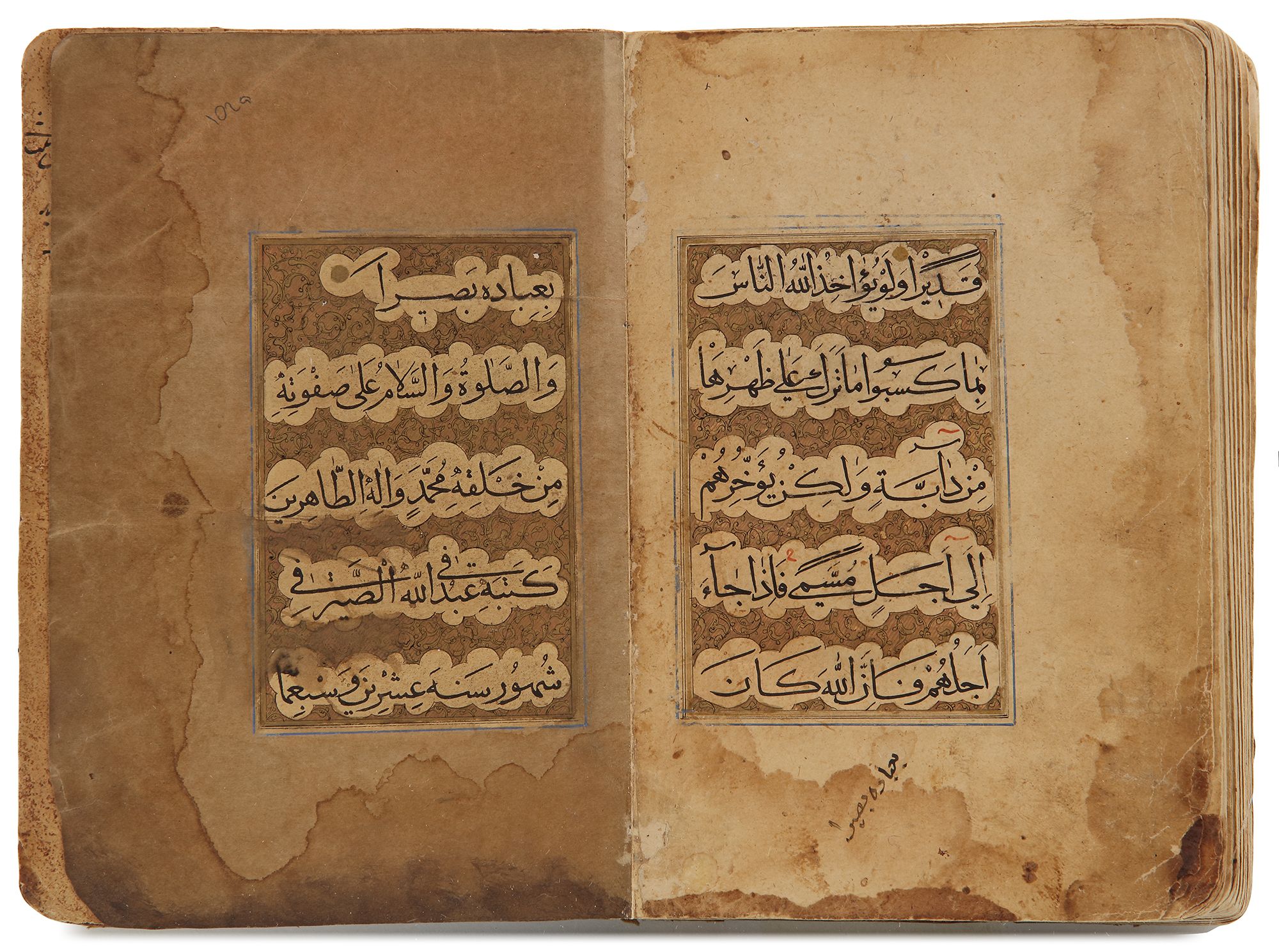 An Arabic manuscript on paper, 104 leaves, 5 lines to the page, written in fine naskh script in black ink, 5 surahs and 381verses including surah Al Fatiha, surah Al An’am, Al Kahf, surah Saba and surah Fatir. Surah headings written in gold thuluth script within gold-ground floral panels. Al Tajwid, in diacritics in red ink. Opening illuminated double-page frontispiece elaborately decorated with interlacing polychrome flowers against a punched gold ground. The last double-page in five lines to the page written in naskh script, laid down on clouds against a gold ground, binding with gilt-stamped medallions and cornerpieces composed of scrolling vines. 18.3 by 12.5 cm.