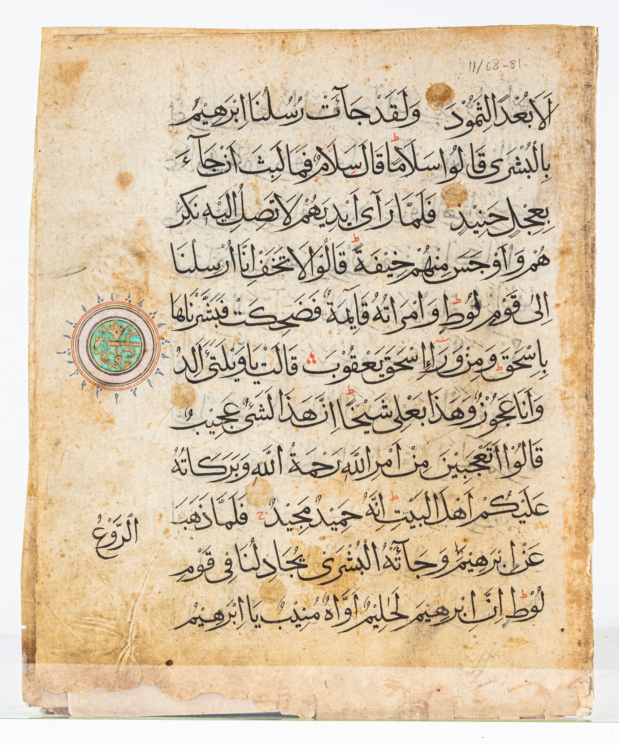 An Arabic manuscript on paper, 17 leaves with 11 lines to each page, written in large back naskh script with Tajwid in red ink. Gold verse markers surrounded by double black border, large gold roundels marking Juz and hizb. Quran 2 surah Al-Baqarah v.71-v.80, Quran 3 surah Al-Imraan v.26-v.84, Quran surah 4 Al-Nisa v153-v.162, Quran 10 v.35-v.47, Quran 11 surah Hud v.68-v.81. Quran 24 surah Al-Nur v.33-40, Quran 25 surah Al-Furqaan v.59-v.73, Quran 26 surah Al-Shuara v.35-v.200, Quran 56 surah Al-Waqi'a v. 43-v.71. Quran 57 surah Al-Hadid v.11-v.18 31 by 23 cm.
