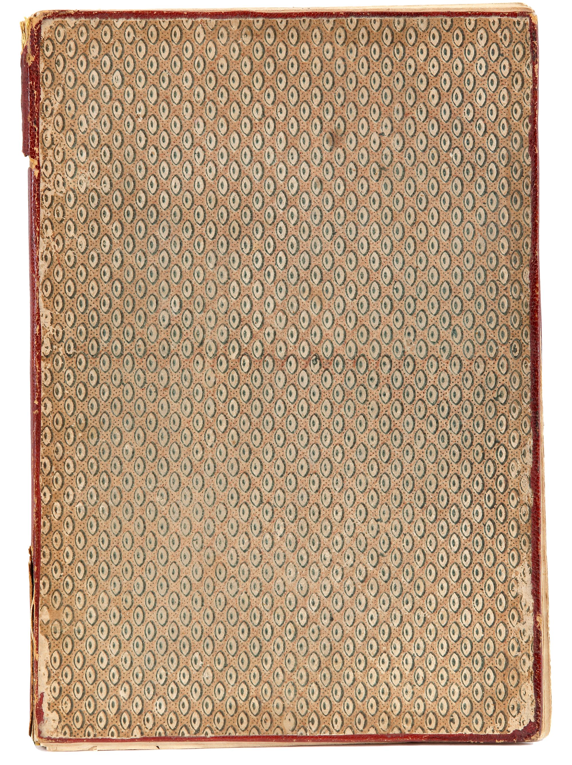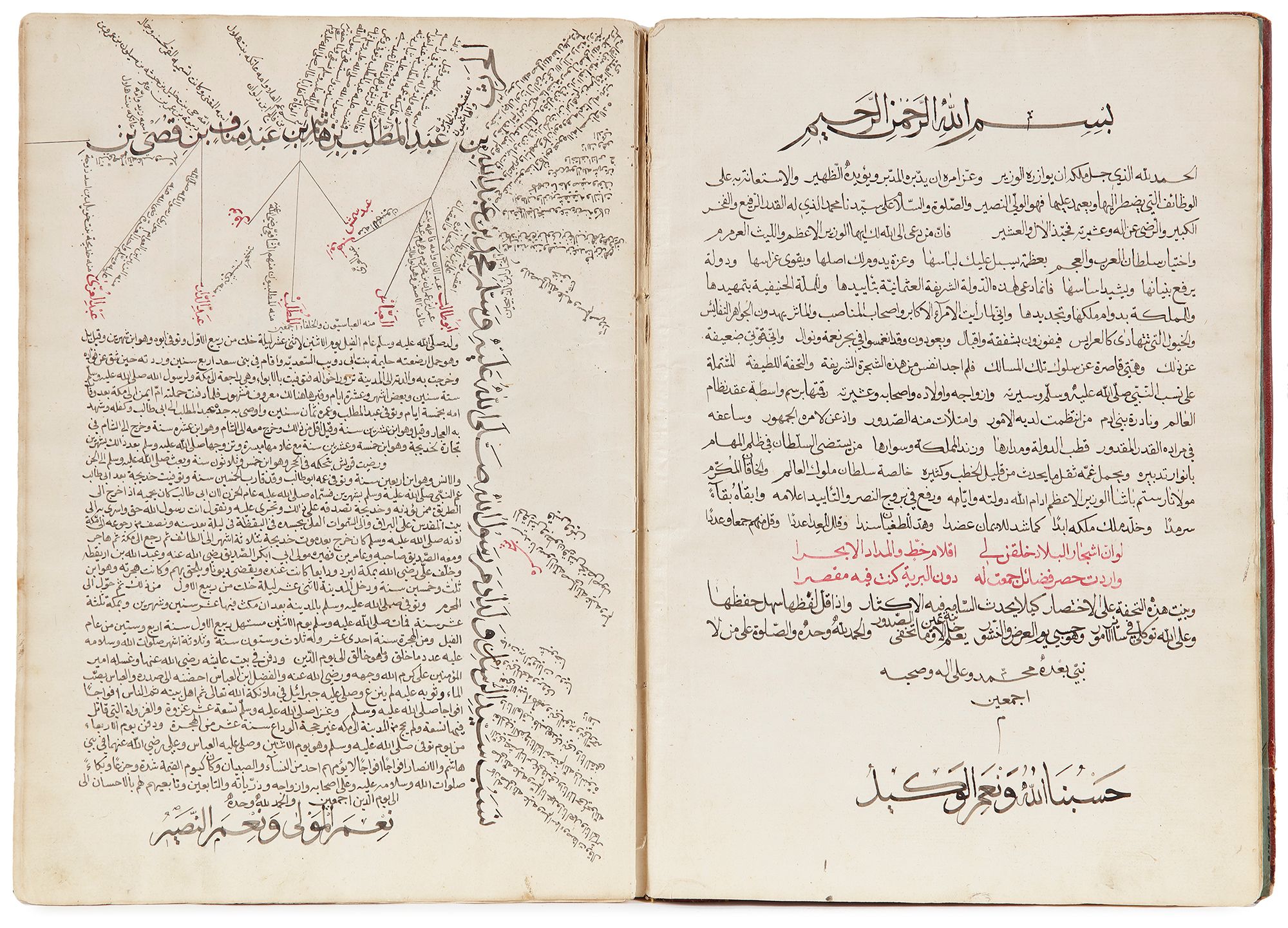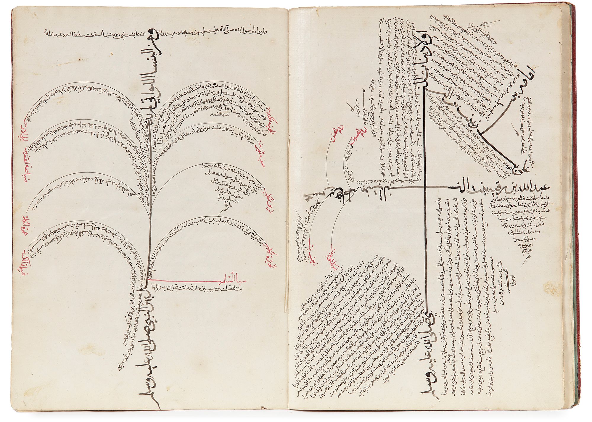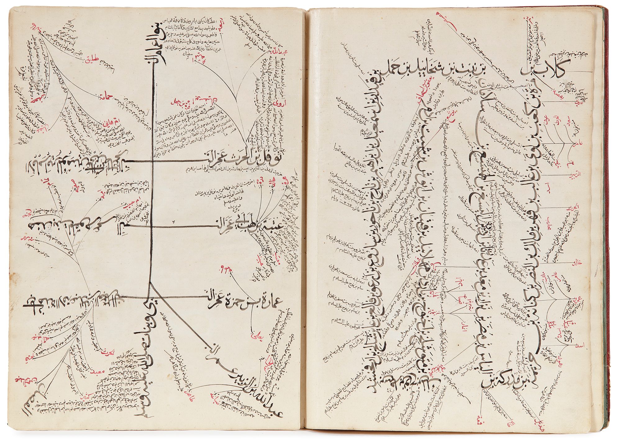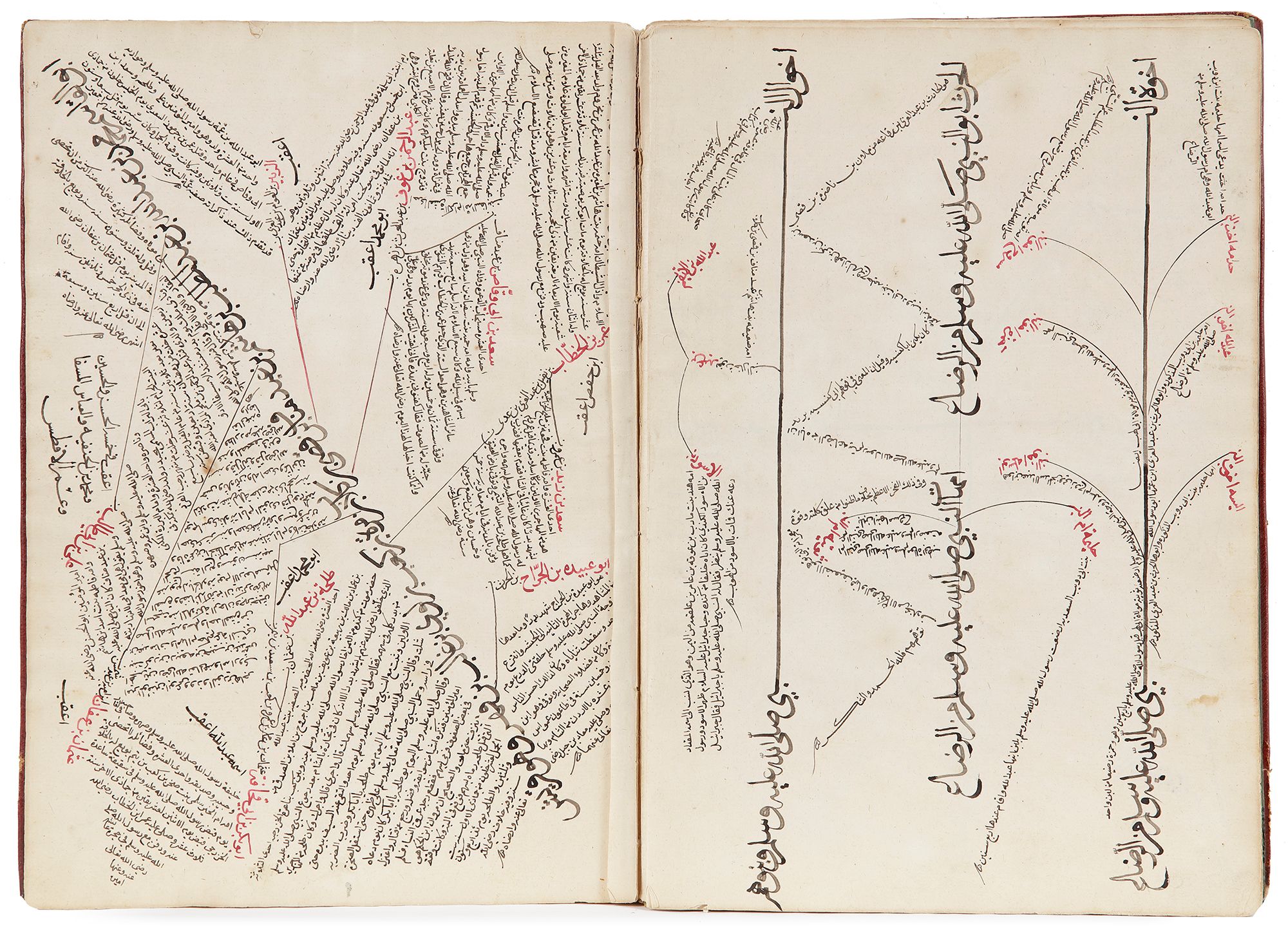 Arabic manuscript on cream paper with tre lune watermark, 8 leaves plus nine flyleaves, text in black and red naskh, black lines connecting the genealogical tree, copious annotations in black, opening folio with name of Rustam Pasha, in paper covered red leather binding, blue paper doublures. Folio: 31.8 by 21.8 cm.