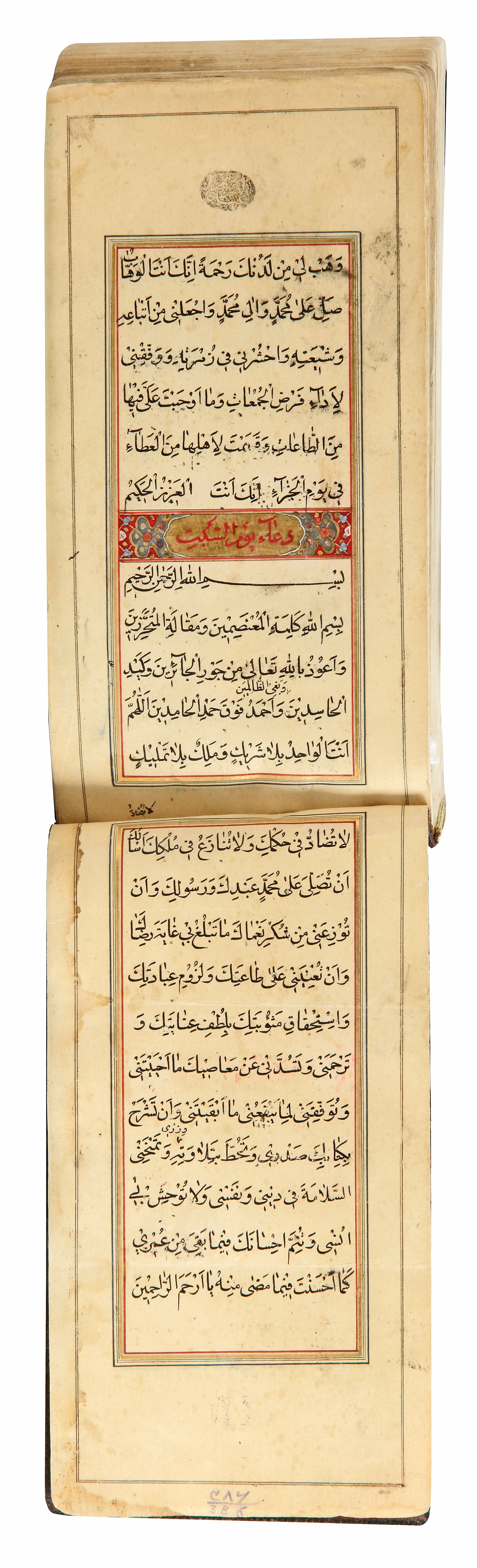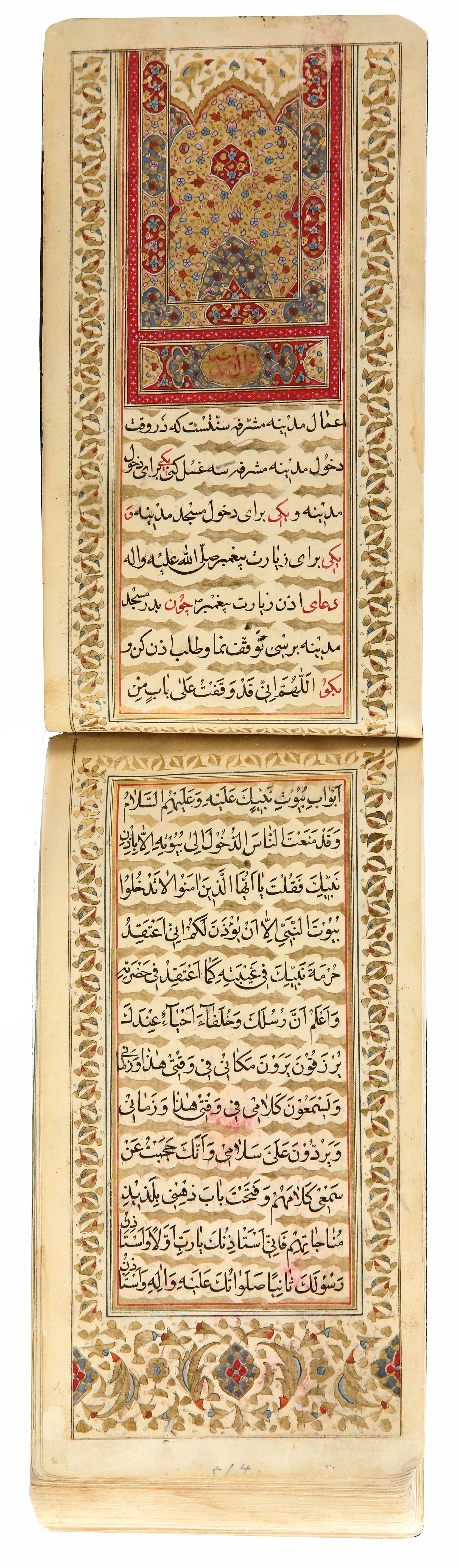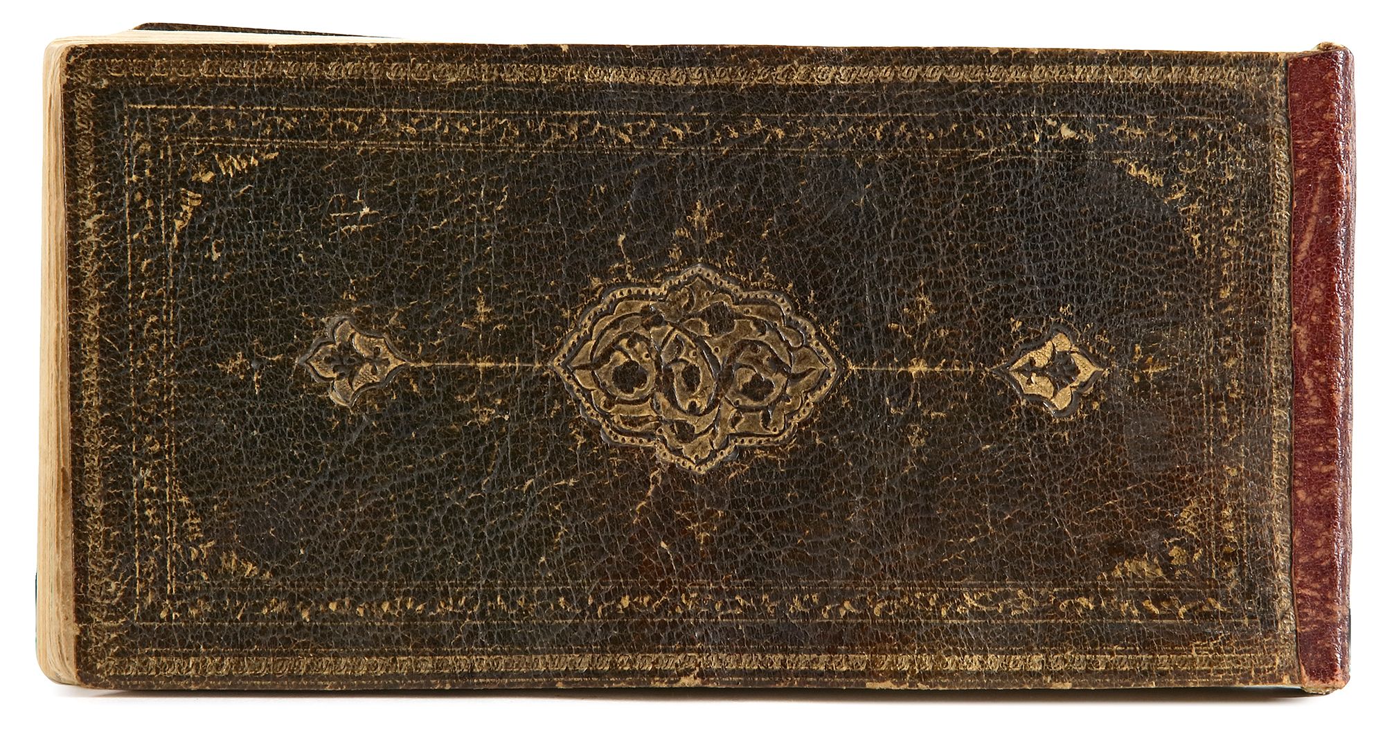 Arabic manuscript on paper, 194 leaves, plus one fly leaf, each folio with 12 lines of neat black naskh, important words and phrases picked out in red, headings in red within gold and polychrome illuminated cartouches, text panels outlined in gold and polychrome, gold outer rules, opening bifolio with gold and polychrome illuminated header and borders, fly-leaf with copious owner's notes, in soft brown morocco with stamped central medallion and borders, maroon Morocco doublures. Folio 16.7 by 8.6 cm.