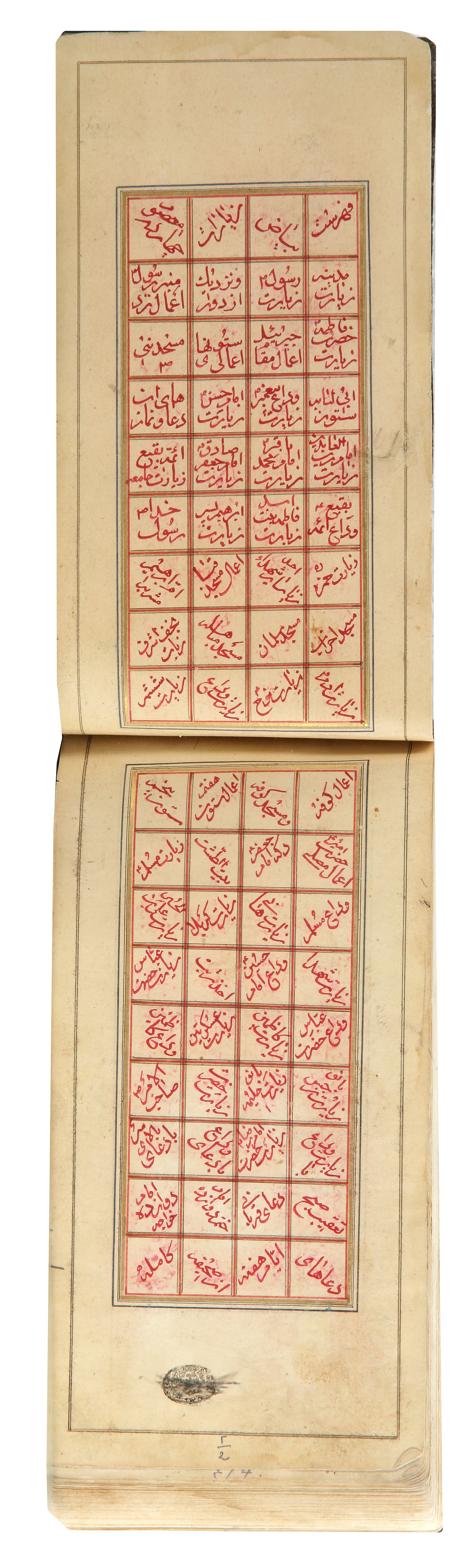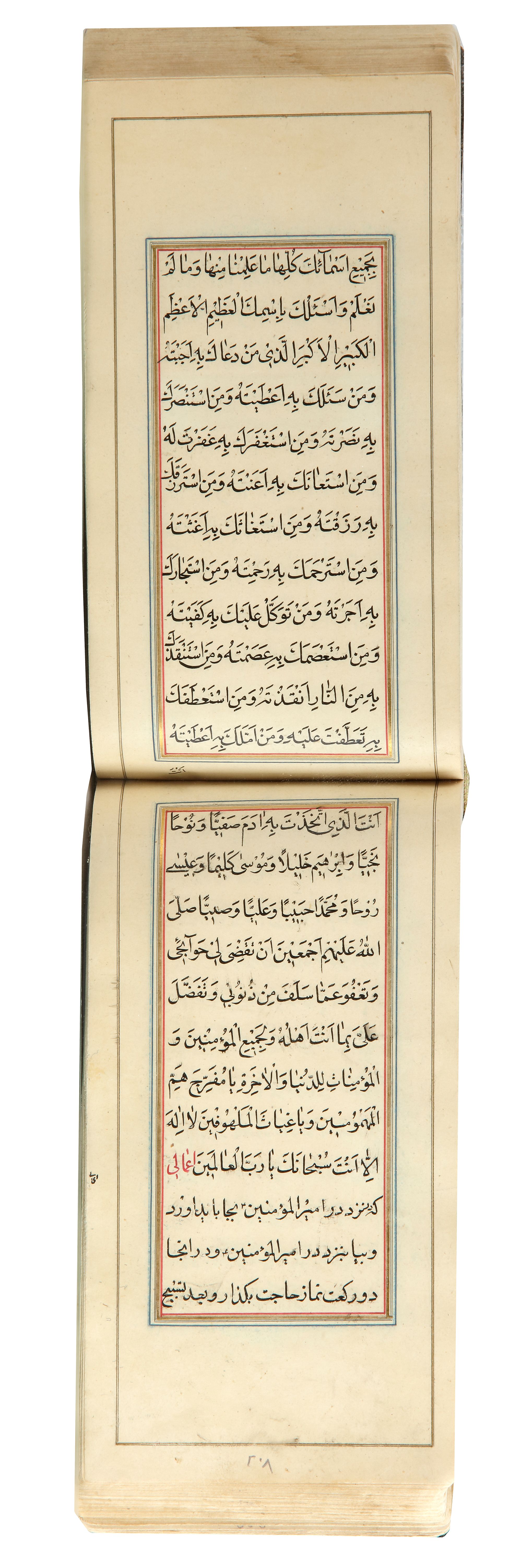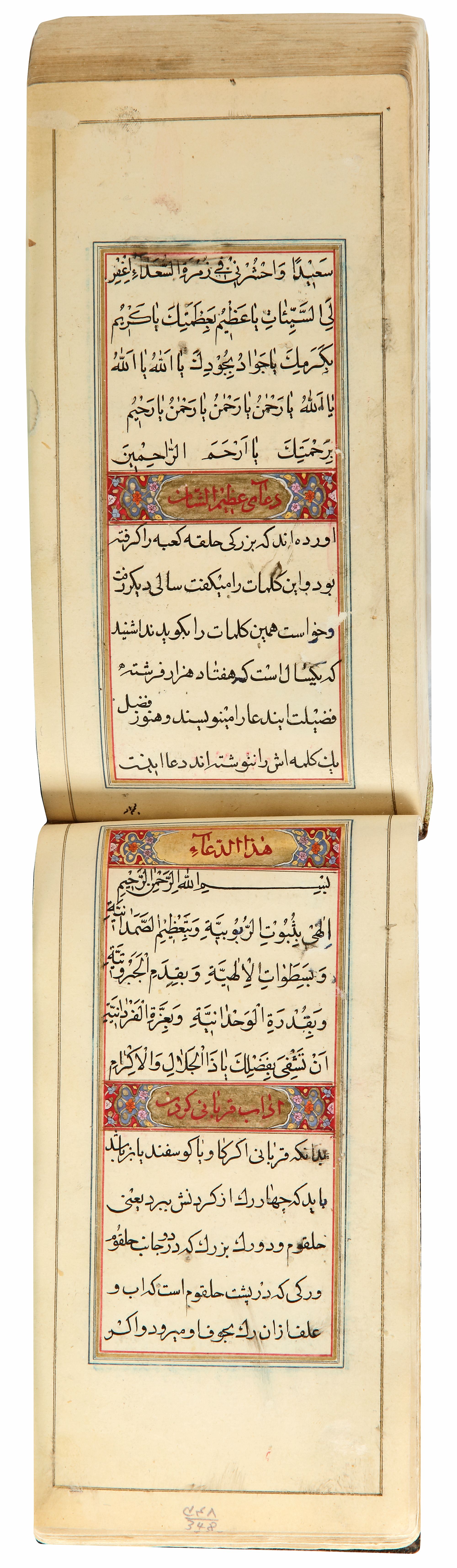 Arabic manuscript on paper, 194 leaves, plus one fly leaf, each folio with 12 lines of neat black naskh, important words and phrases picked out in red, headings in red within gold and polychrome illuminated cartouches, text panels outlined in gold and polychrome, gold outer rules, opening bifolio with gold and polychrome illuminated header and borders, fly-leaf with copious owner's notes, in soft brown morocco with stamped central medallion and borders, maroon Morocco doublures. Folio 16.7 by 8.6 cm.