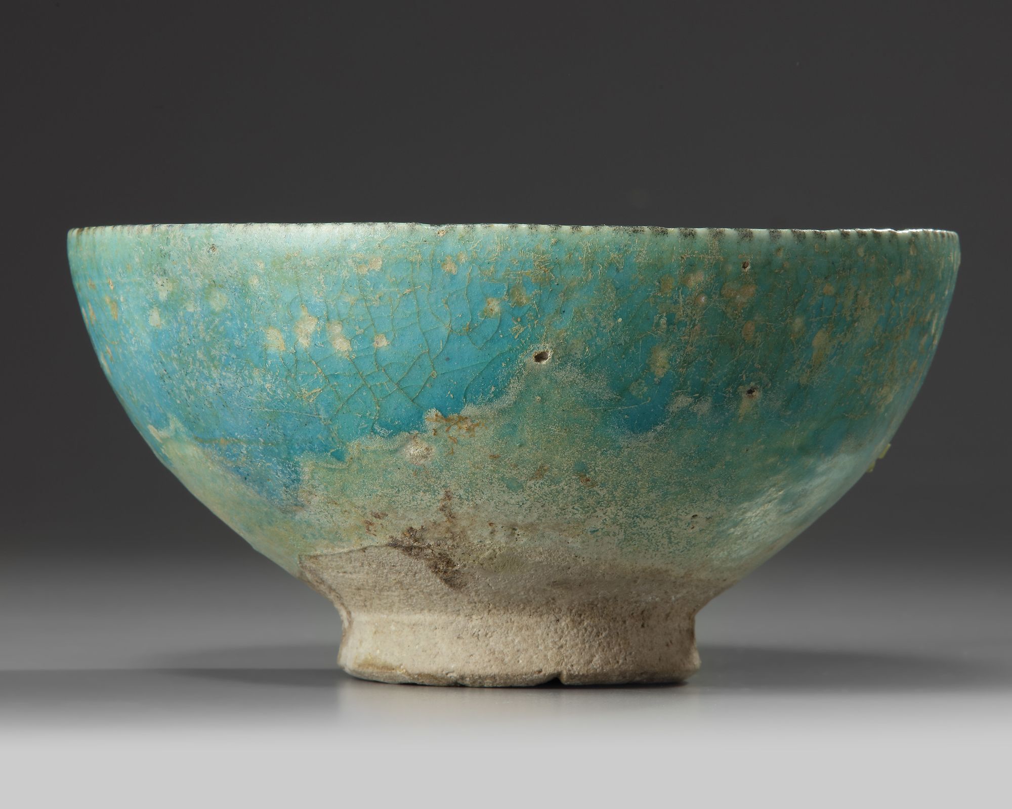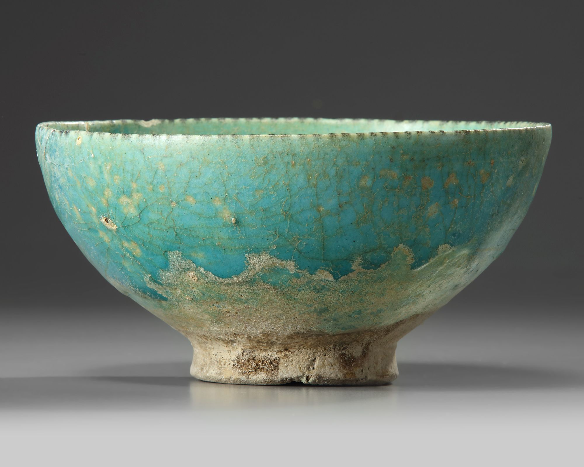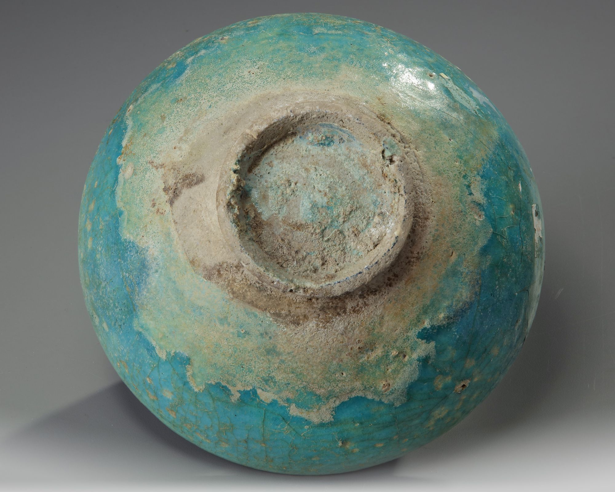An Islamic turquoise glazed bowl, on straight unglazed foot ring and conical sides, covered all in a green turquoise glaze.