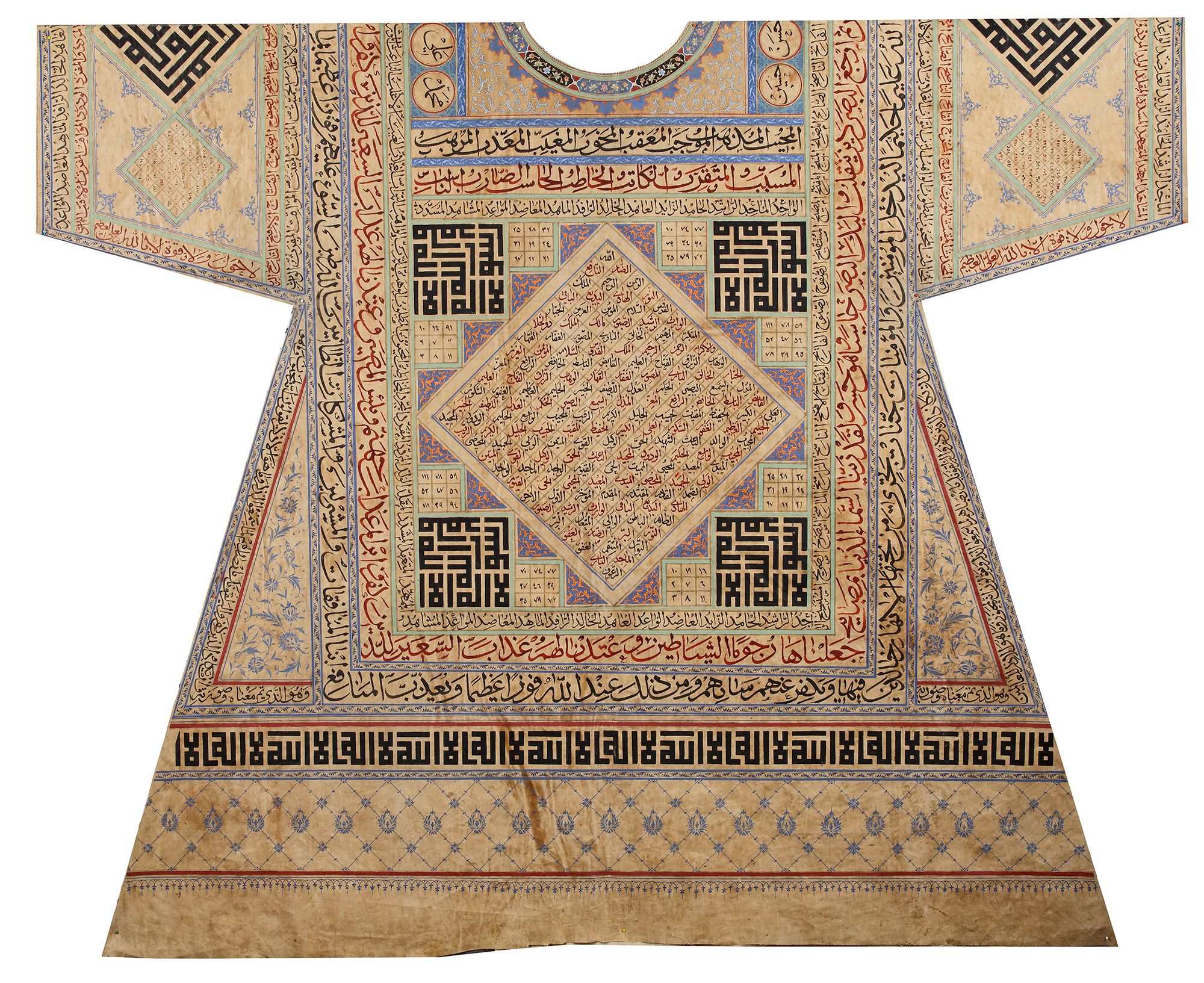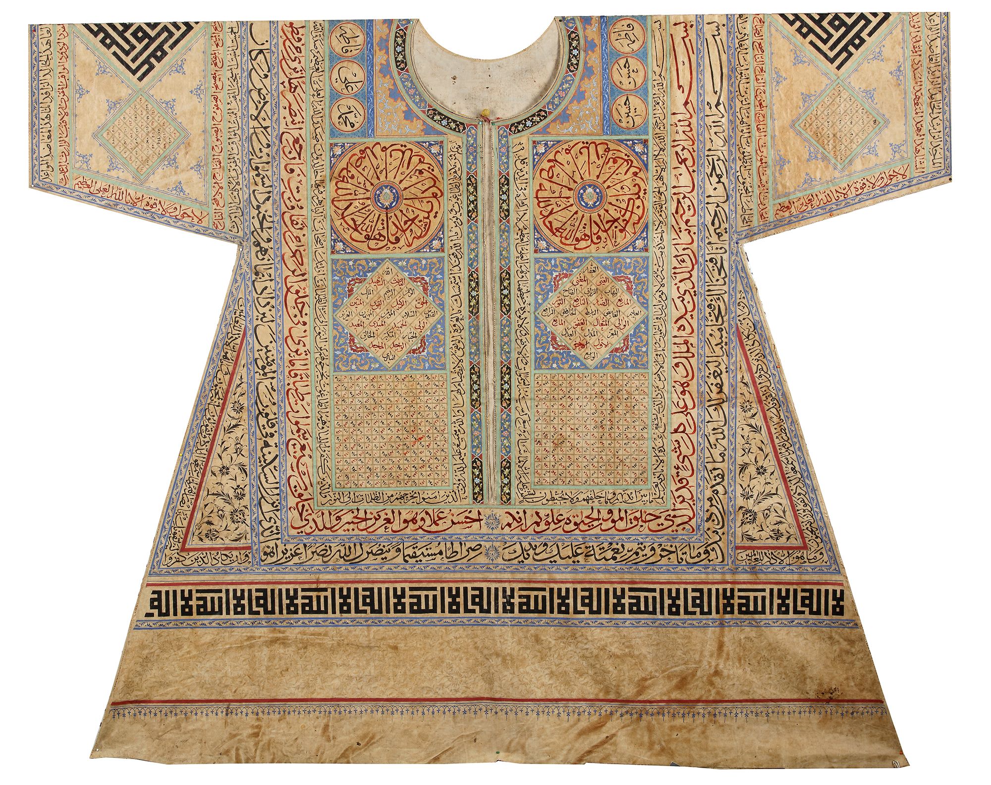 A shirt (jama) covered with text written in naskh, thuluth and Kufic scripts, in assorted colors, arranged in numerous panels, roundels, cartouches, cypress tree forms.