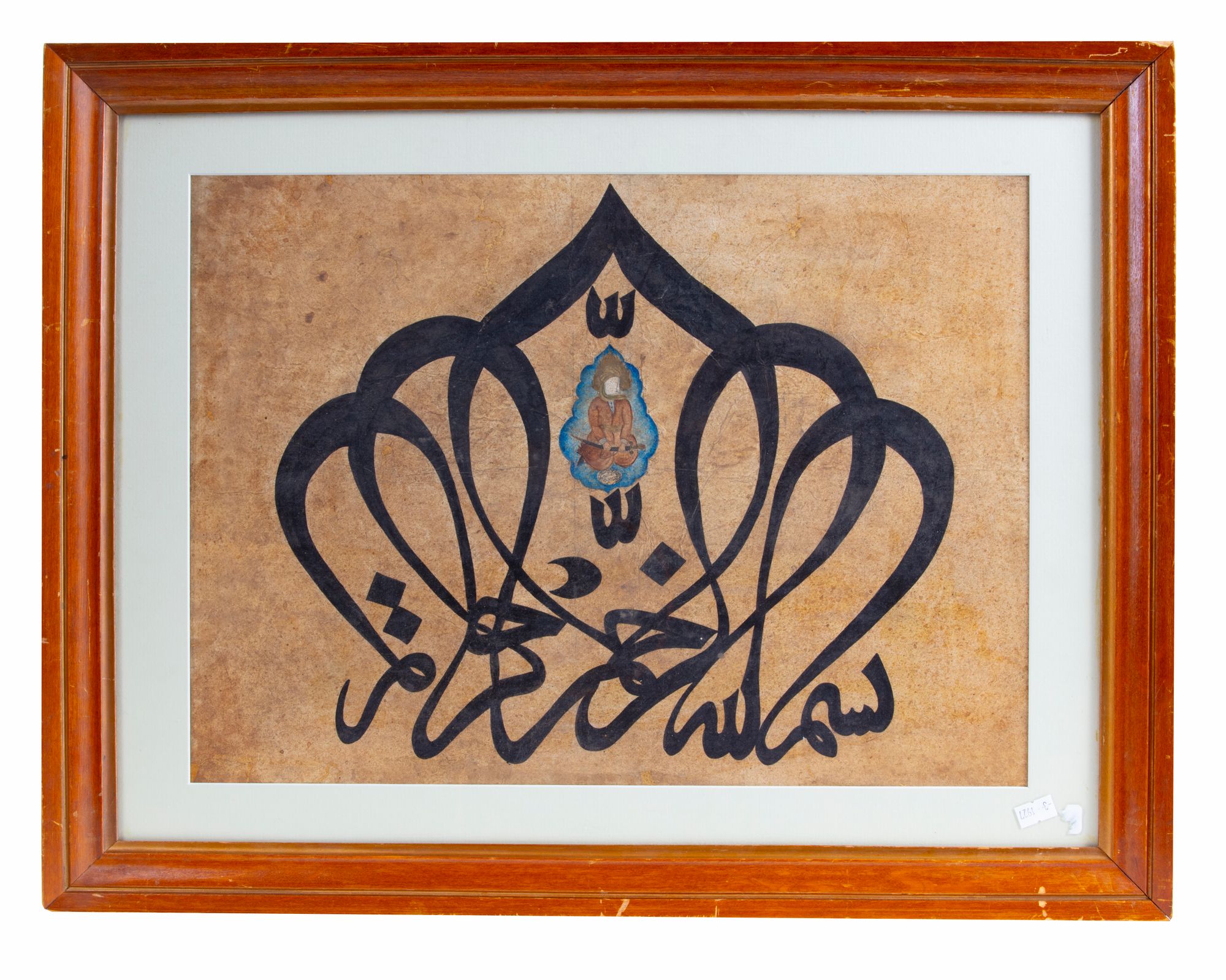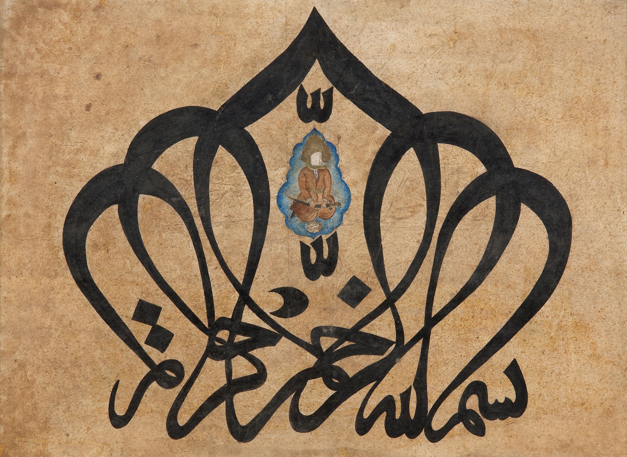 Manuscript on paper, calligraphed in black ink in a large ornamental thuluth, the stems of the nûn of rahmân and 'rahîm forming an arch in which is represented the Imam 'Ali with his face covered.