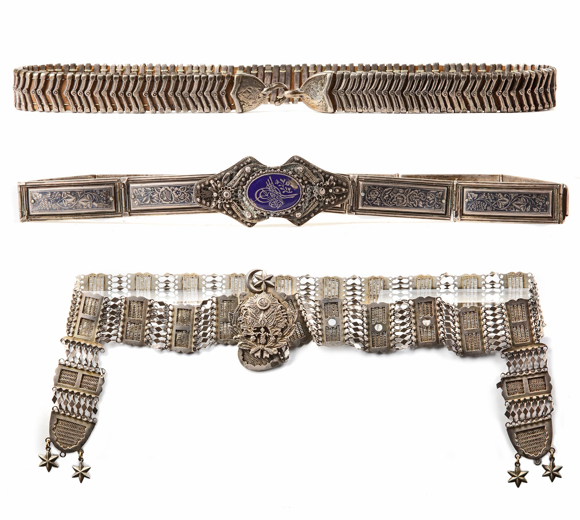 The first silver belt of multiple segments with a floral decorated buckle. The second composed of 12 rectangular plates, of silver and niello with chiselled decoration of churches, trophies and tughra motifs. The bow-shaped loop is decorated with a central tughra on a floral background. The third an Ottoman silver belt bearing two tughras whose one of Sultan Abdulaziz I The first belt 87 cm., the second 78 cm., the third 82 cm.