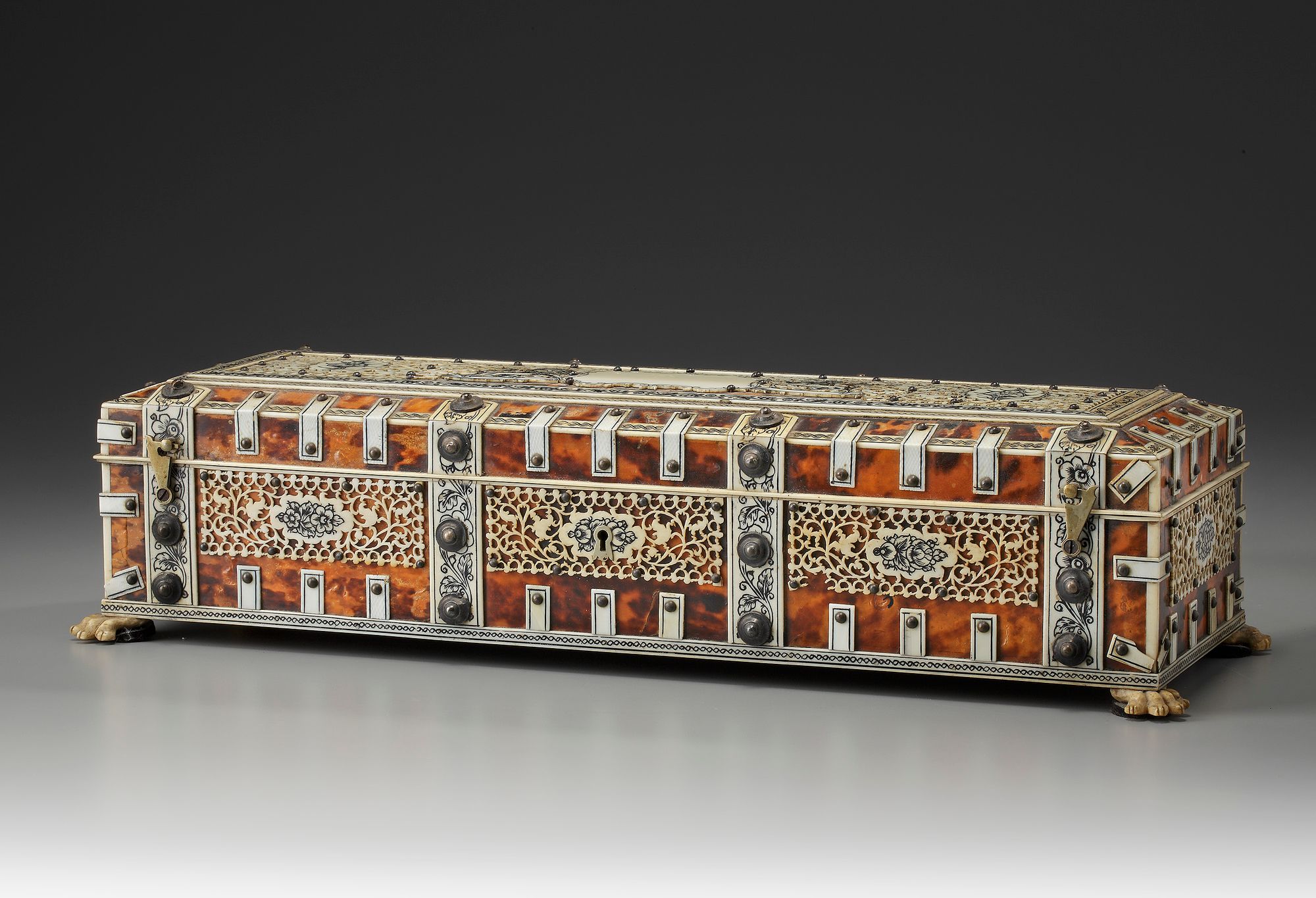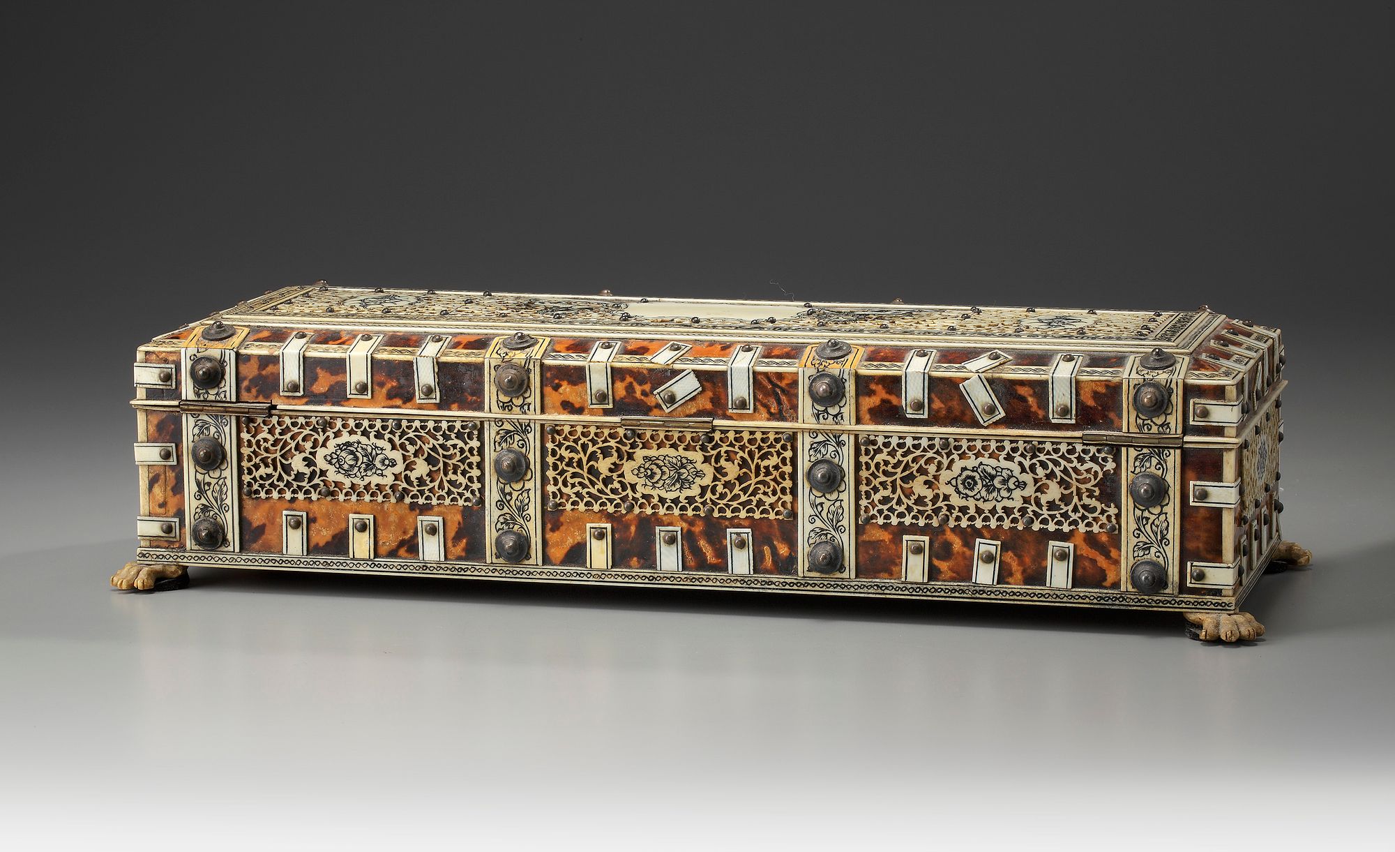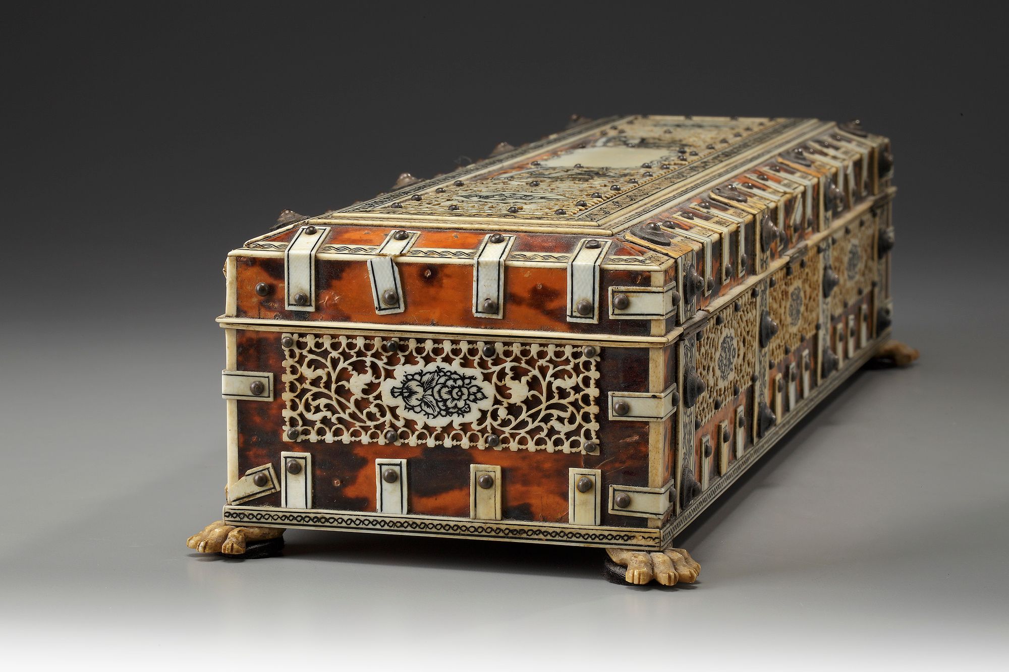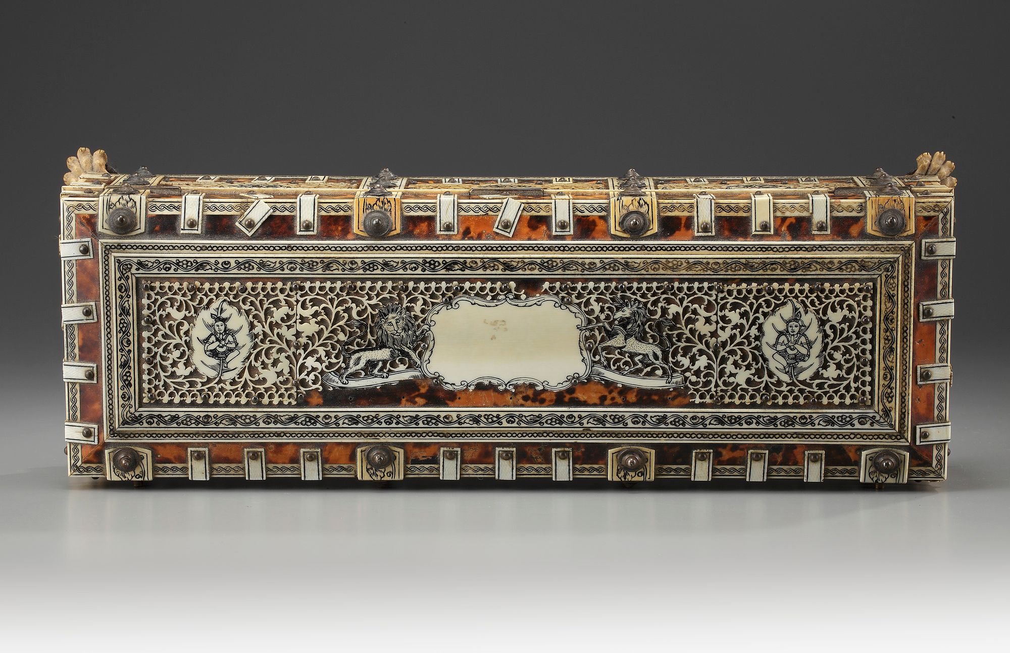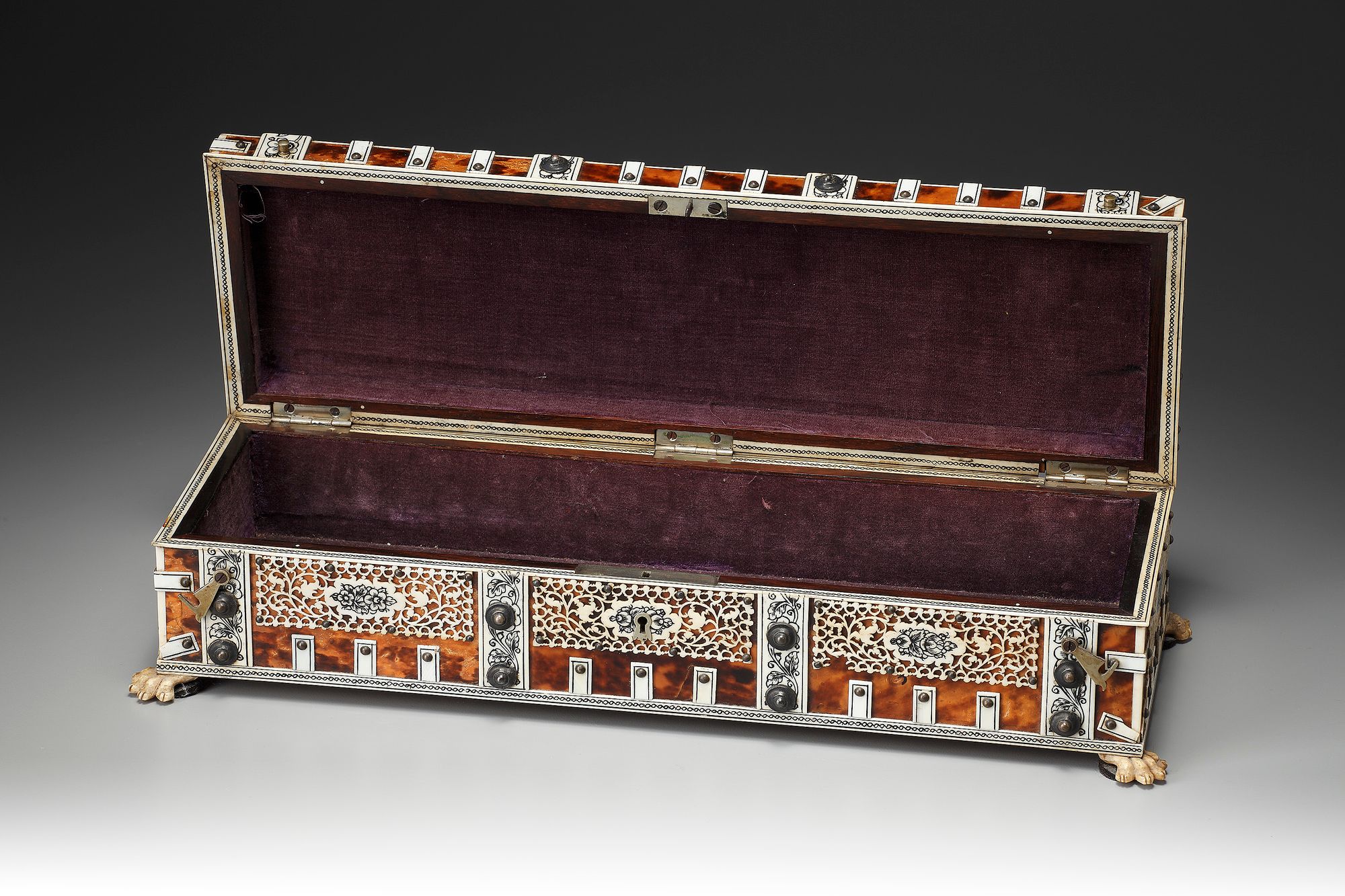 Overall decorated with tortoise shell, ivory nailed panels and open worked ivory decoration; blank ivory cartouche for a monogram centrally applied to the top of the lid. The interior decorated with velvet, original key, the whole on ivory lion feet.