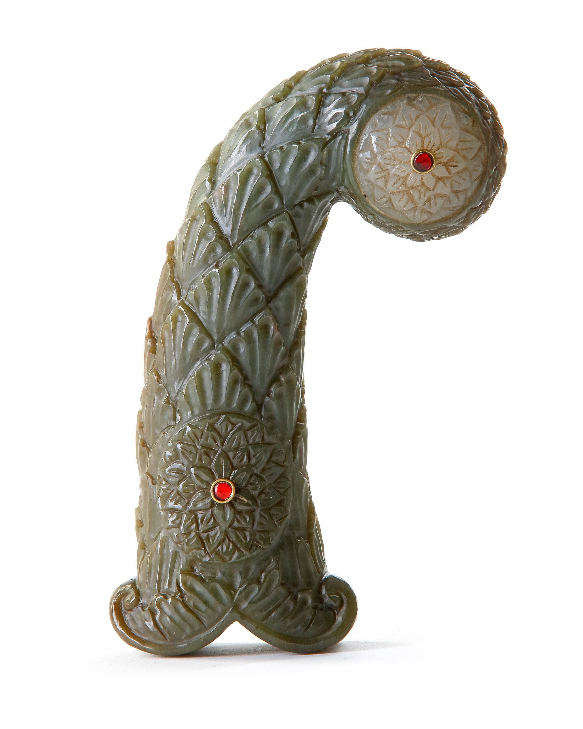 The exterior finely carved in relief with acanthus leaf patterns, with stylized chrysanthemum flowers with inset ruby centers to each end, the two flowers to each side of the curled up bottom in white jade and silver respectively, contrasting with the overall celadon jade surface. 13 cm.