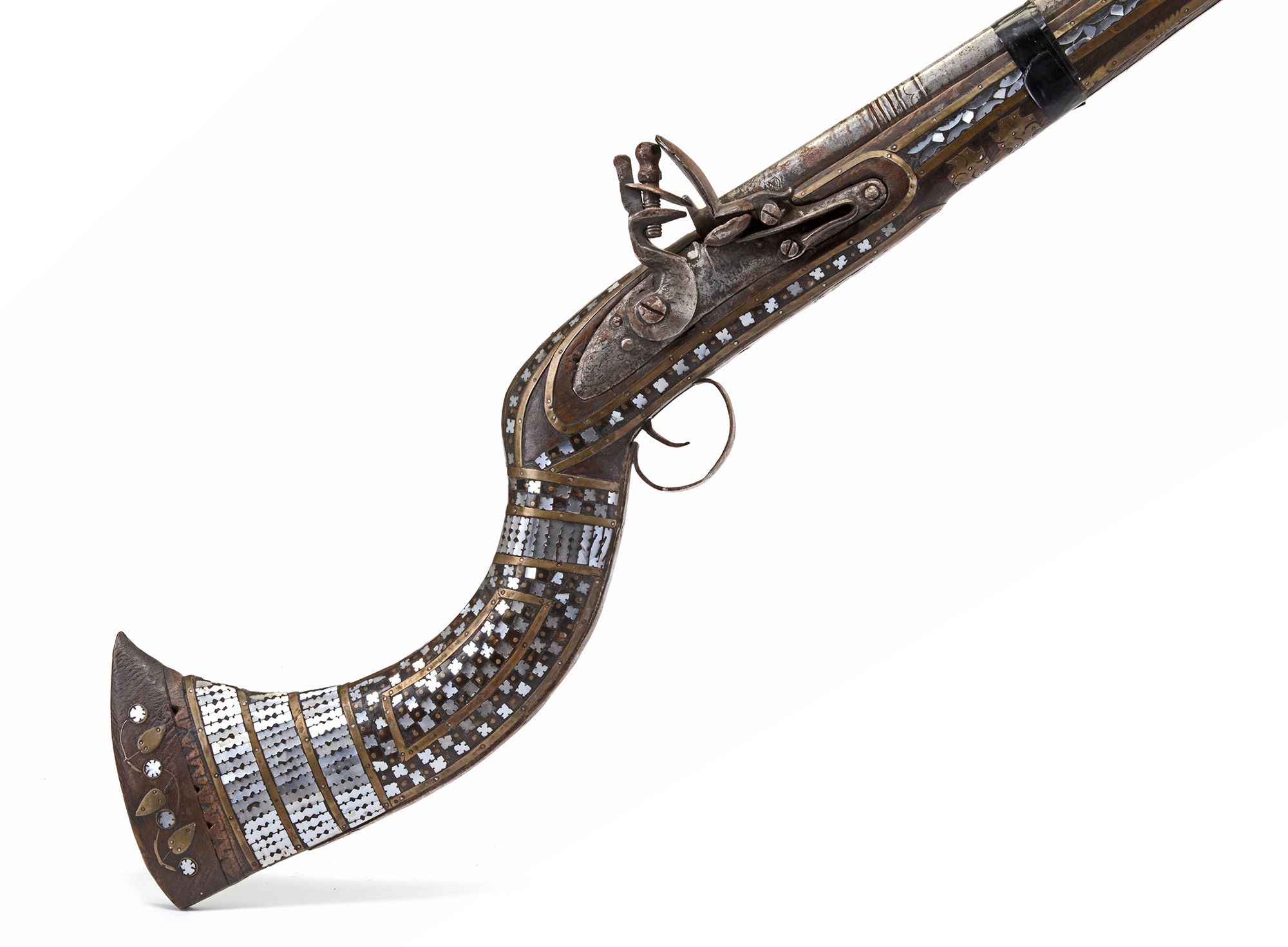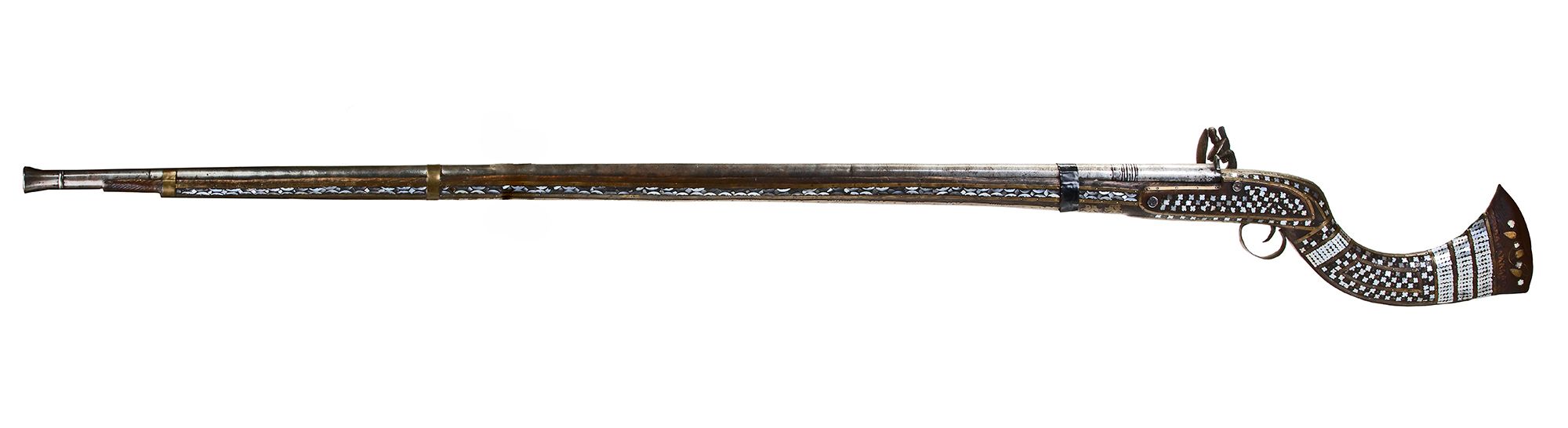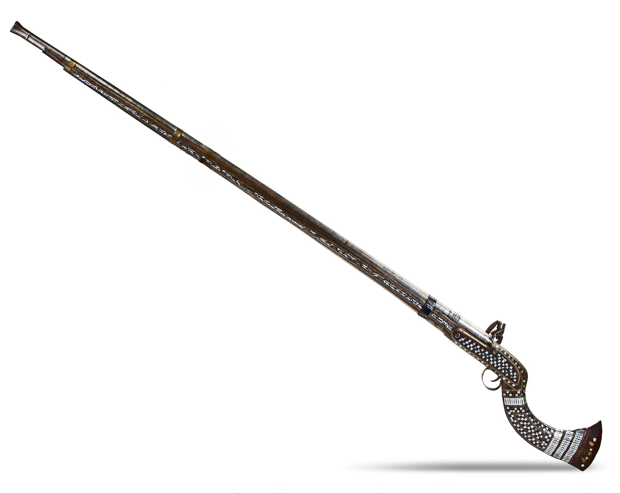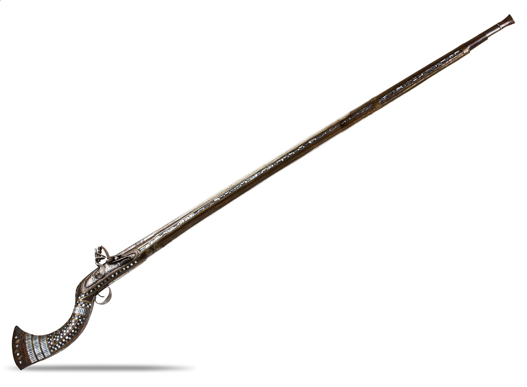 An Ottoman mother-of-pearl inlaid wooden and steel gun sighted barrel retained by three metal embossed barrel-bands, engraved lock, characteristic engraved iron-plated stock heightened with mother-of-pearl panel.