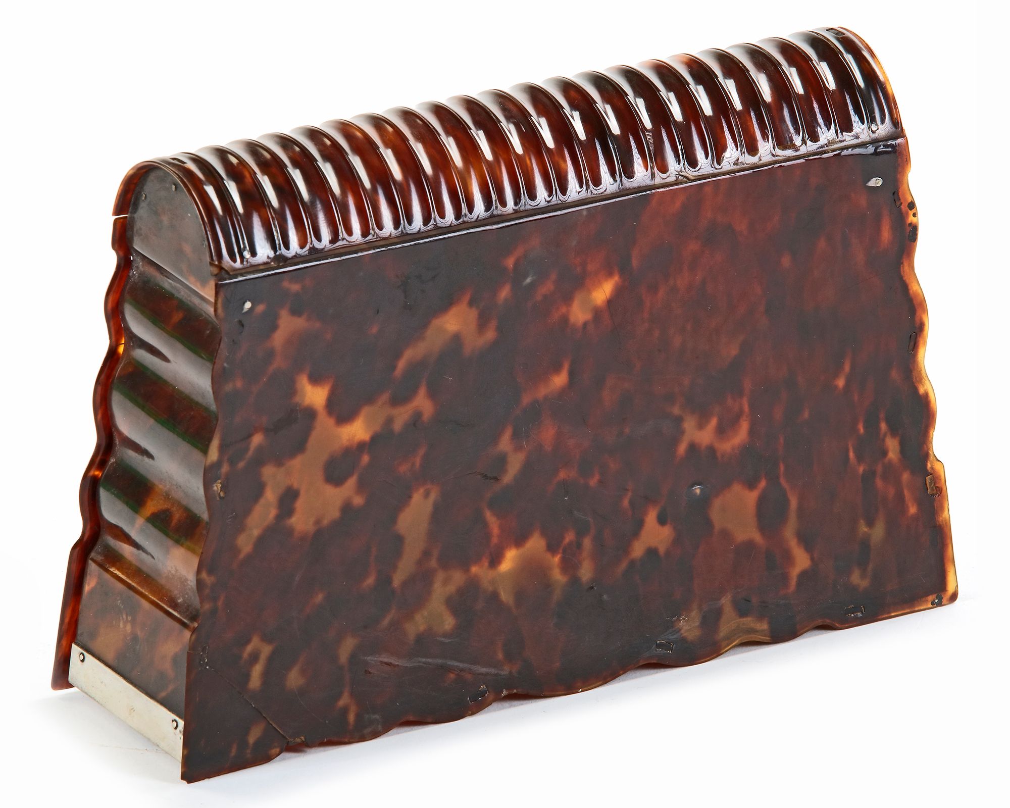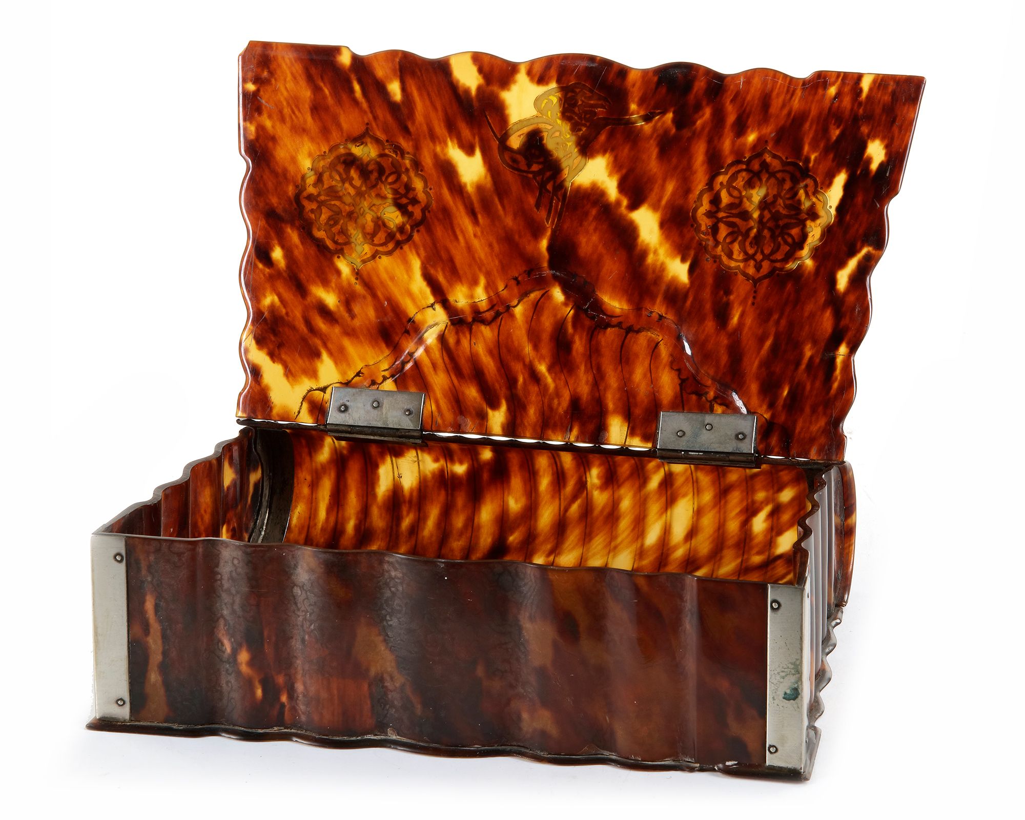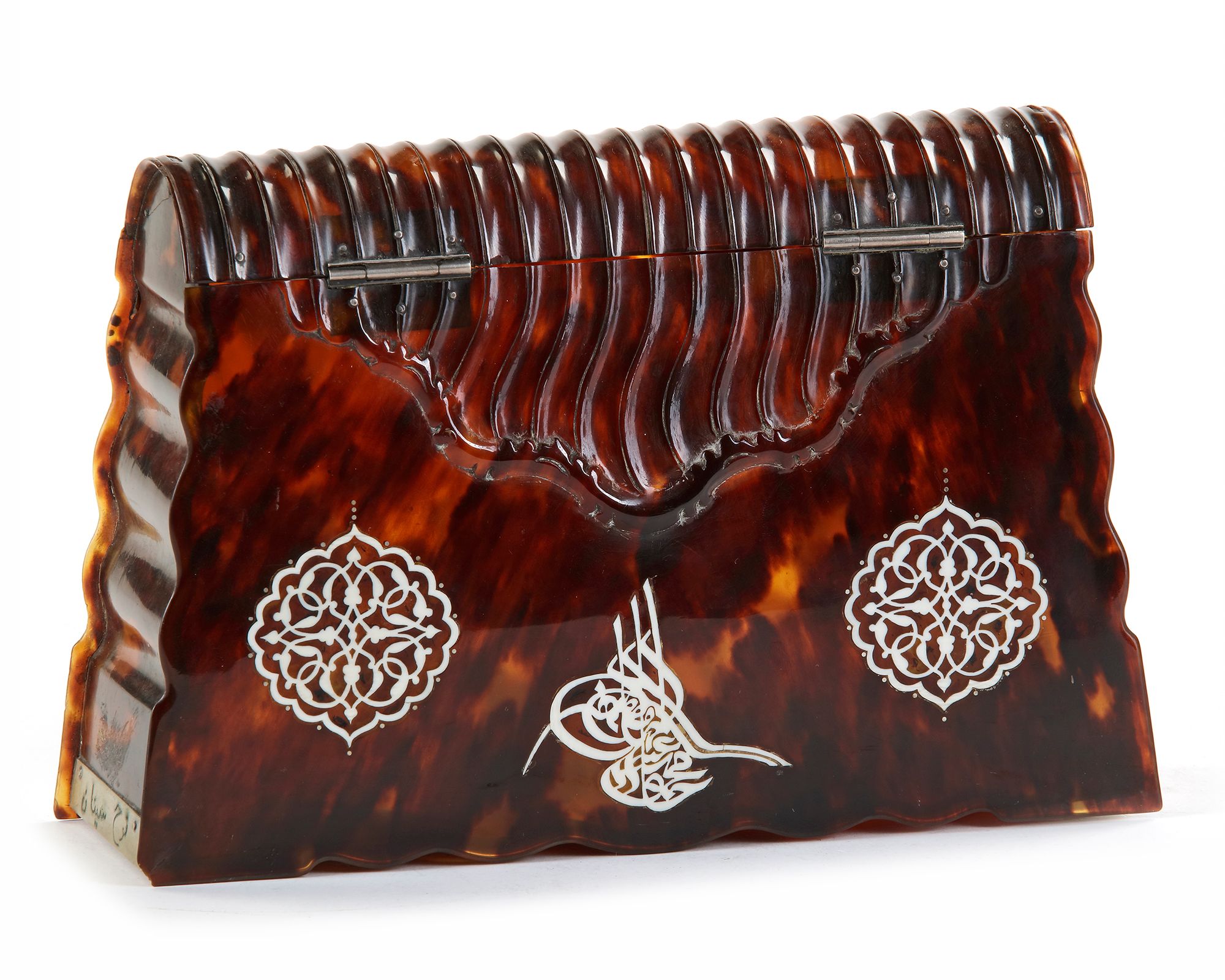 Tortoiseshell handbag with inlaid tughra. Tapered tortoiseshell pocket with wavy sides and rivets with riveted nickel silver fittings and hinges. On the side lid in ivory inlaid tughra of Sultan Mahmud I (reg. 1730-54) and two ornament cartridges. Fitting on the underside with engraved Arabic inscription. 21 by 14 by 6 cm.