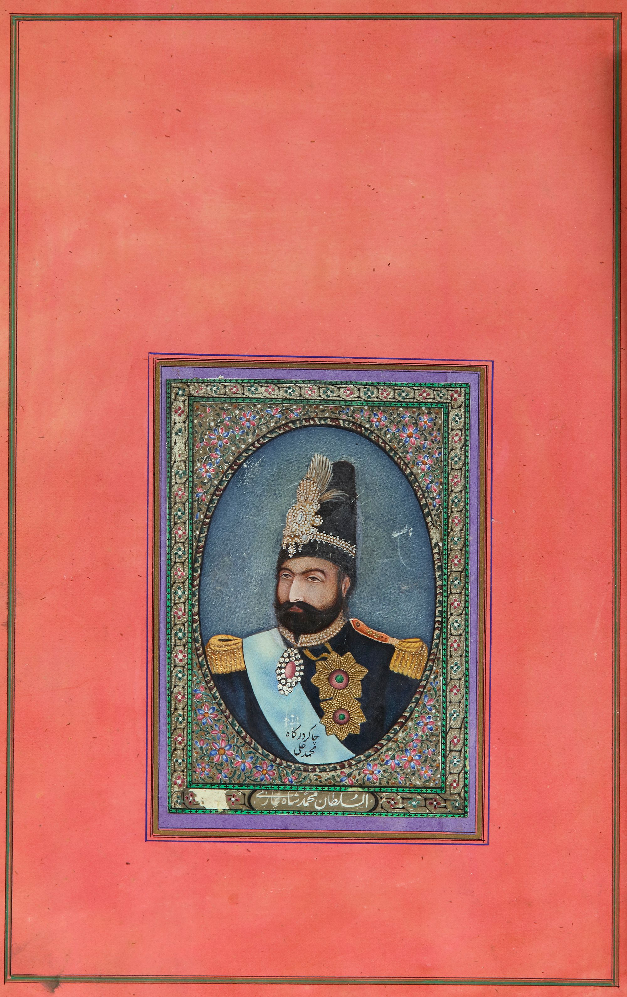Gouache pigments heightened with gold on paper, depicting a roundel enclosing a half portrait of Mohammad Shah, with rounded and full face, long mustache attached to a short beard, wearing a luxurious military unifom of blue silk and decorated at the collar and on the shoulders, with two diamond-encrusted insignia pinned to his breast, the shah wears a royal blue scarf with a long black hat decorated with precious ornaments. Further stylized onwith red and blue floral scrolls on gilt ground, all ruled in gold and polychrome borders. Miniature: 14 by 10 cm. Folio: 31.5 by 21 cm.