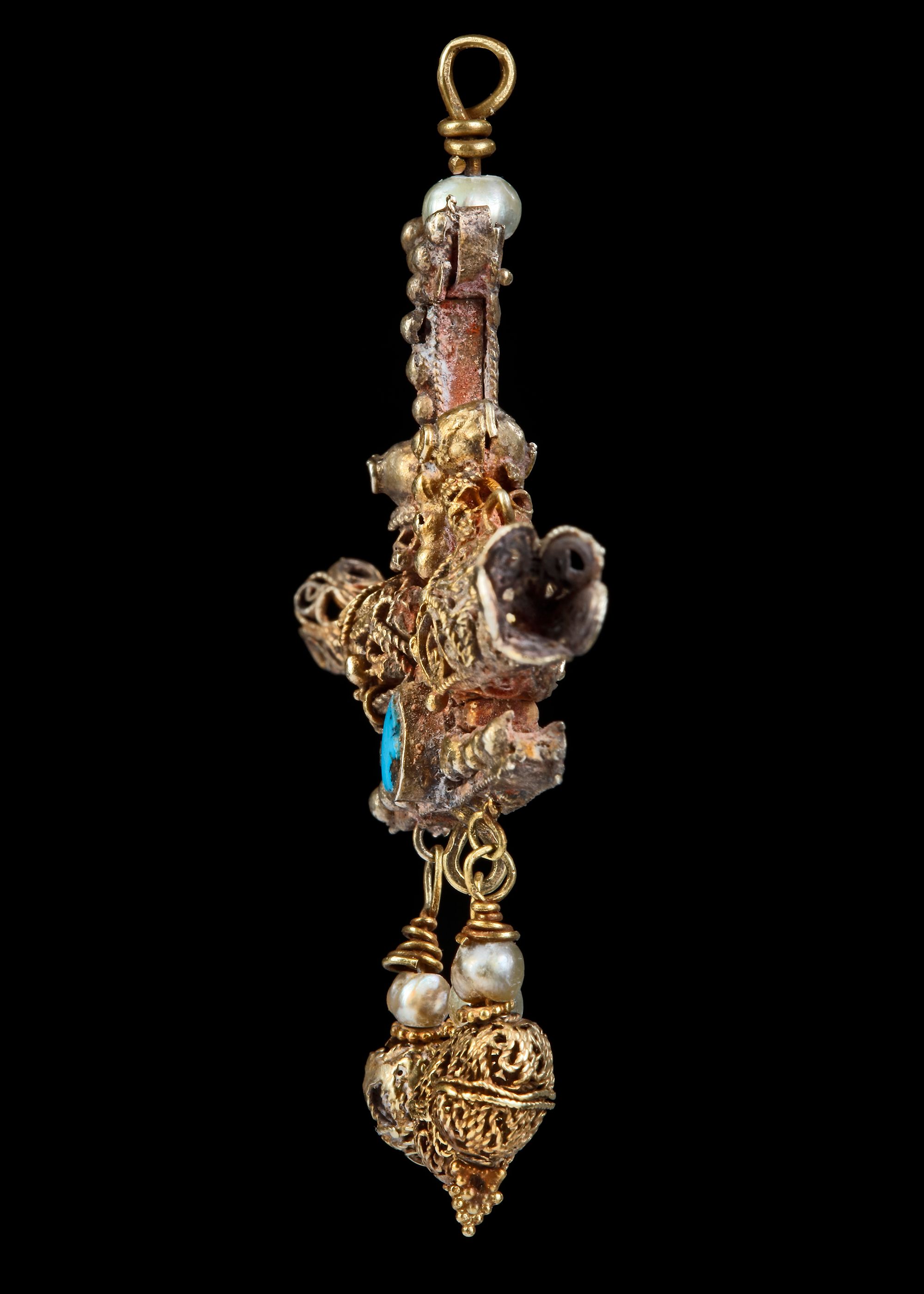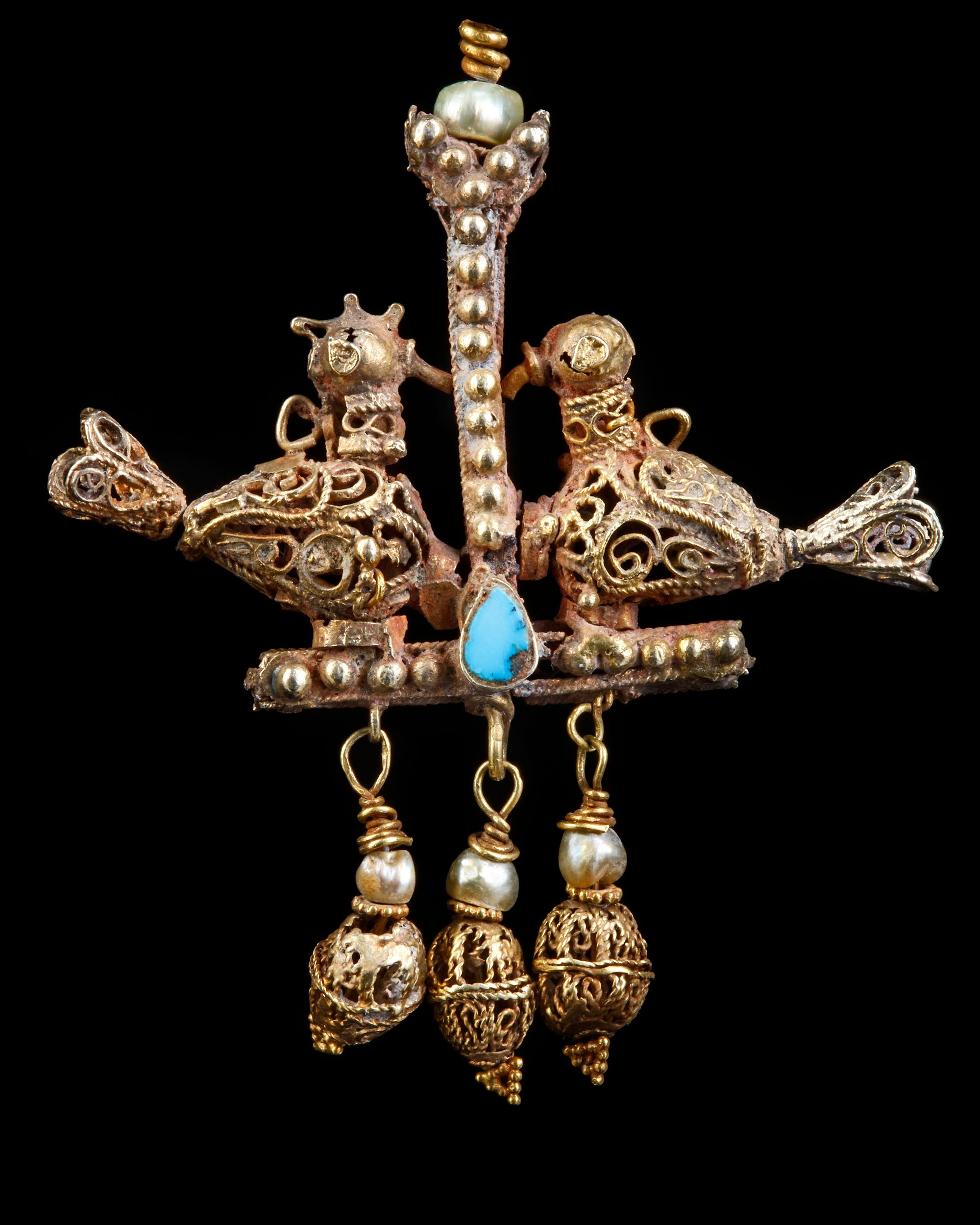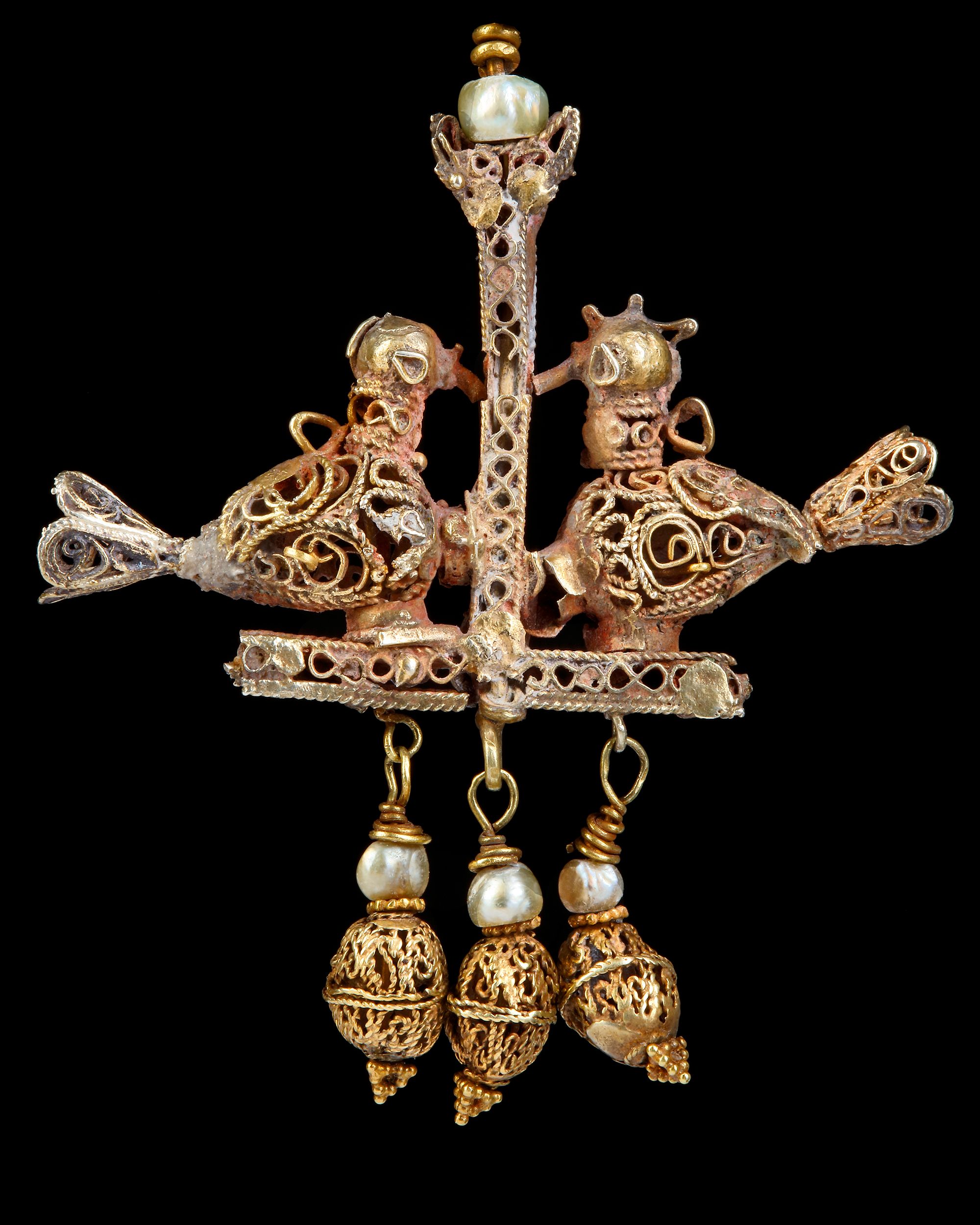 Comprising a central inverted T-shape element of box construction, the face with figure-of-eight wire decoration, flanked on each side with confronted birds formed of scrolling wirework with applied similar wings and conical tails, one with a pronounced crest, three pendant beads of similar workmanship below with seed-pearls, a similar larger seed-pearl and suspension loop above.