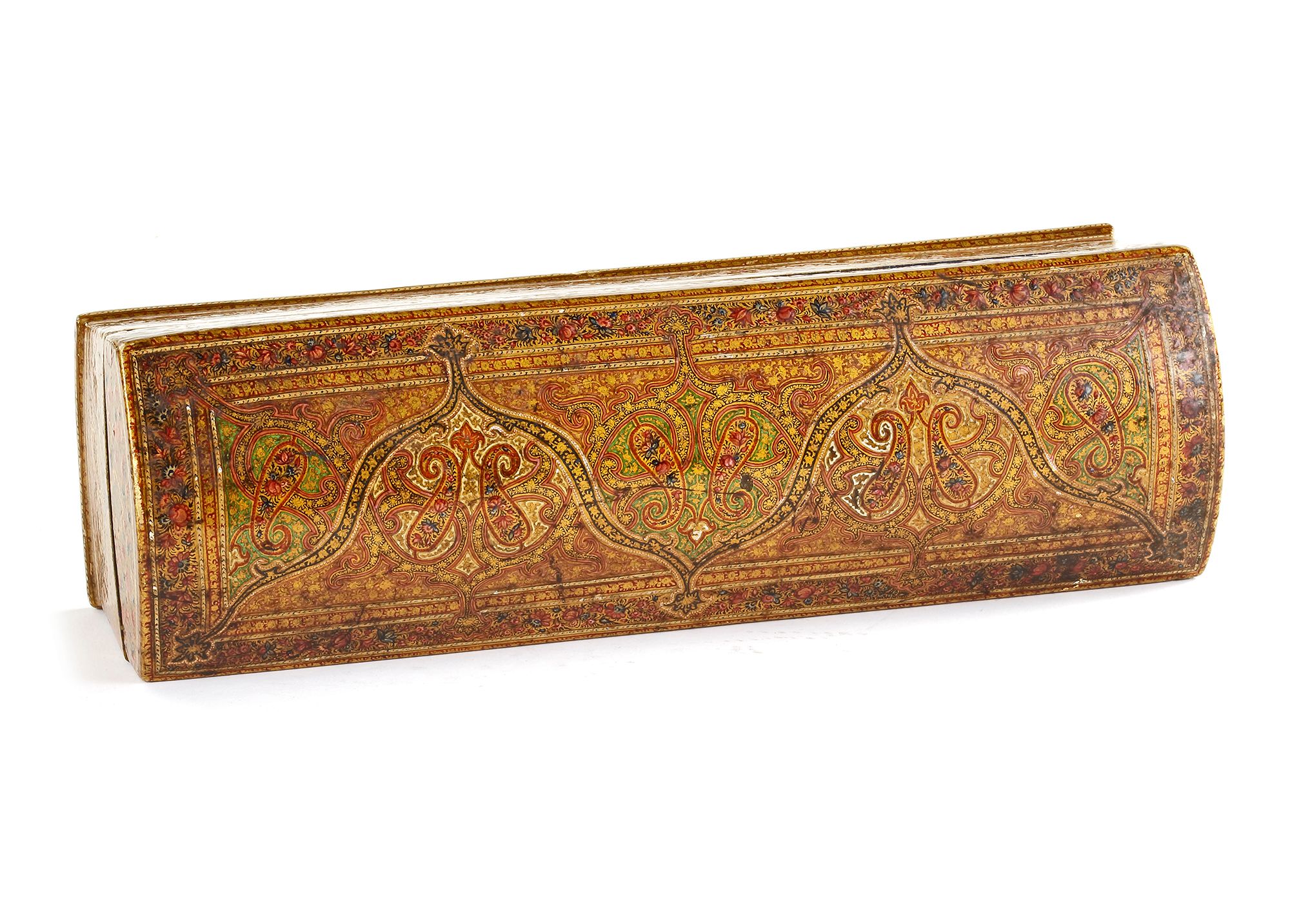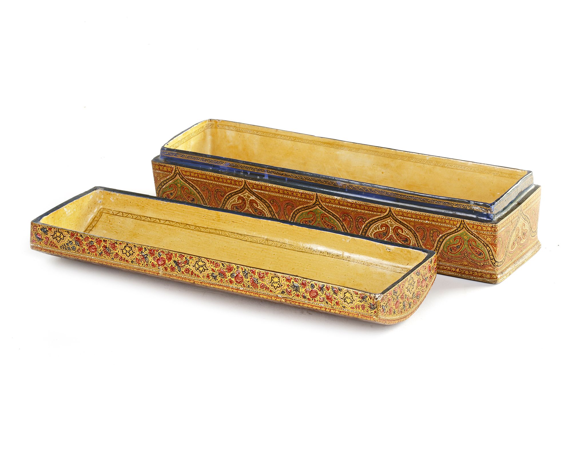 Of rectangular form, heavily painted in polychrome and gold with botehs enclosing flower heads and foliage. 7.5 by 26 by 7.5 cm.