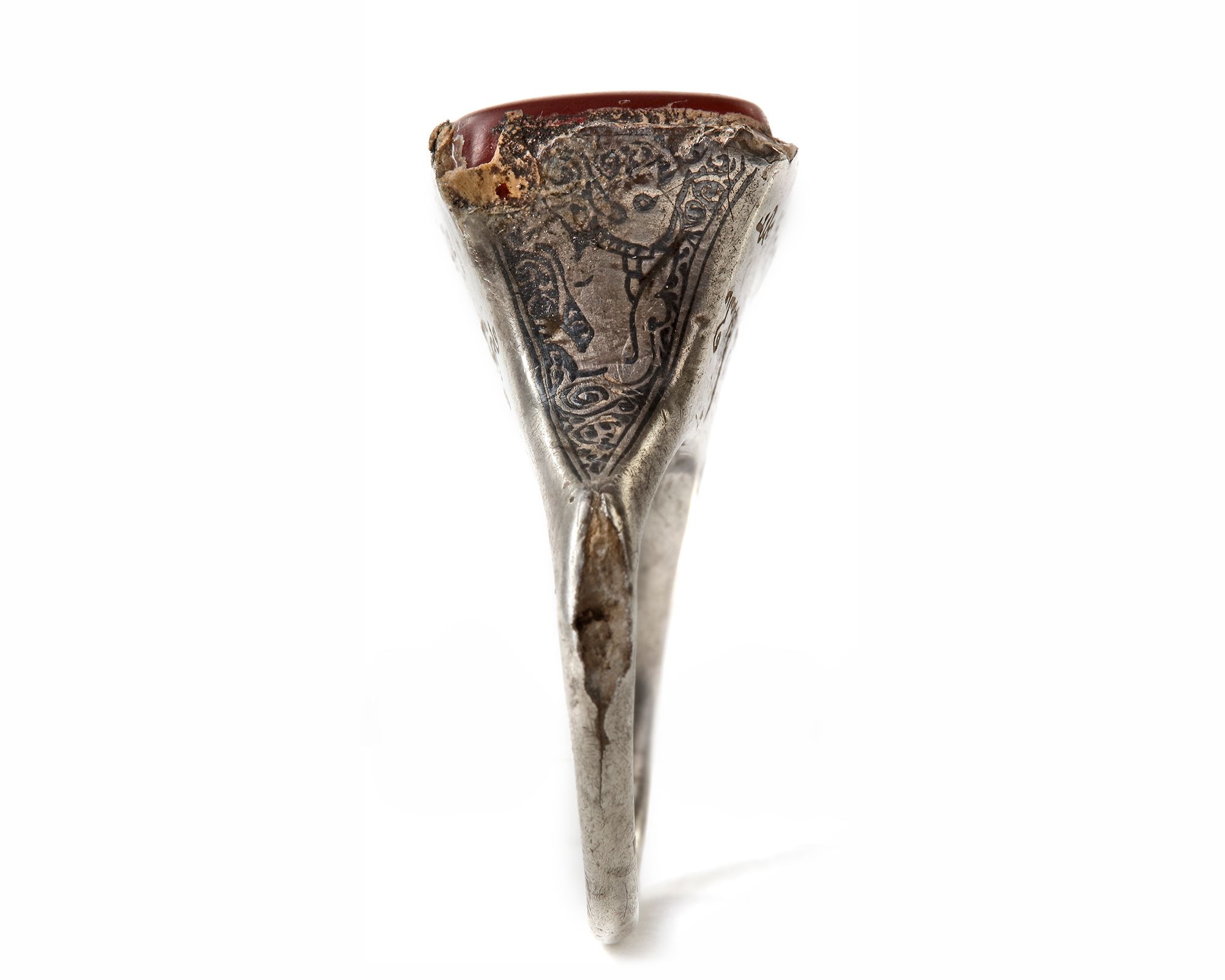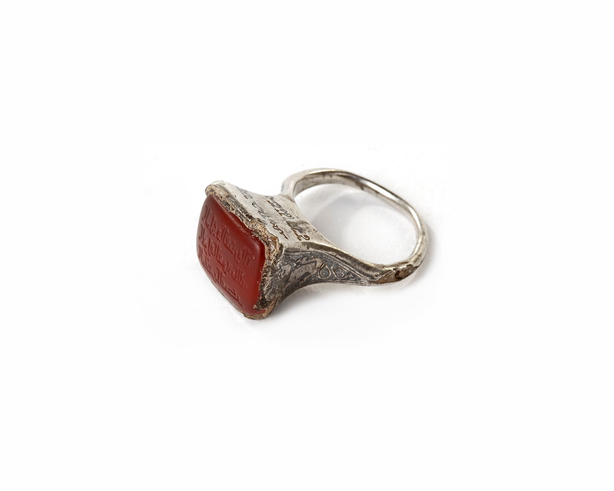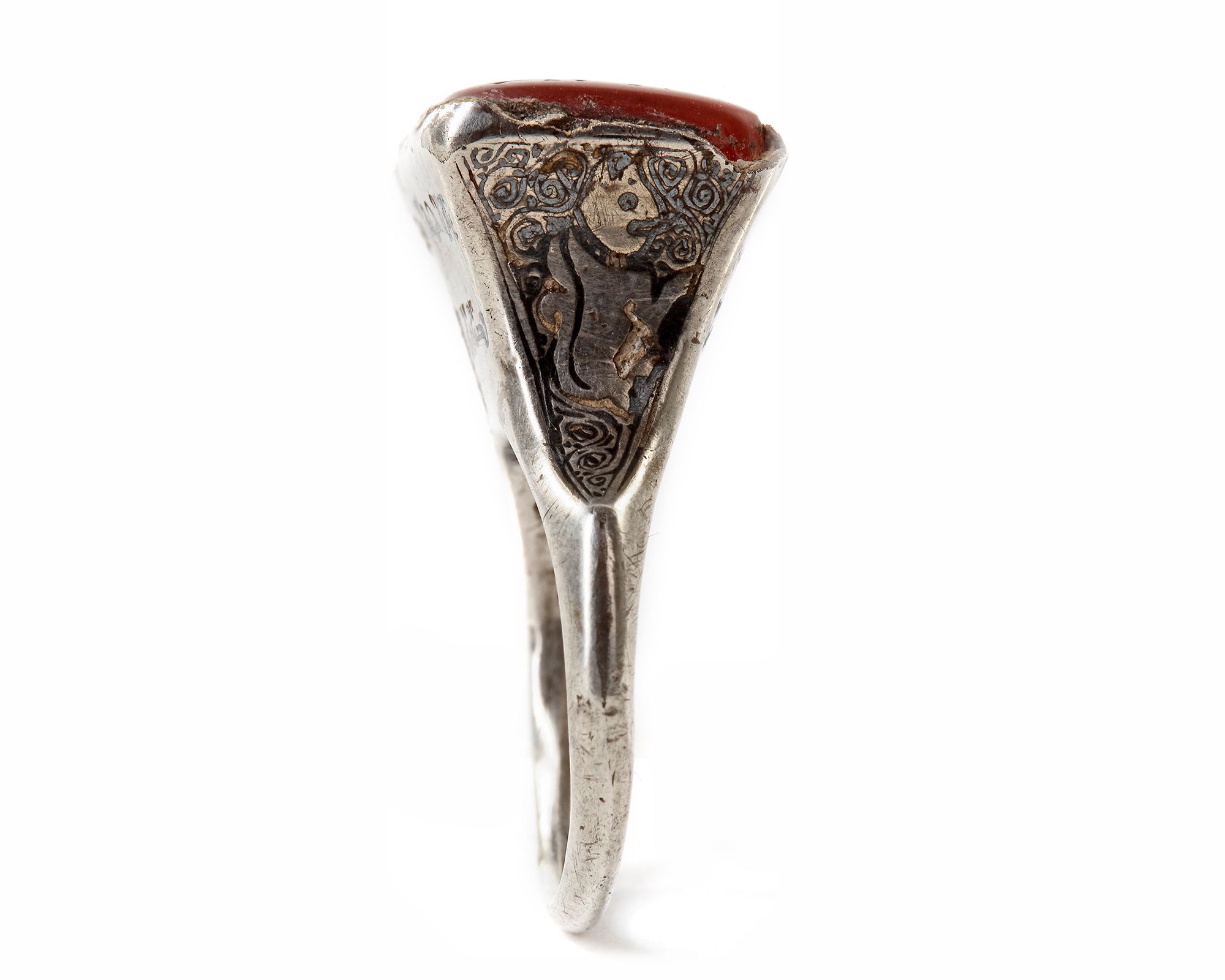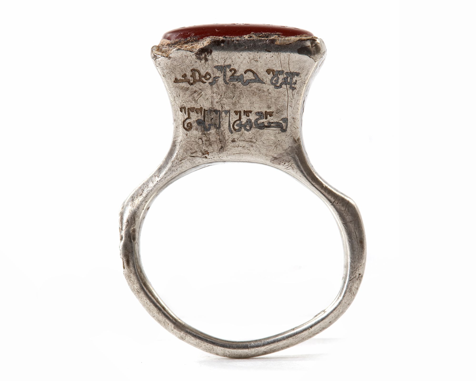 Carnelian, rectangular, flat top with bevelled sides, the stone with a three line inscription in Kufic. Both sides with nielloed Kufic script, the shoulders engraved and inlaid with lions The inscriptions: ‘almulk walqudrat allah alhawl walquat allah alzafr bialnasr’ (with the sovereignty and competence of Allah, the power and strength, the victory is ours) Around the bezel: ‘fath min allah wanasr qarib liman yasbir’ (Victory from God is close to those who are patient) For its owner (Jahd bin muhjib) size: 2 cm.
