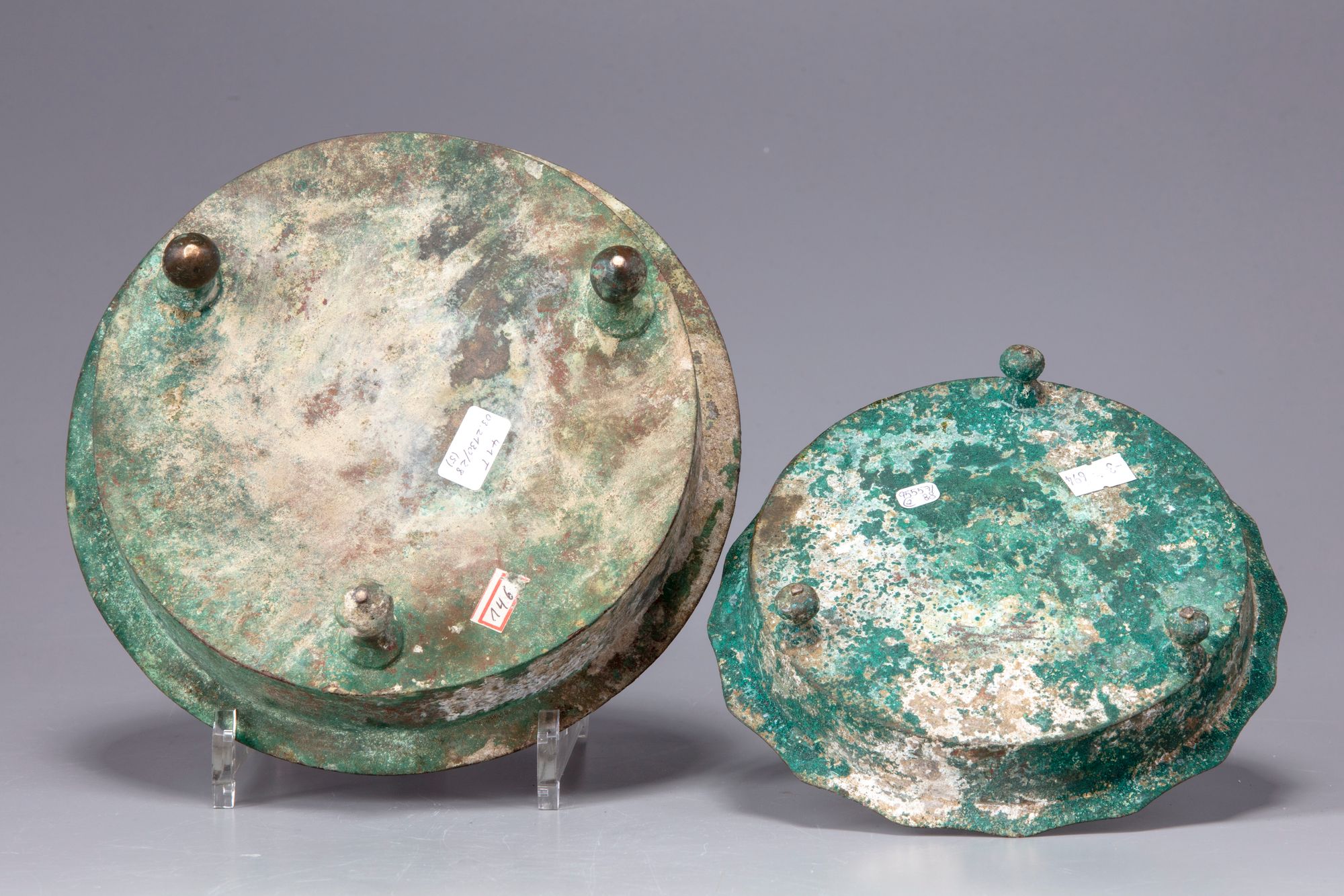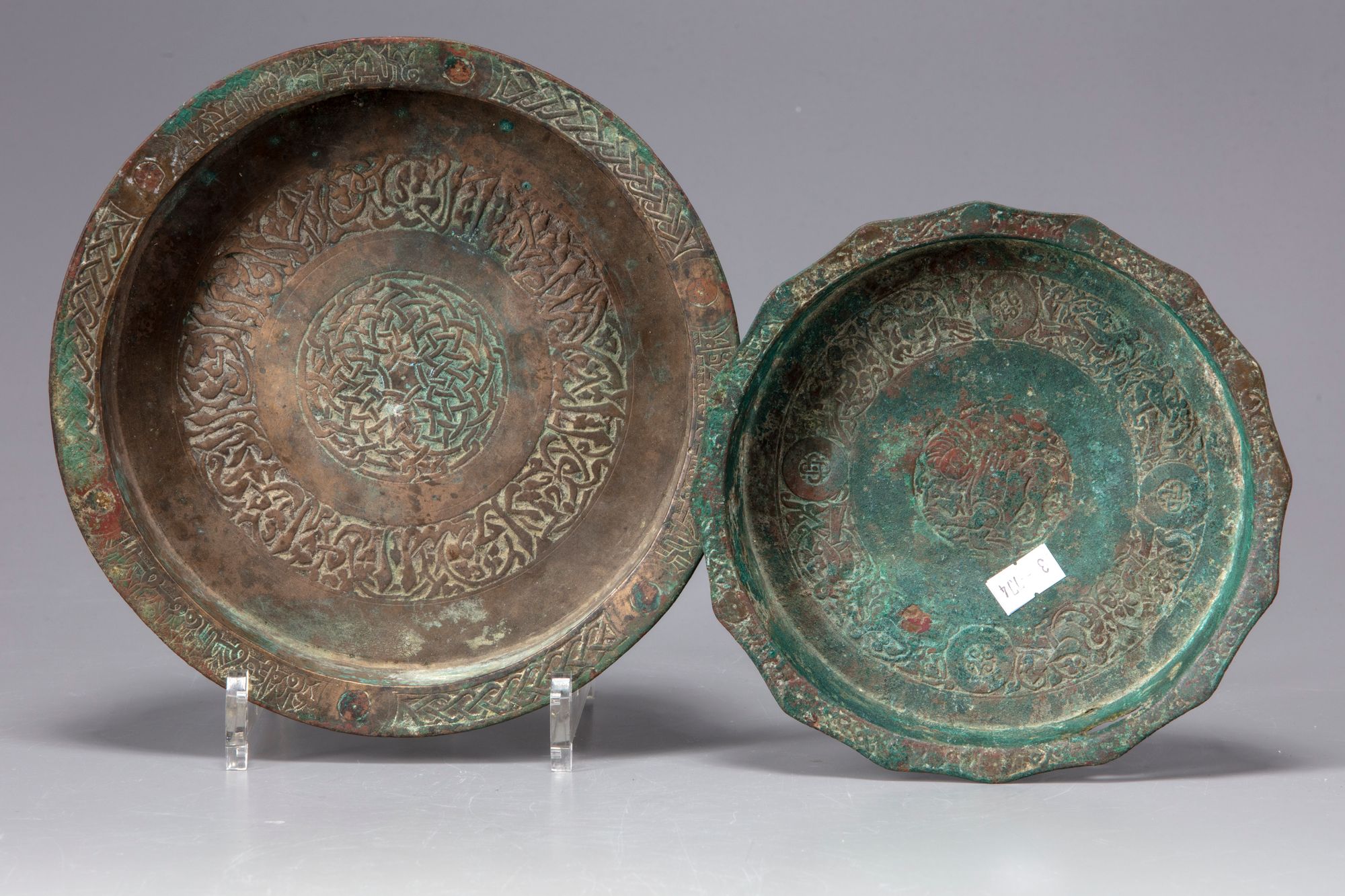 Standing on three feet with an everted lobed rim, hammered and engraved with a human face on a mythical creature, surrounded by birds and flower scrolls.