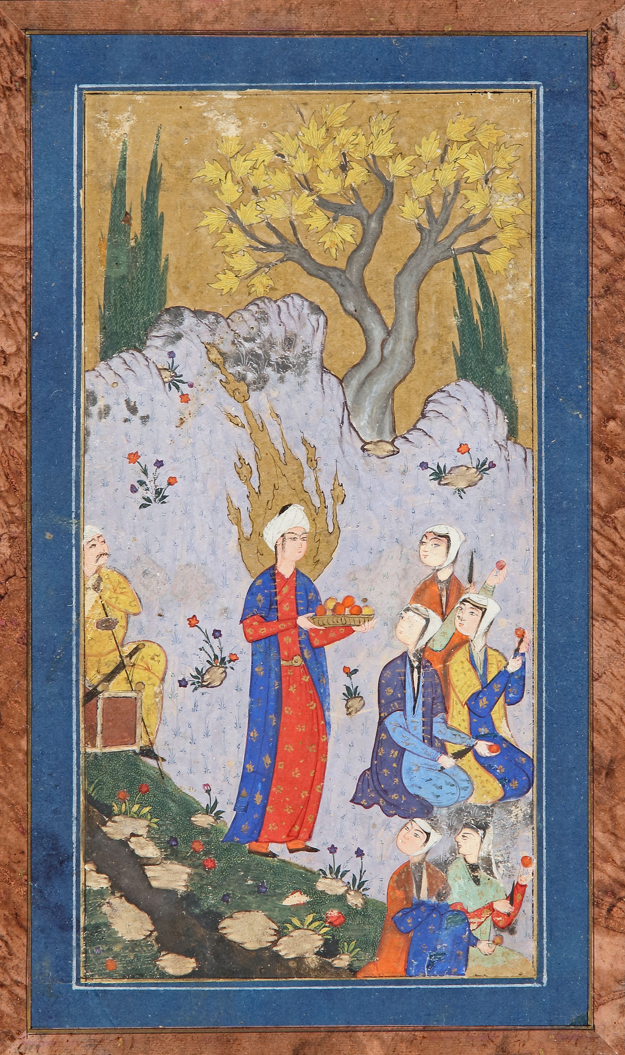 Gouache pigments heightened with gold on paper, laid down on an album page, depicting the prophet Yusuf bringing apples to Zulaikha’s friends in a landscape, ruled in gold and polychrome margins.