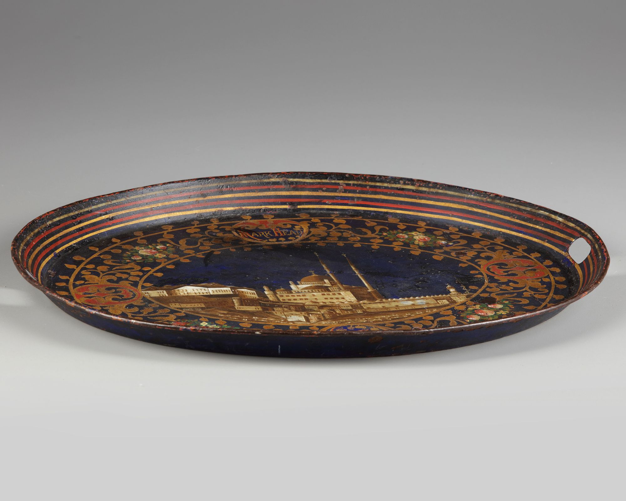 An Islamic lacquered painted metal oval shaped tray. Hand painted scene of Sultan Ahmed Mosque set within a border of gold painted floral scrolls.