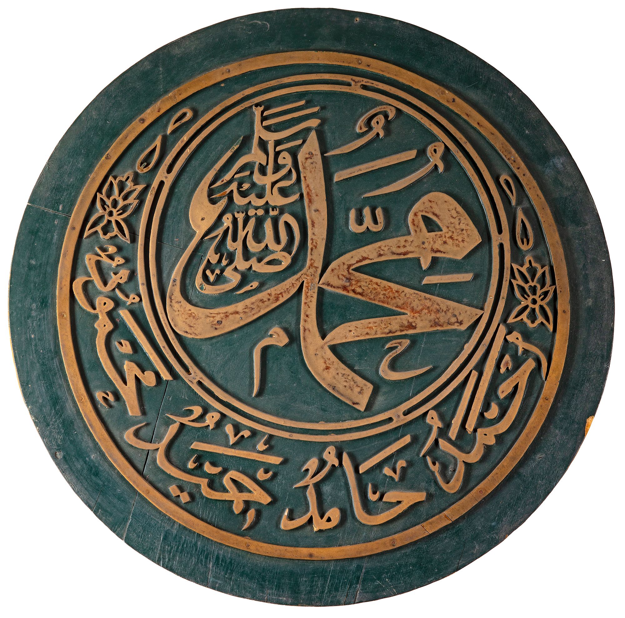 An Ottoman wooden roundel carved with thuluth inscription, gilt on a deep green ground. The roundel bear the following inscriptions: 'Muhammad, peace be upon him' above four names of the prophet.