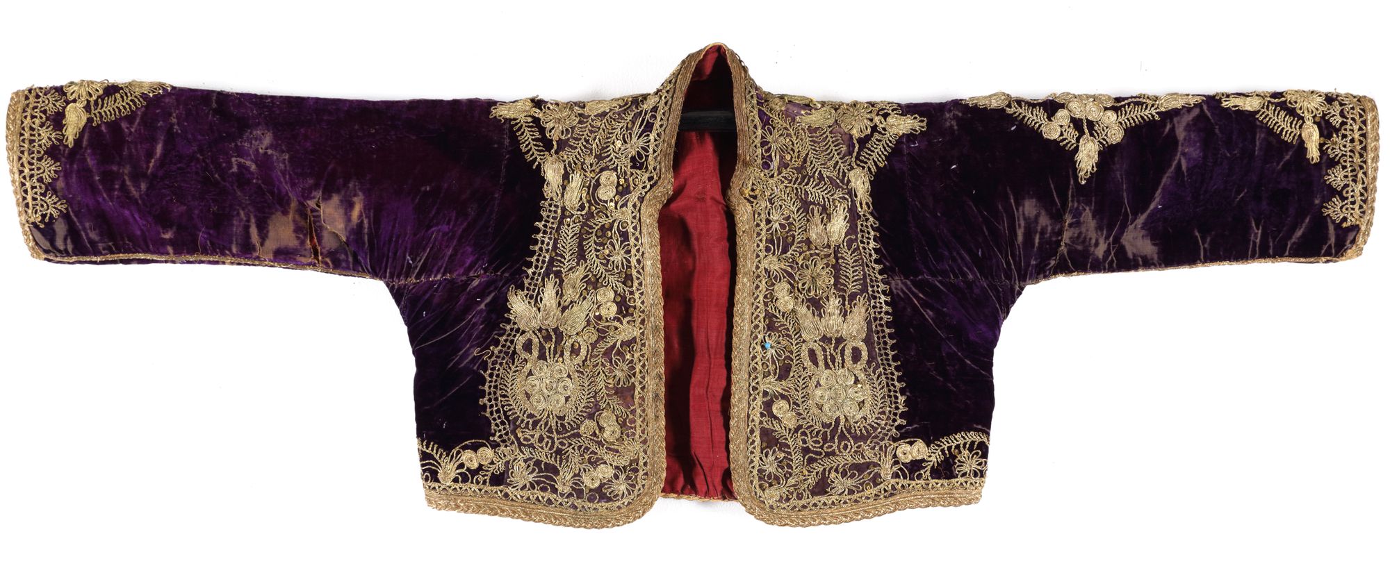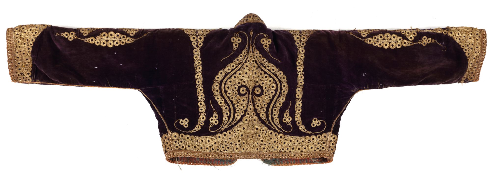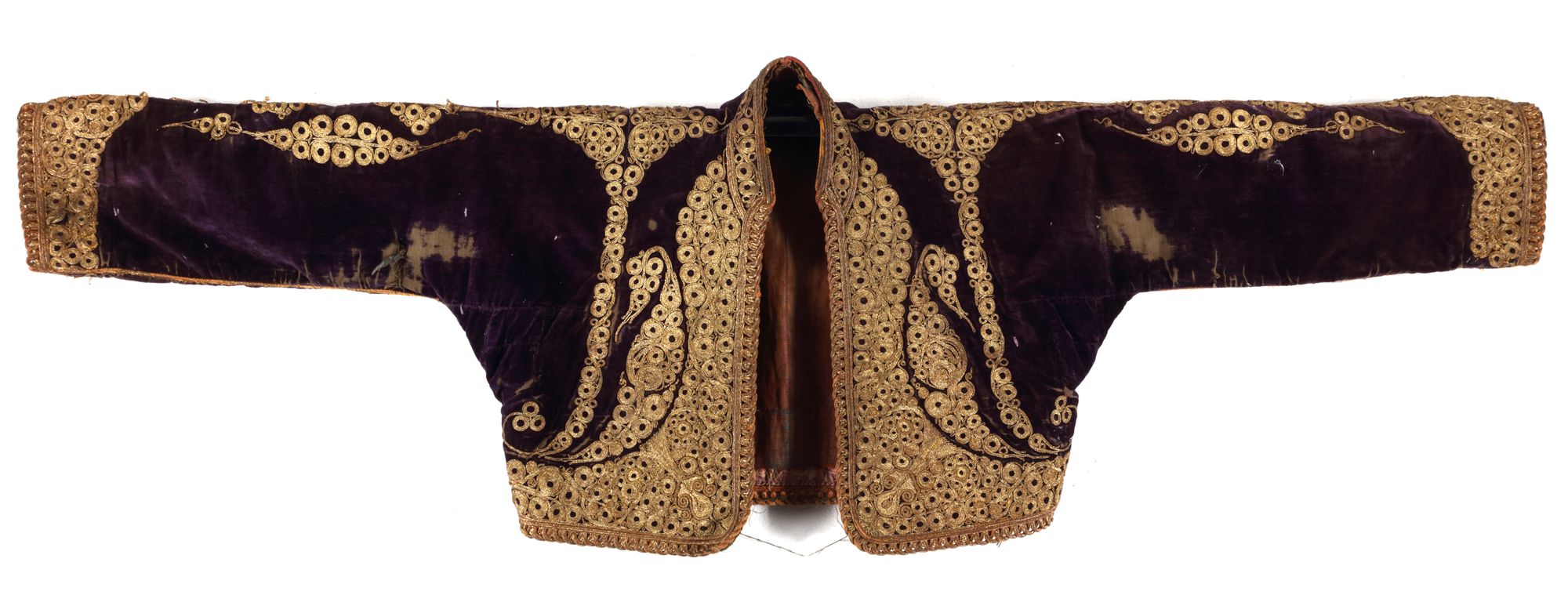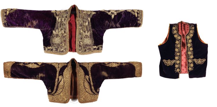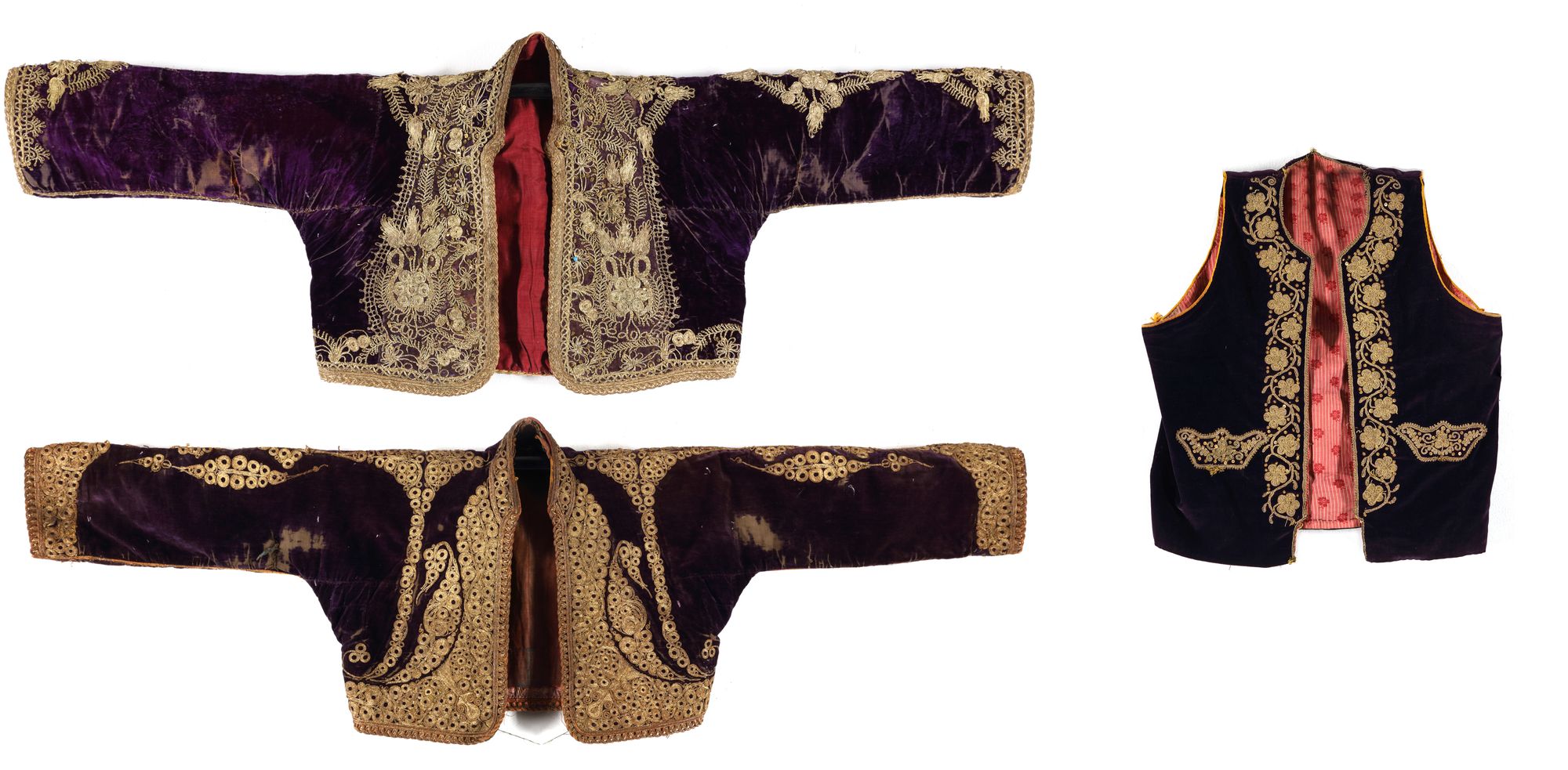 Three Ottoman embroidered velvet jackets, decorated in gilt threads with floral designs floral designs. 40 by 128 cm.