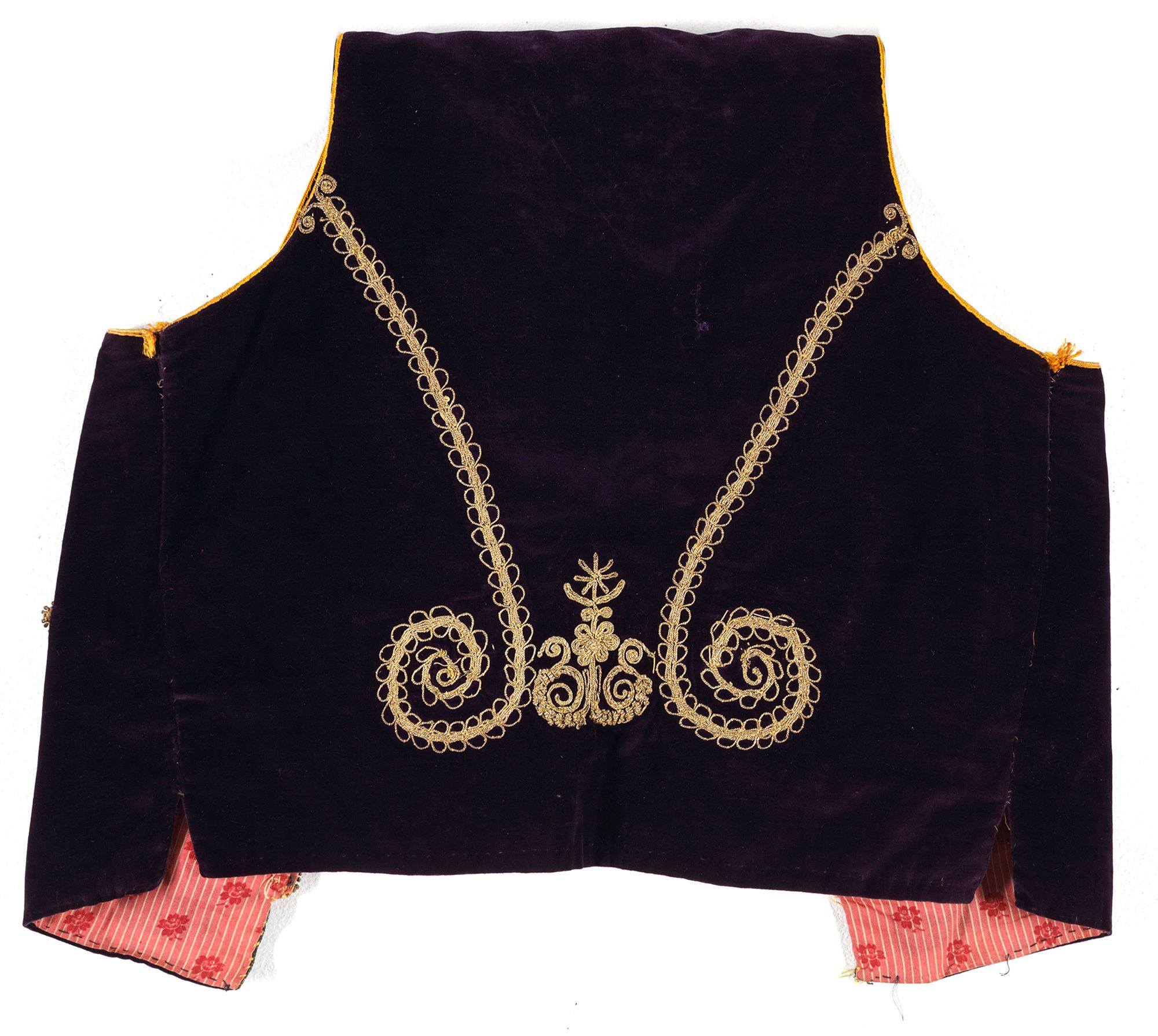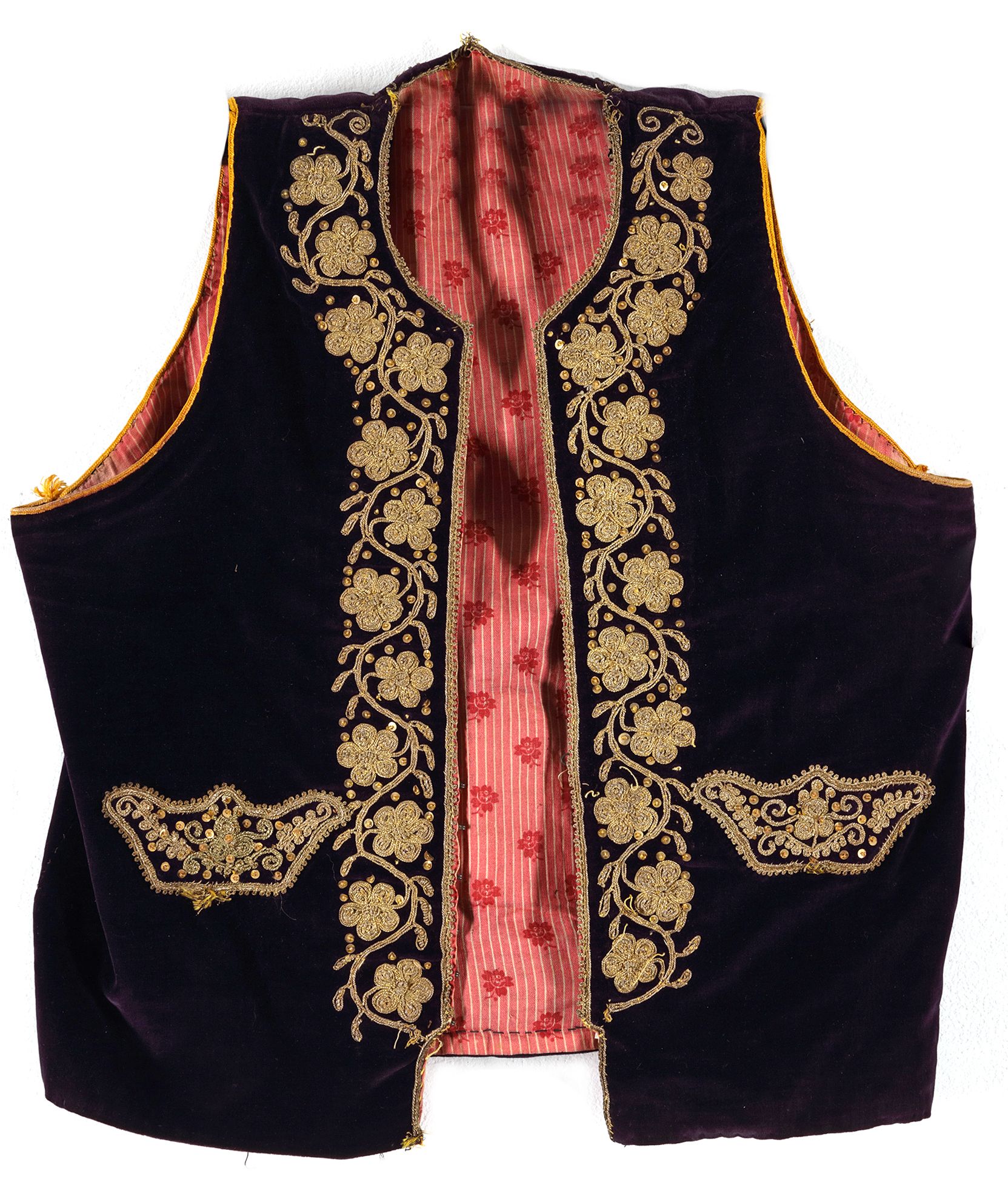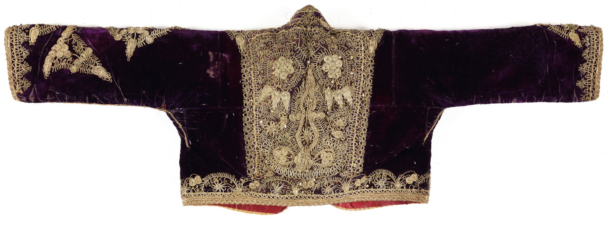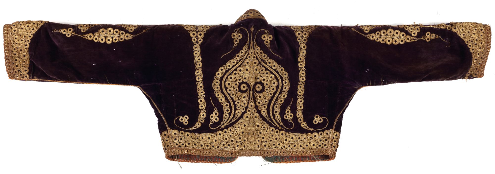 Three Ottoman embroidered velvet jackets, decorated in gilt threads with floral designs floral designs. 40 by 128 cm.
