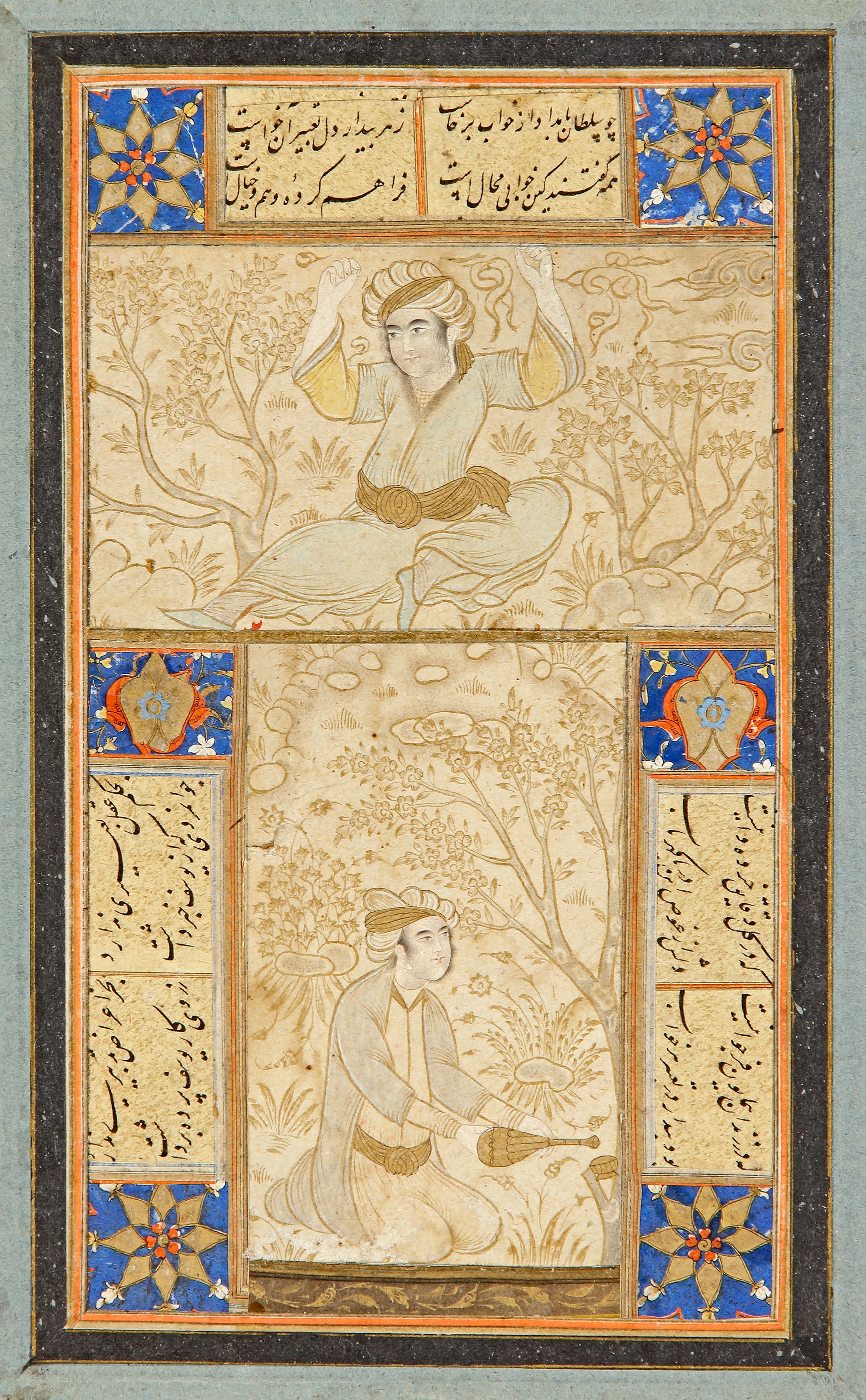 Pencil and ink on paper, heightened with gold, laid down on album page, depicting a youth holding a carafe with another scene in a landscape. With Persian poems in black nastaliq script and stylized on both sides with gilt and striking blue decoration.