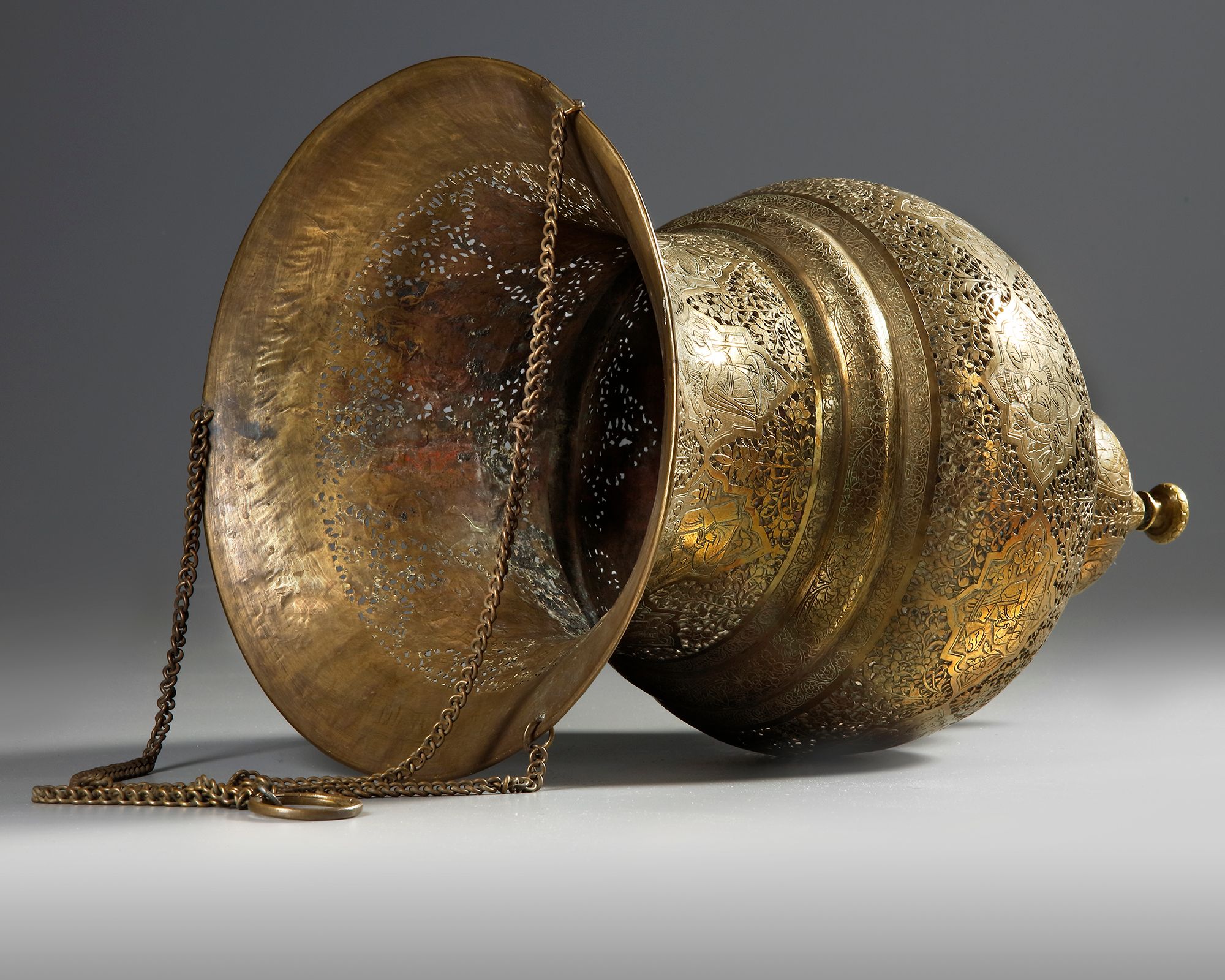 Probably for the Mosque, of bulbous form, the openwork body decorated with calligraphic inscriptions in loose thuluth script.