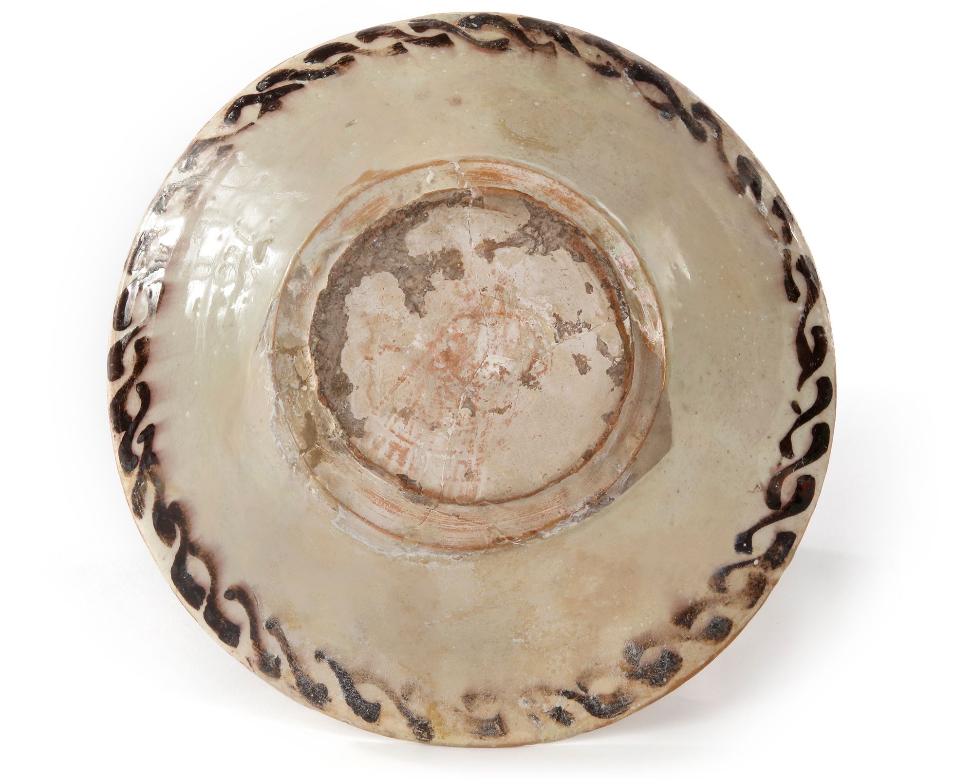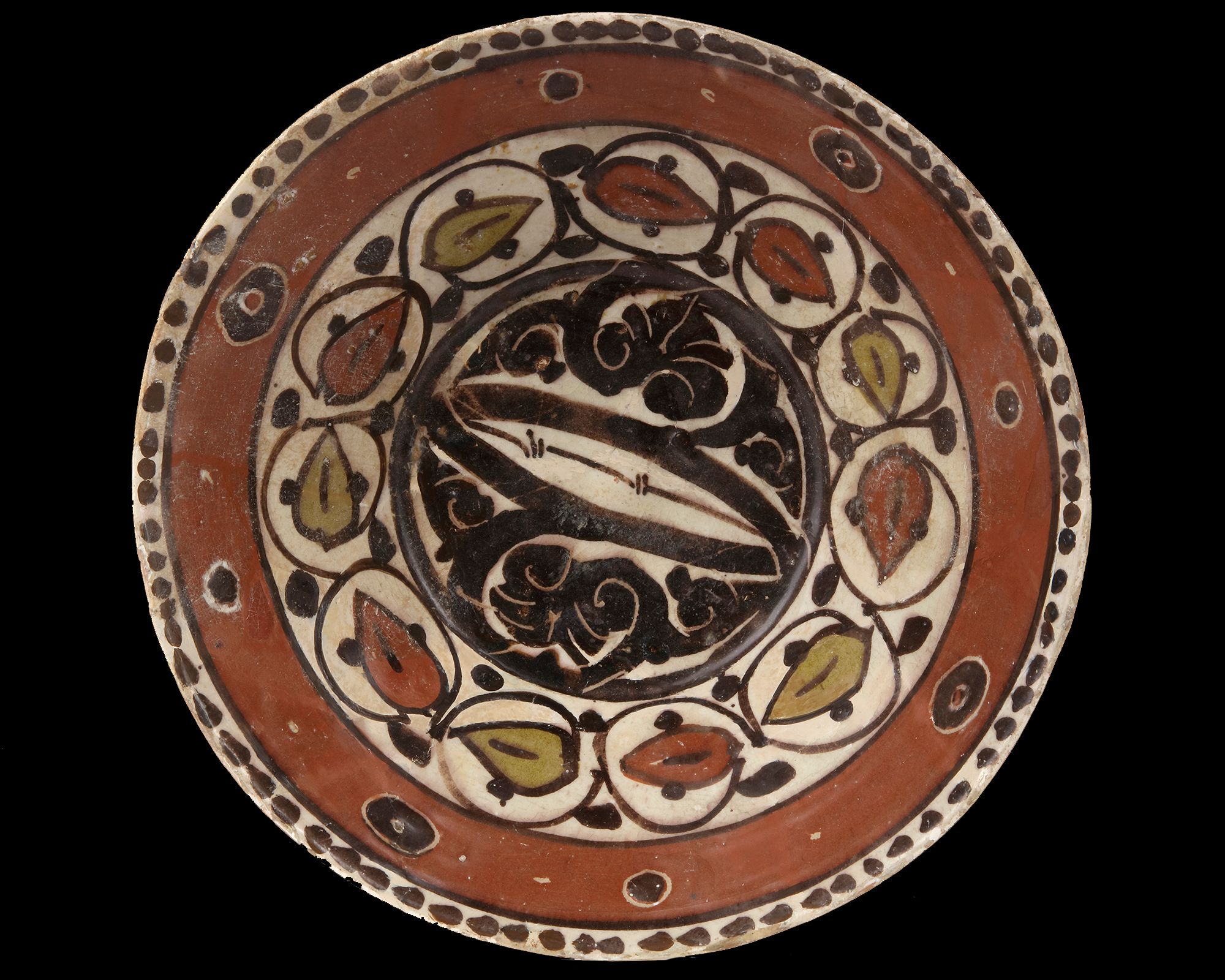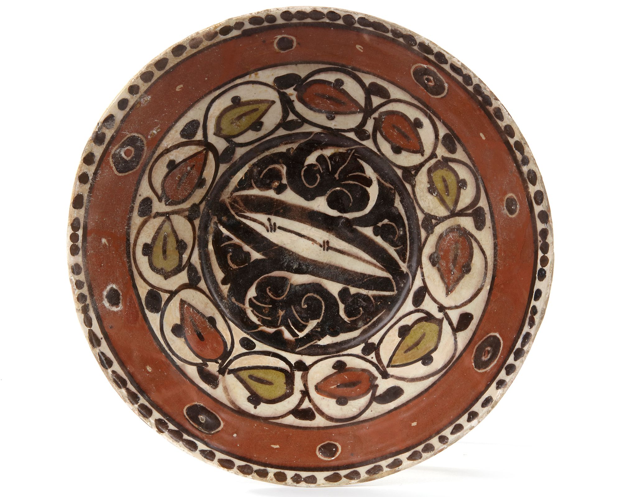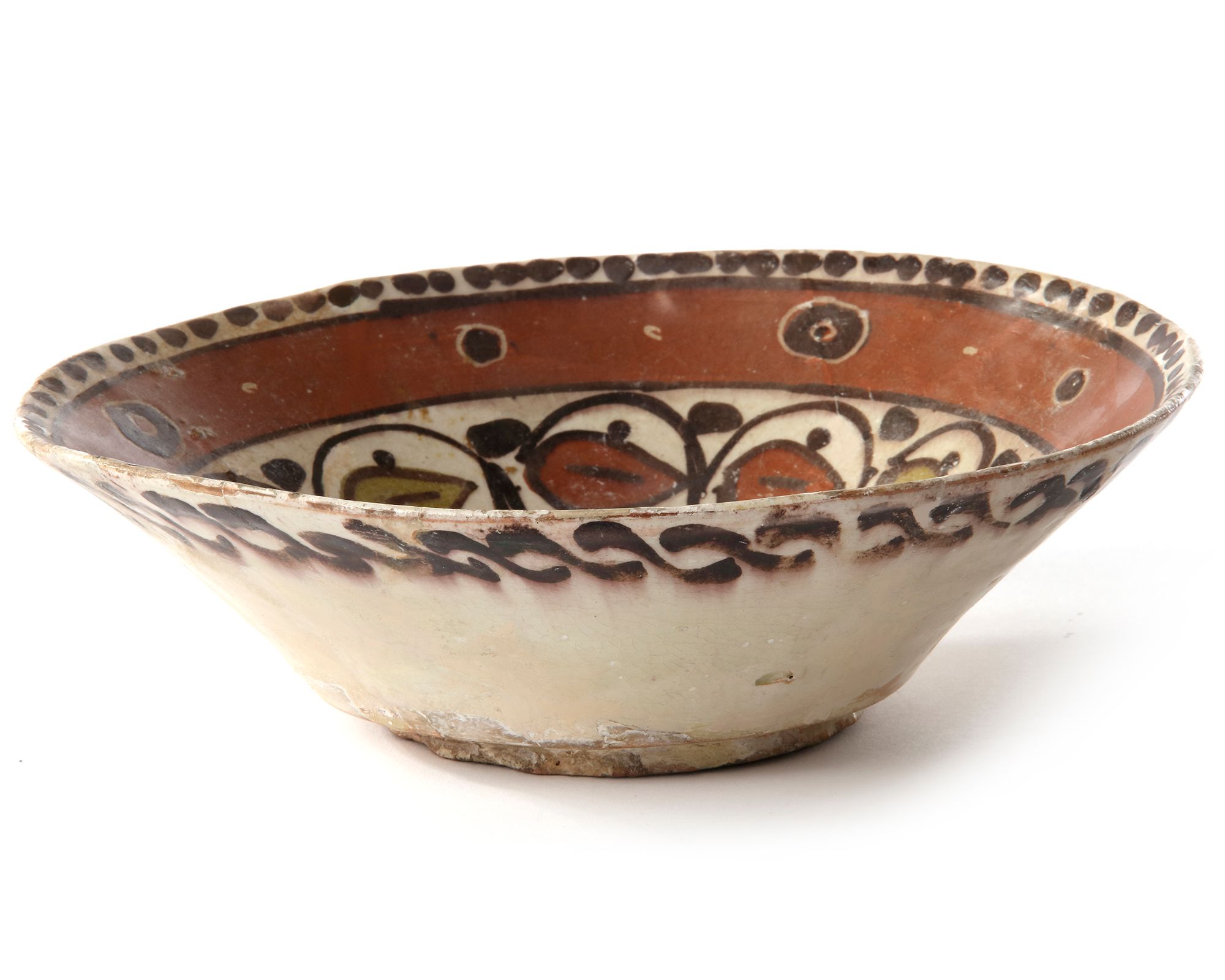 Of conical form on a short foot, decorated in tomato red, manganese and ochre on a cream ground with abstract vegetal designs consisting of large palmettes and split palmettes, the well with a flowerhead and a band of cable design.