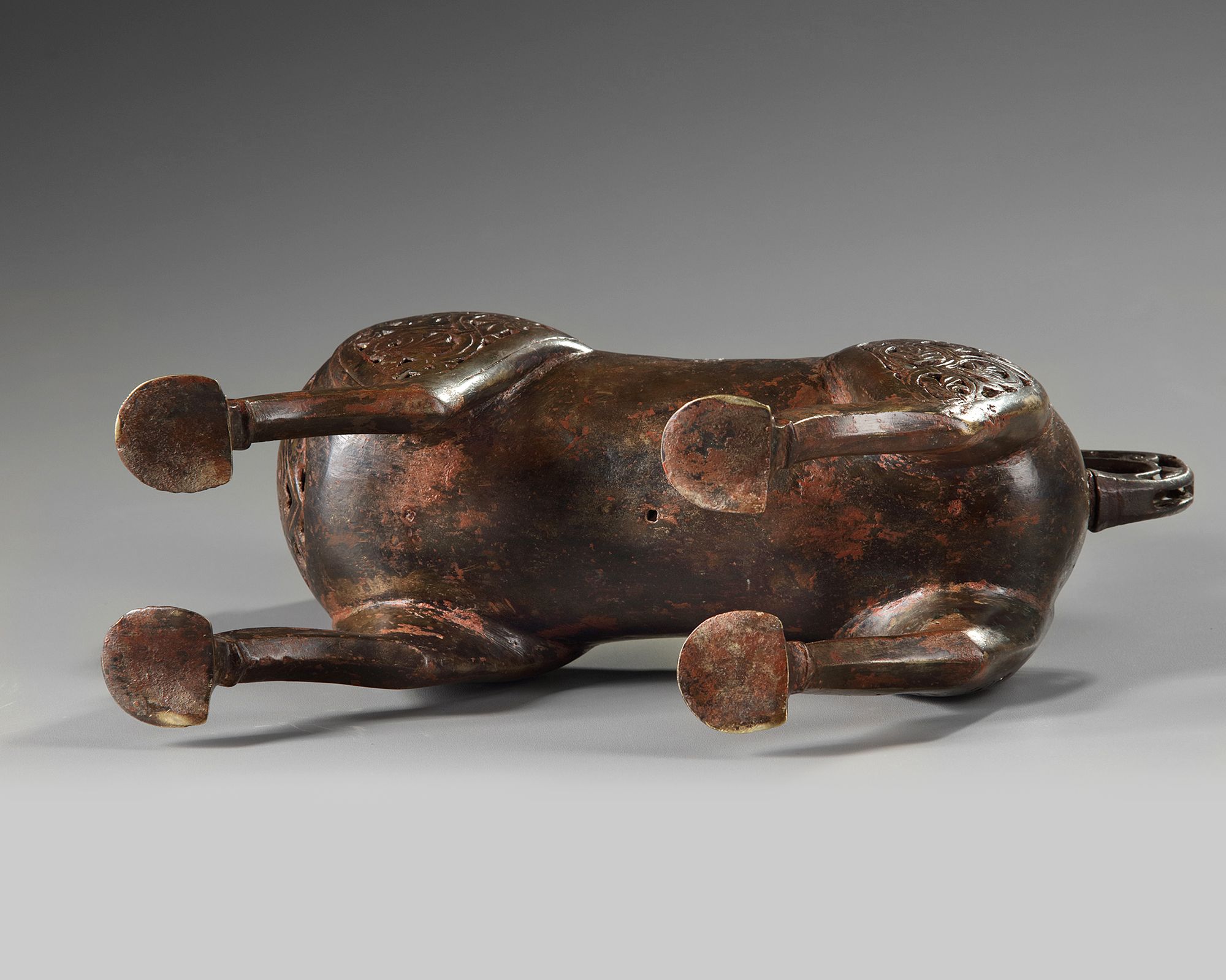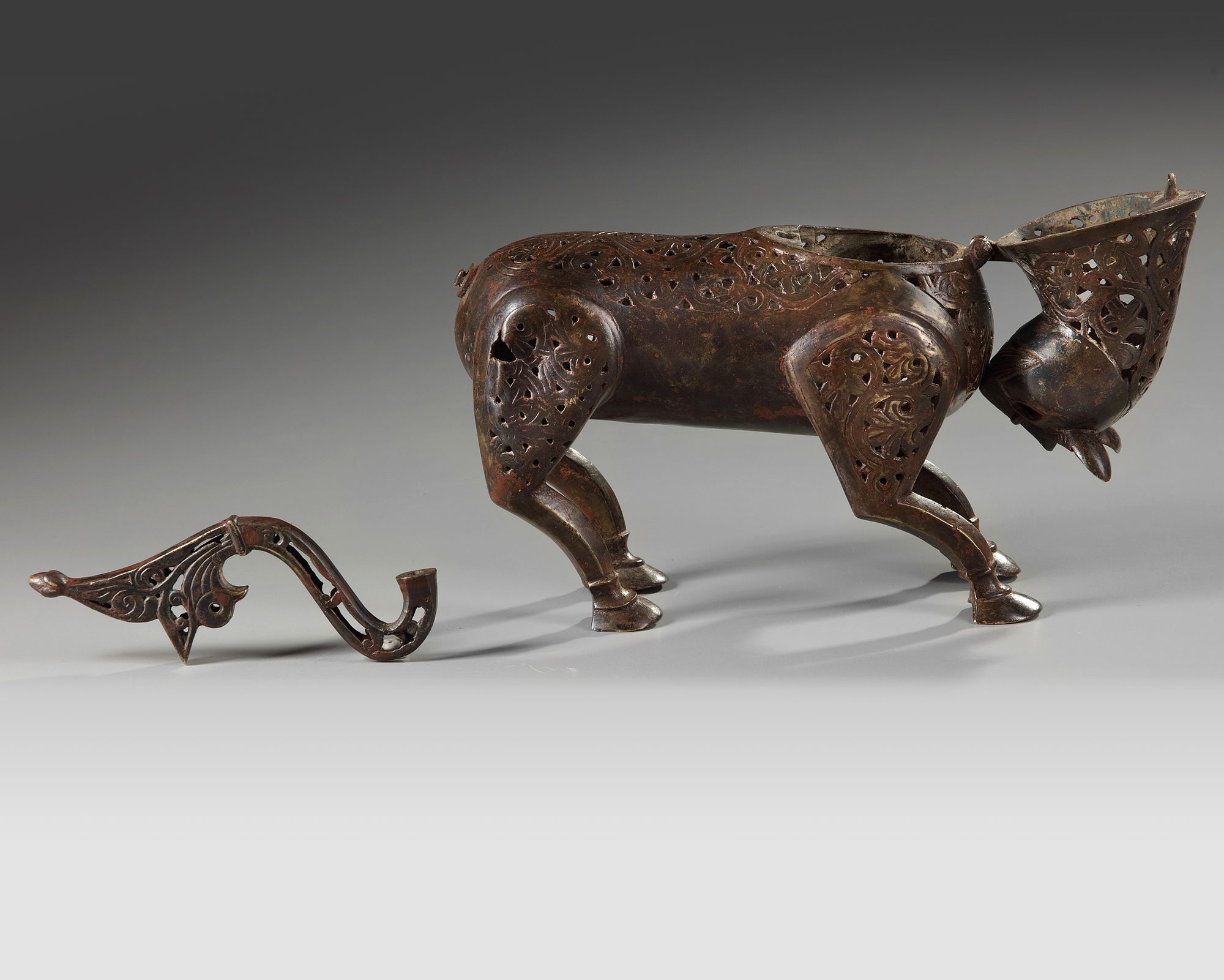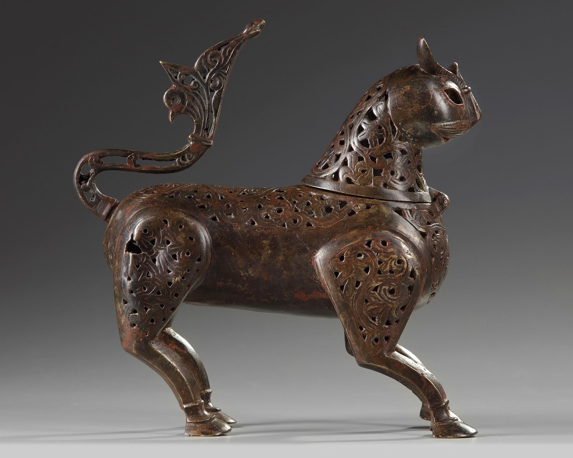 An Islamic bronze incense burner. Persian, with hinged head, the body and tail finely pierced with scrolling foliage with turquoise inlays.