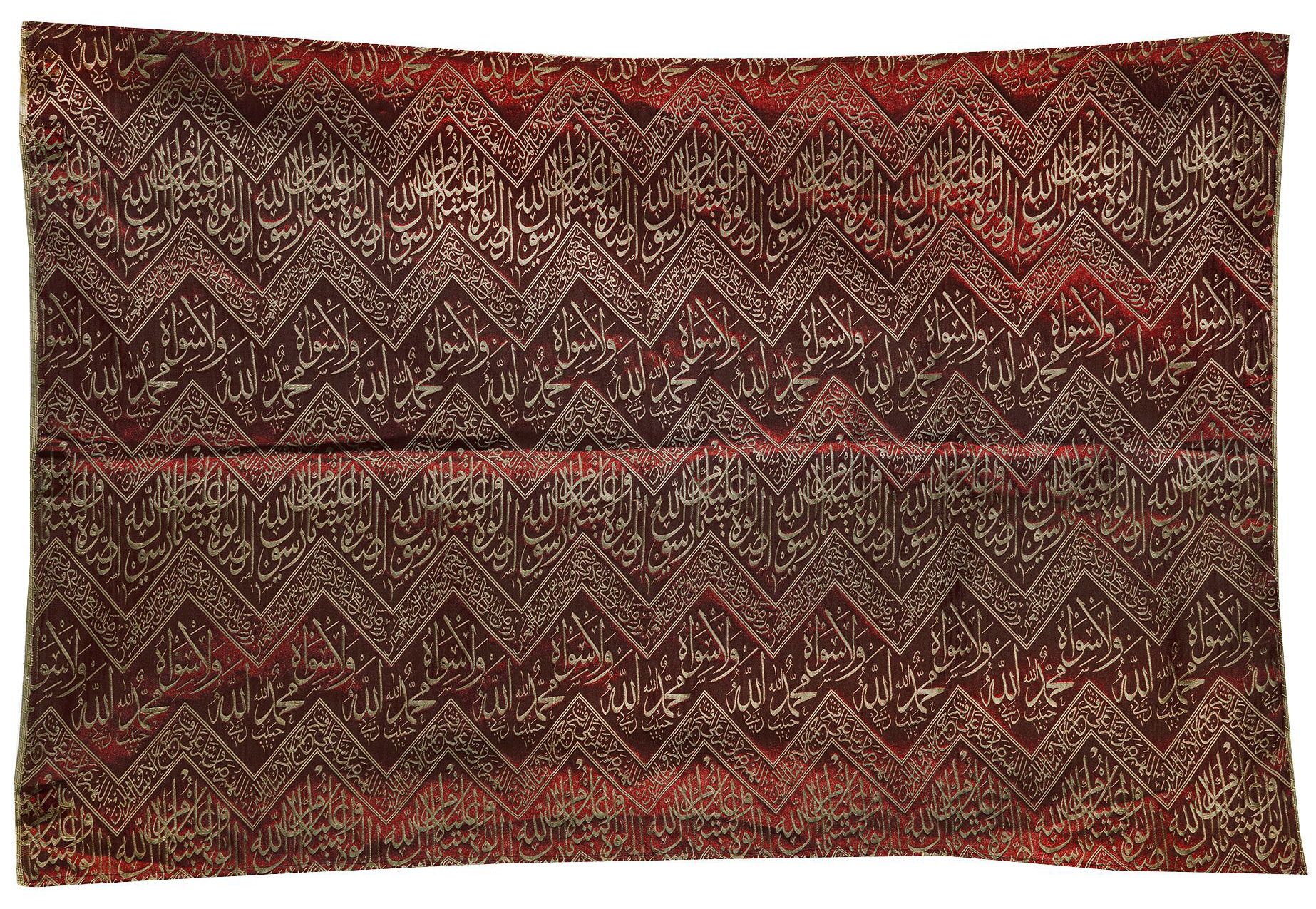 A fragment with an inscribed weave in cream color over a red silk ground. Embellished with a prominent inscription within a broad border in thuluth script of praise of the prophet ‘Prayer and peace be upon you, O Messenger of Allah’. Below with a narrow band containing prayers for the four righteous caliphs Abu Bakr, ‘Umar, ‘Uthman and ‘Ali as well as for the companions of the Prophet. At the top with band enclosing ‘O Allah, bless the Prophet Muhammad, the Seal of Prophets and Messengers’. 57 by 85 cm.