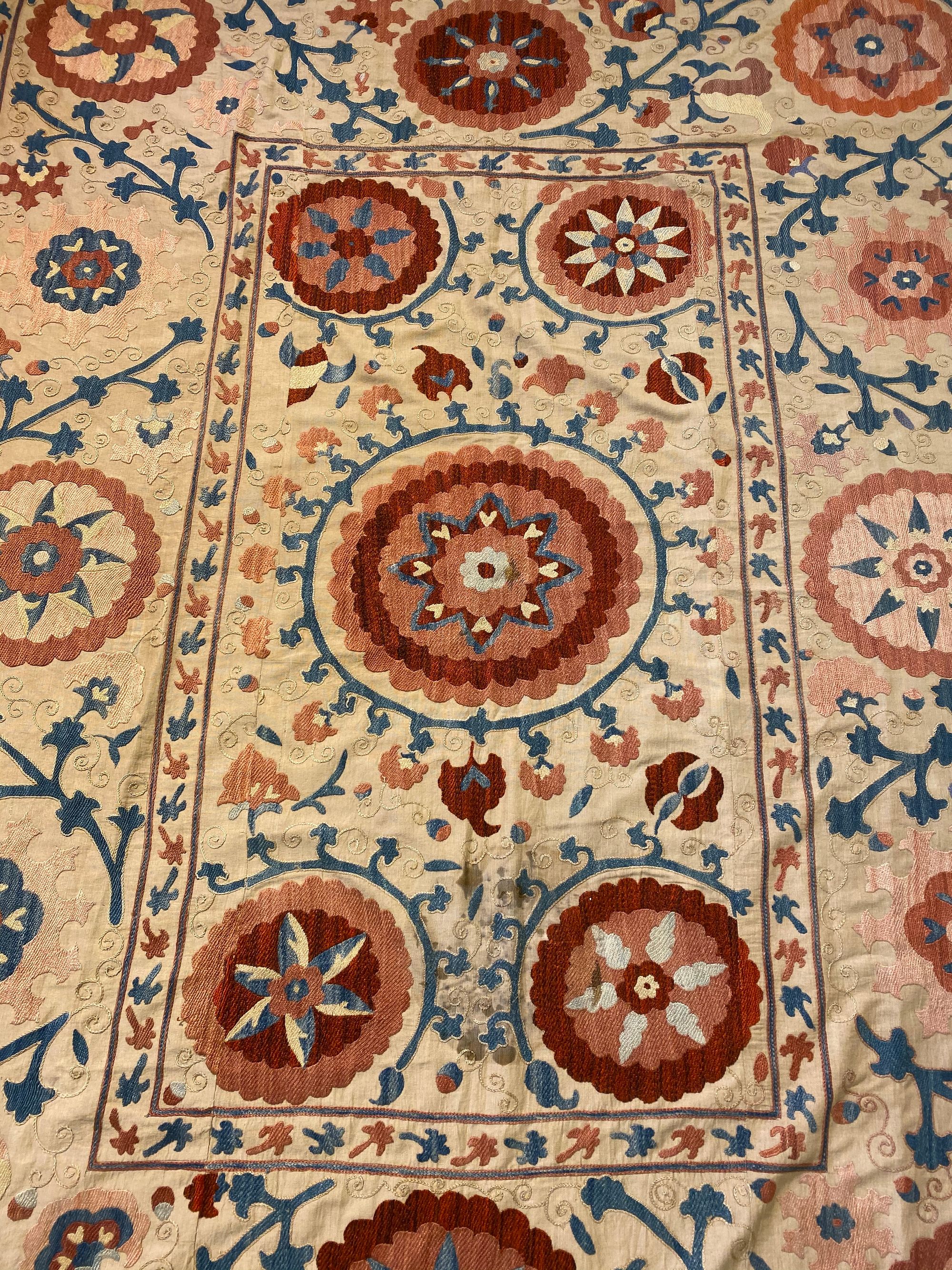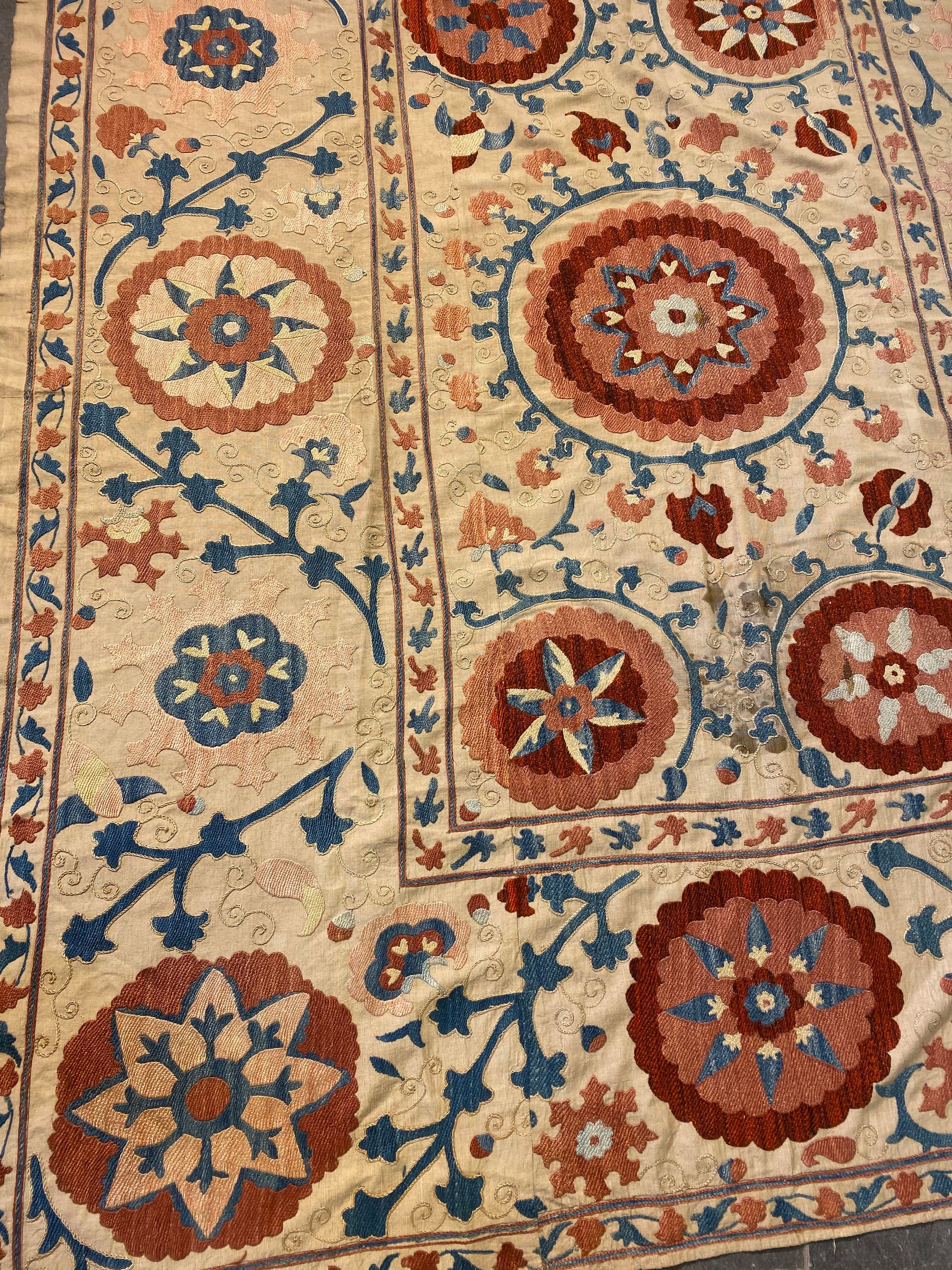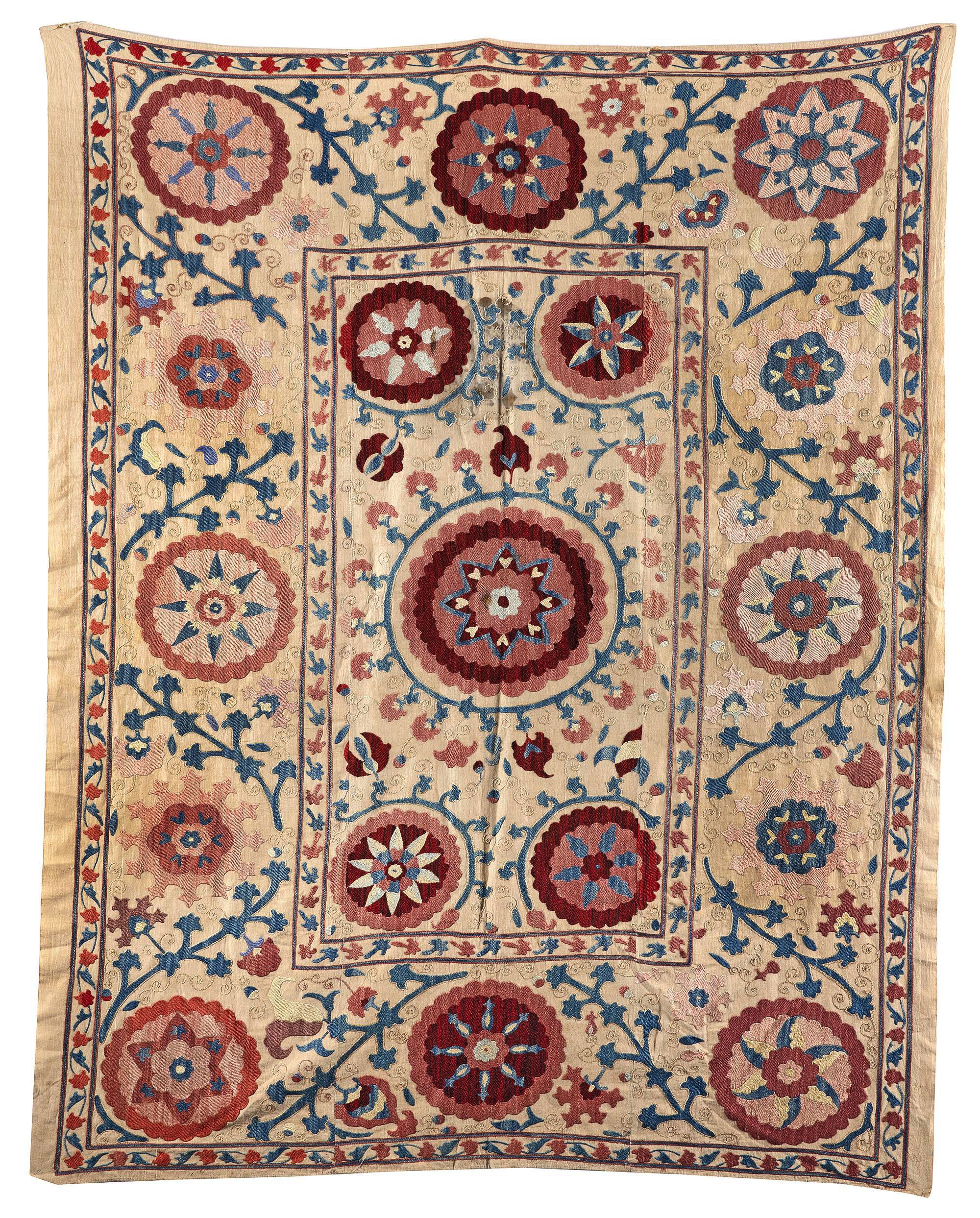 Decorated with cushioned silk flower patterns in red, blue and salmon pink on a ivory-cream ground linen panel. 184 by 148 cm.