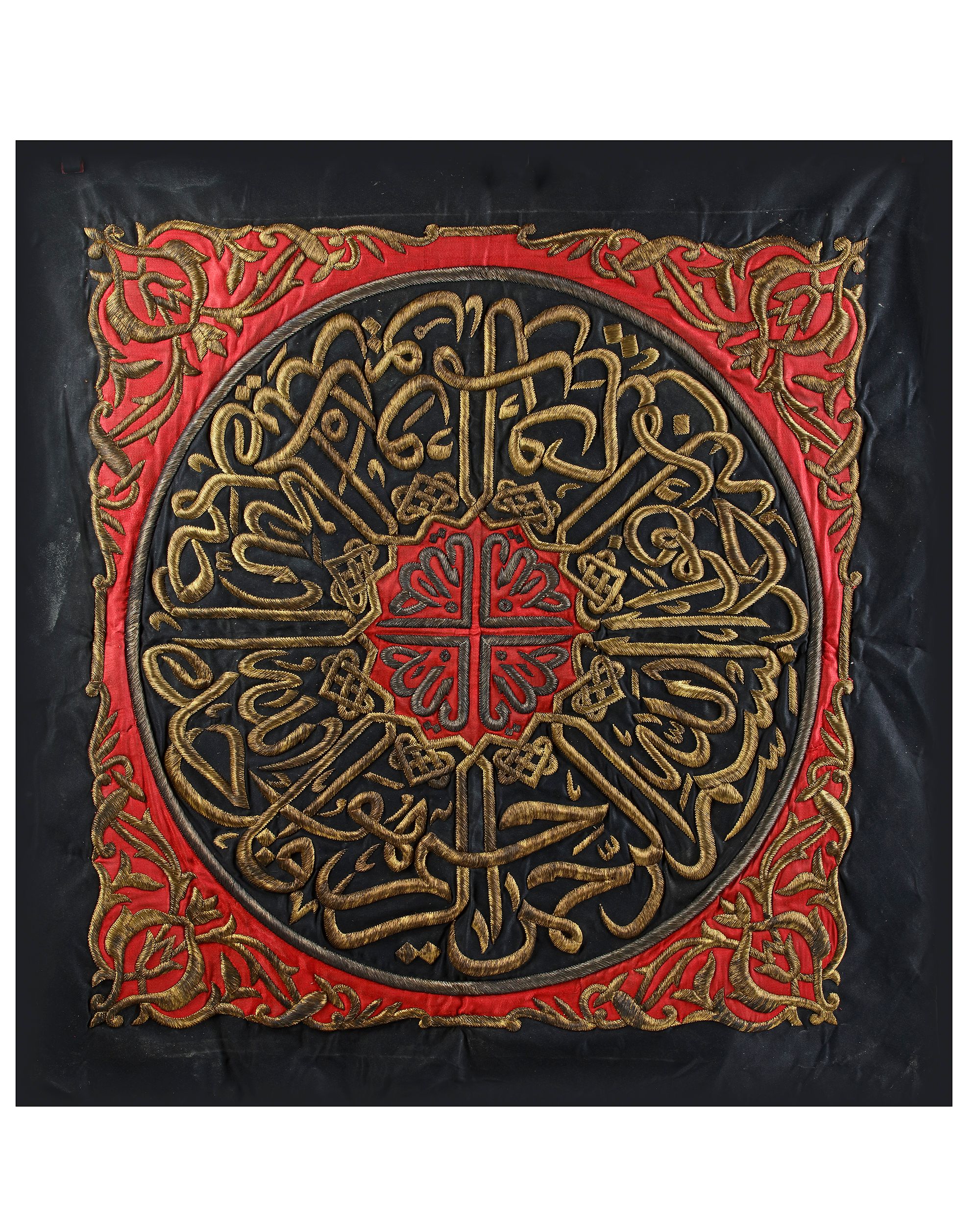 An Ottoman Kaaba kiswa brocade or samadiyah, of square form placed always on the four corners of the Kaaba. Embellished in silver and gilt wires on a black and red silk ground with a large roundel enclosing in thuluth script Quran 112 surah Al-Ikhlas or Al-Tawhid, to the centre four words of 'O, Allah'. All surrounded by flower sprigs and arabesque on a red and black ground. 104 by 104 cm.