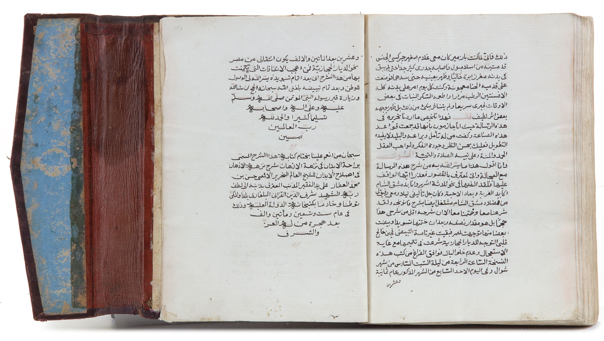 A medical book about physical serenity and mental wellness, Arabic manuscript on paper, 250 leaves with 2 flyleaves, 23 lines to each page written in bold black naskh script. By Shaykh Hasan al-Attar, an Islamic scholar, Grand Imam of al-Azhar from 1830 to 1835. A "polymathic figure", he wrote on grammar, science, logic, medicine and history. He was a forerunner of Egypt's national revival, and his legacy was a generation of Egyptian modernizers. He wrote prolifically in defence of logic and modern astronomy. His first contact with foreign (non-Muslim) knowledge came during the French occupation of Egypt (1798–1801). Fearing for his safety after the French withdrawal, he left Cairo for Istanbul. There he studied and read voraciously, from 1802 through 1806, when he continued his studies in Alexandretta (today Iskenderum), Izmir and Damascus, returning to Egypt in 1815. He was the first director of the new medical college, defending the necessity of corpse dissection, which he had observed in the Cairo veterinary college, against the non-experimental, theoretical teachings of eleventh-century Avicenna, discarded centuries ago in Christian Europe. While he was a successful lecturer at al-Azhar University, his time there was marked by continual conflict with un-Westernized ulemas, leading him at times to conduct classes in his home. The tensions only became worse with his appointment as rector. He died within four years. Copied by Sharaf Aldeen Al-Qazani Al-Bulgari in 1296 AH