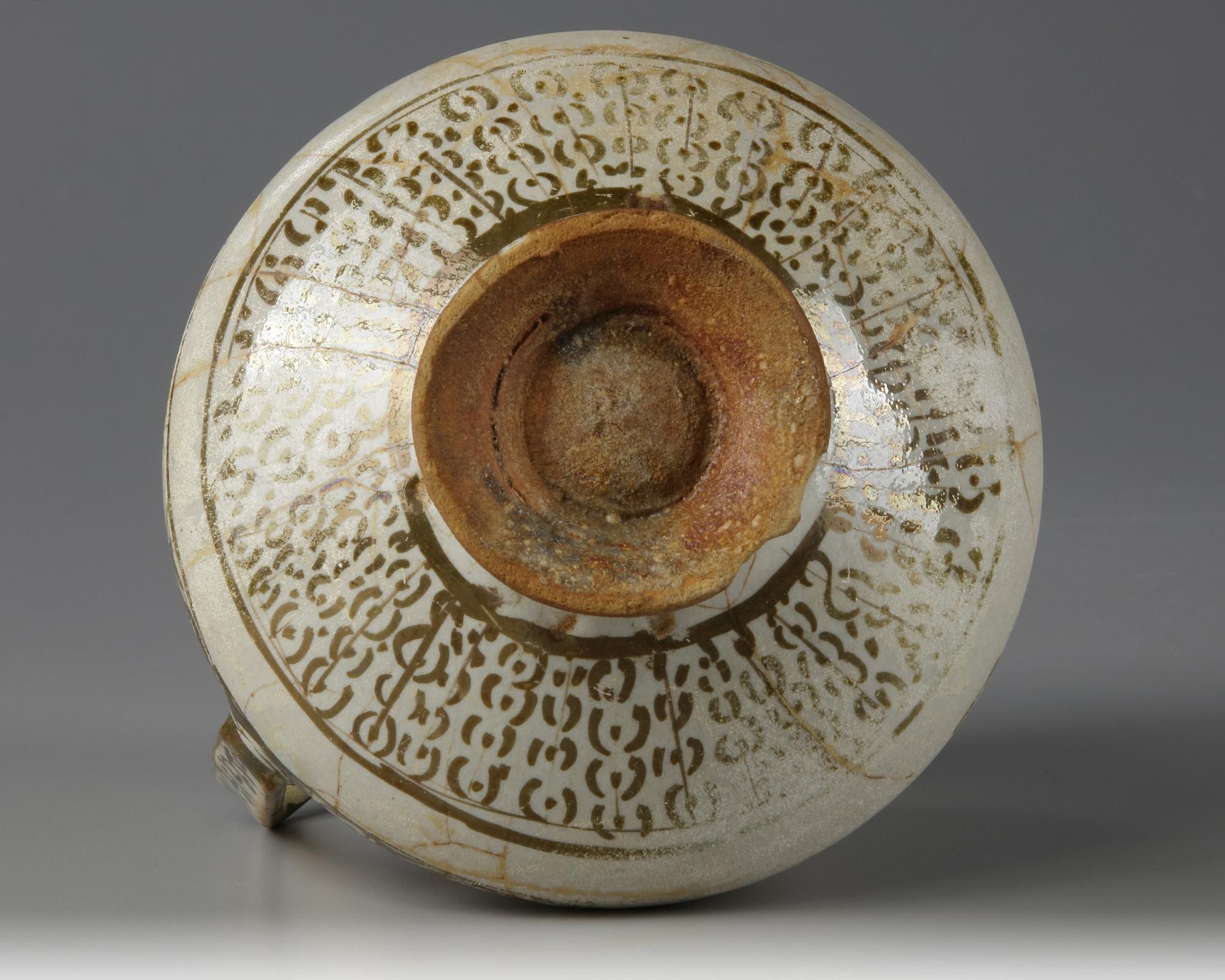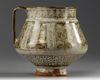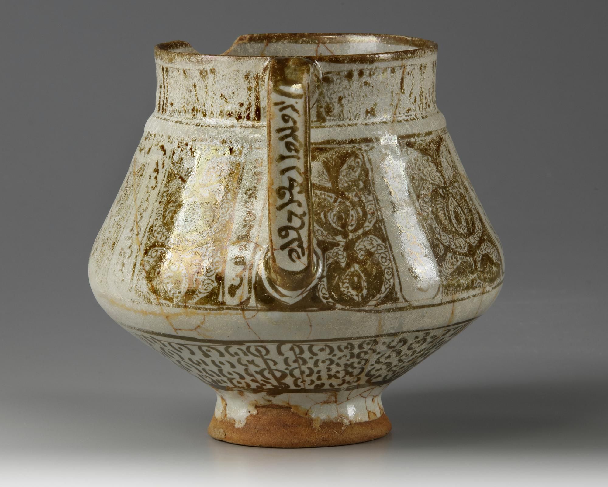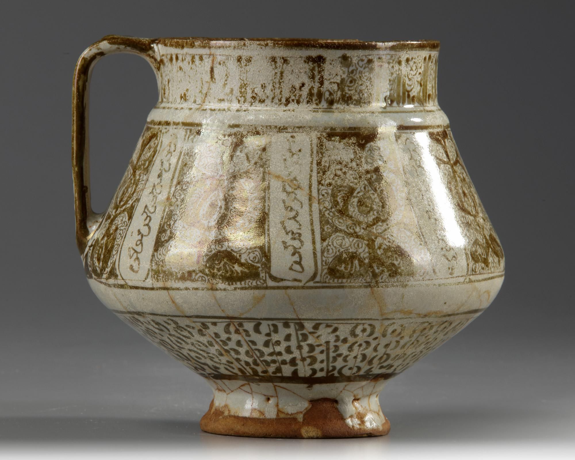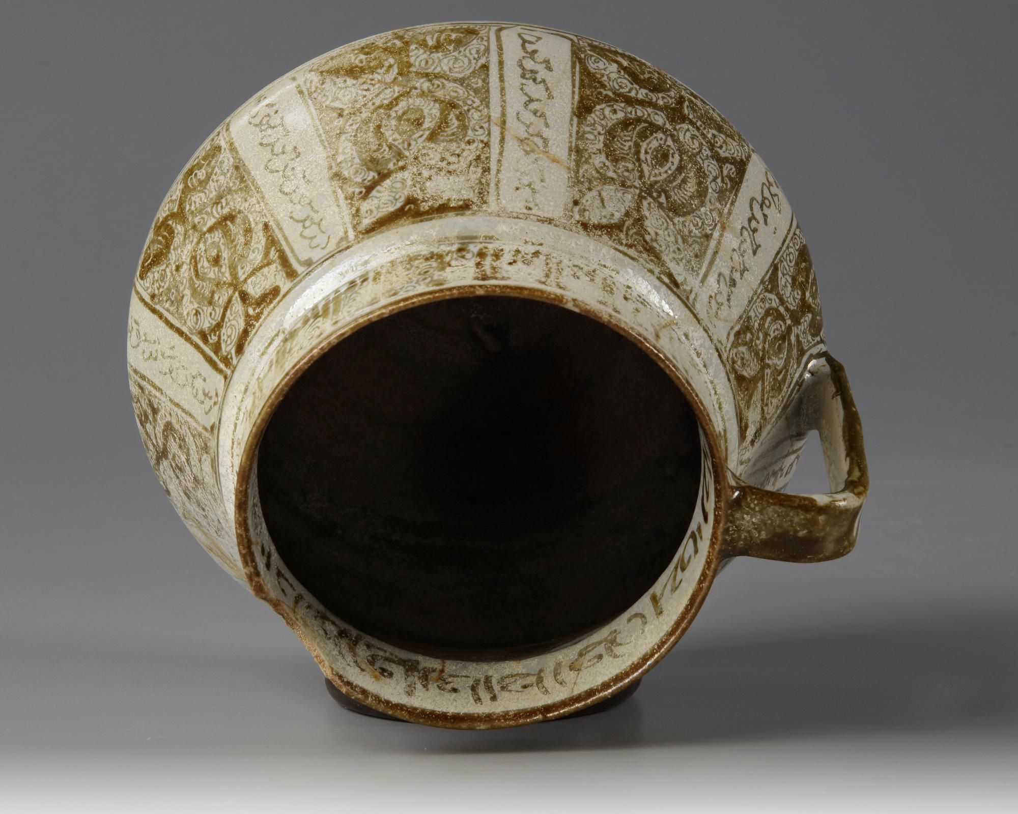 Standing on a small foot with handle, decorated in brown on a crackle glaze with panels enclosing flowers and divided by an Arabic inscription in Kufic script. The base is unglazed. Height: 14 cm.