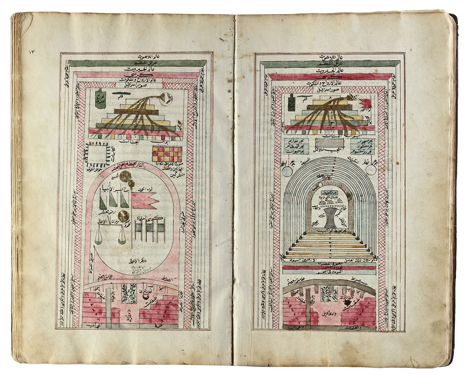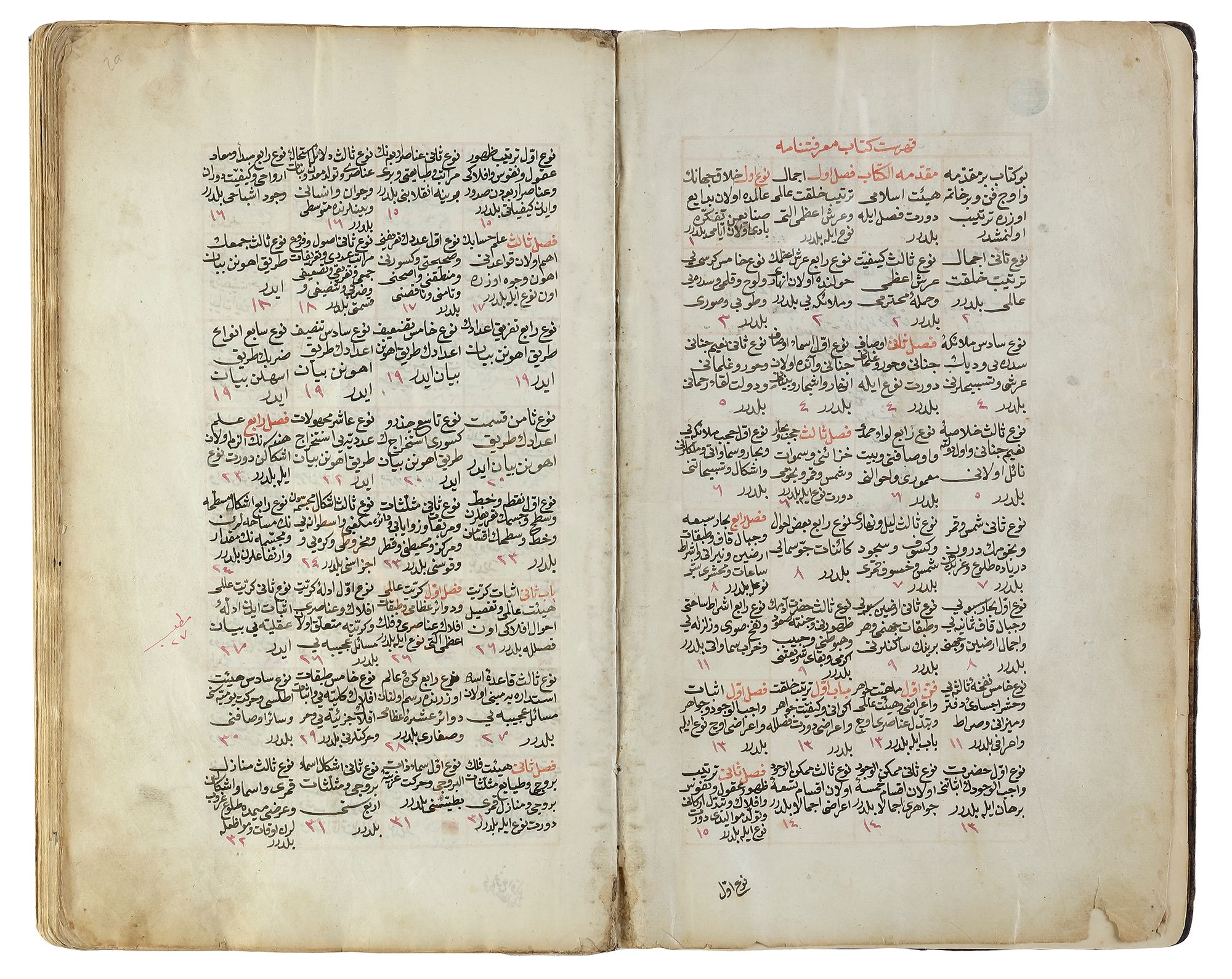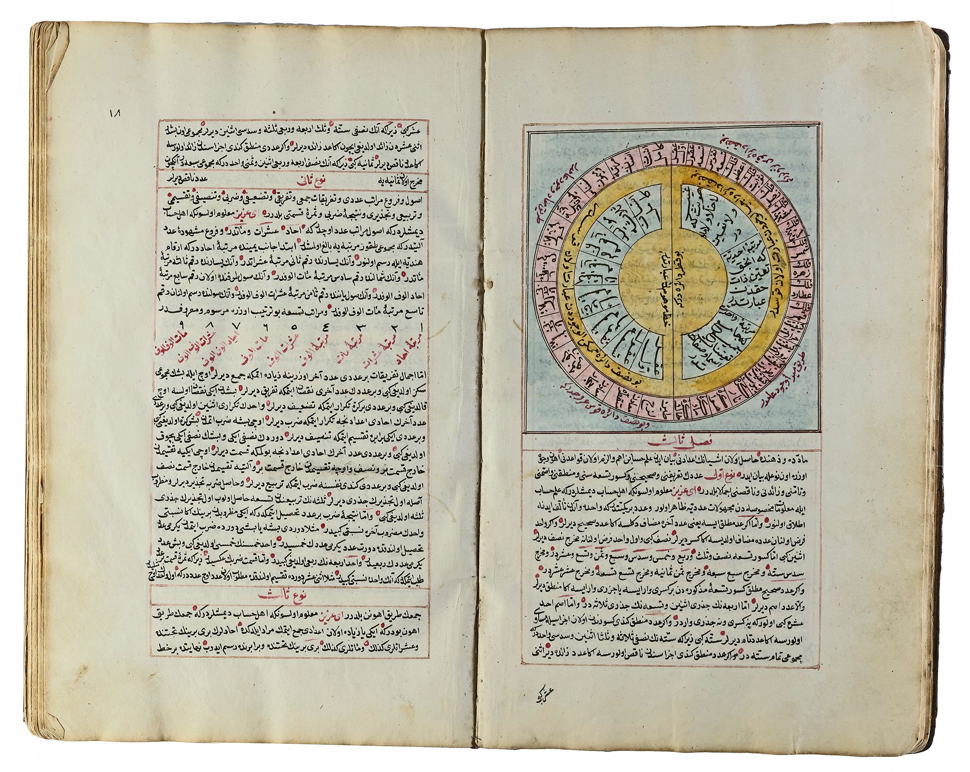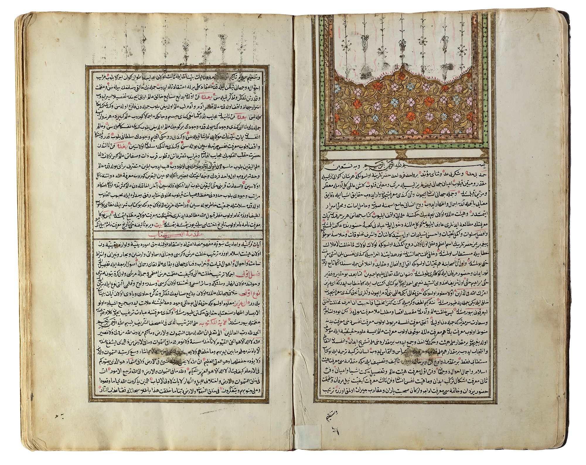 Arabic and Turkish manuscript on paper, 369 leaves plus 3 fly-leaves, written in black naskh script. Catchwords and titles in red, the opening page with gold and polychrome decoration. Marifetname is the second main work of Erzurumlu İbrahim Hakkı. The work includes a preface, three major chapters and an afterword, each chapter divided into subsections. The preface is entirely religious, the first part describes the existence and oneness of God, then describes simple and compound bodies, mines, plants and finally man. Then there are geometry, astronomy and calendar topics. It has shown the latitude and longitude of more than 100 provinces in the geography section. The second part includes sciences such as science, anatomy, and physiology. He also examined the human body in terms of aesthetics, and squeezed couplets together. He believed in the relationship between body structure and temperament and explained this in poetry. At the end of this chapter, there is extensive information about the soul, health, and death. The third part with a religious, divine and philosophical content. The last section about method of teaching, the attitude of the student to his master, respect and love towards parents, qualifications to be sought in marriage and marriage, the custom of the relationship between husband and wife, duties towards children, the way of meeting and talking with relatives, servants, neighbors, friends, public and scholars, and its customs are included. 30 by 19 cm.