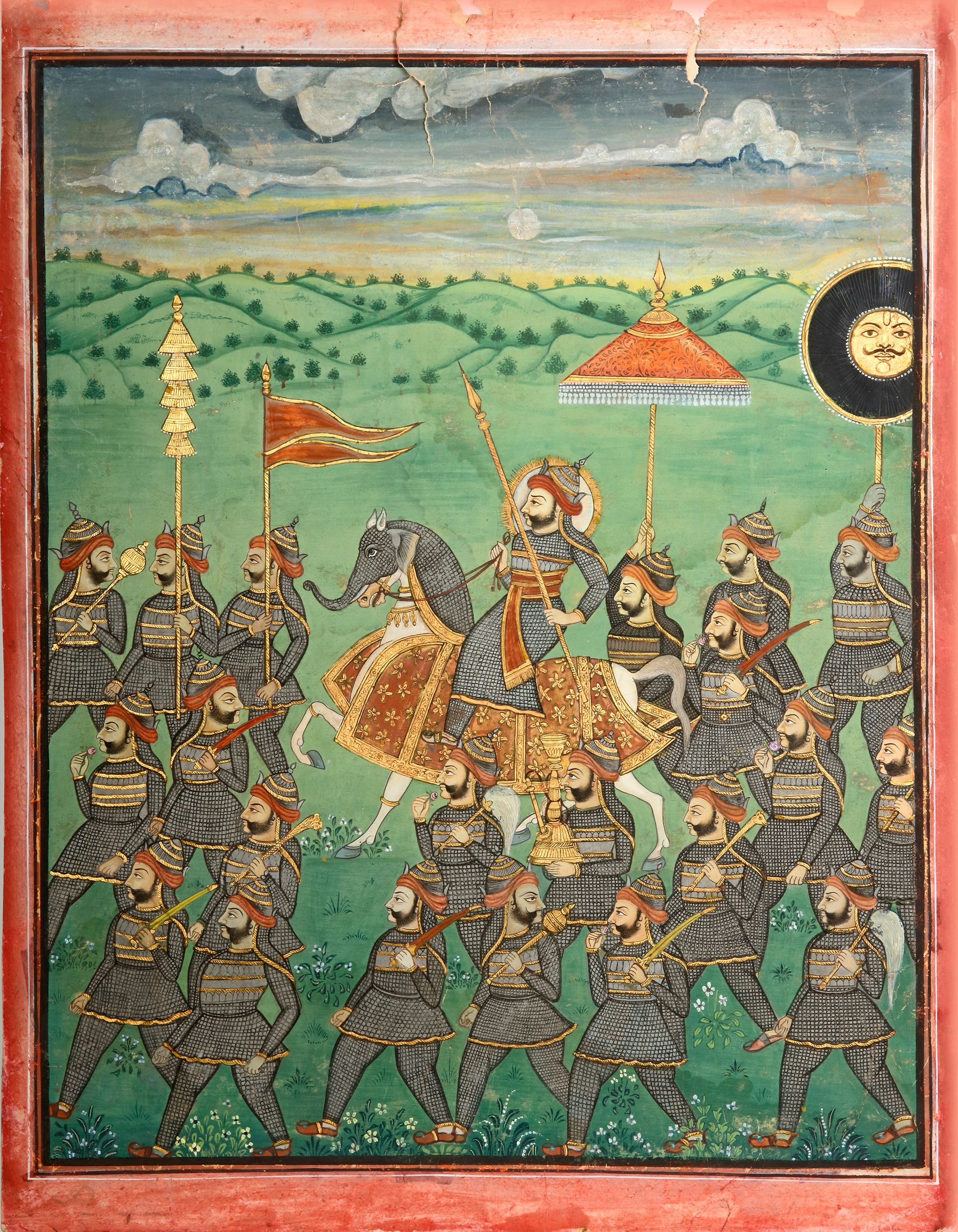Gouache heightened with gold on paper, depicting Maharana Pratap Singh in armour out riding his favourite horse Chetak with attendants.