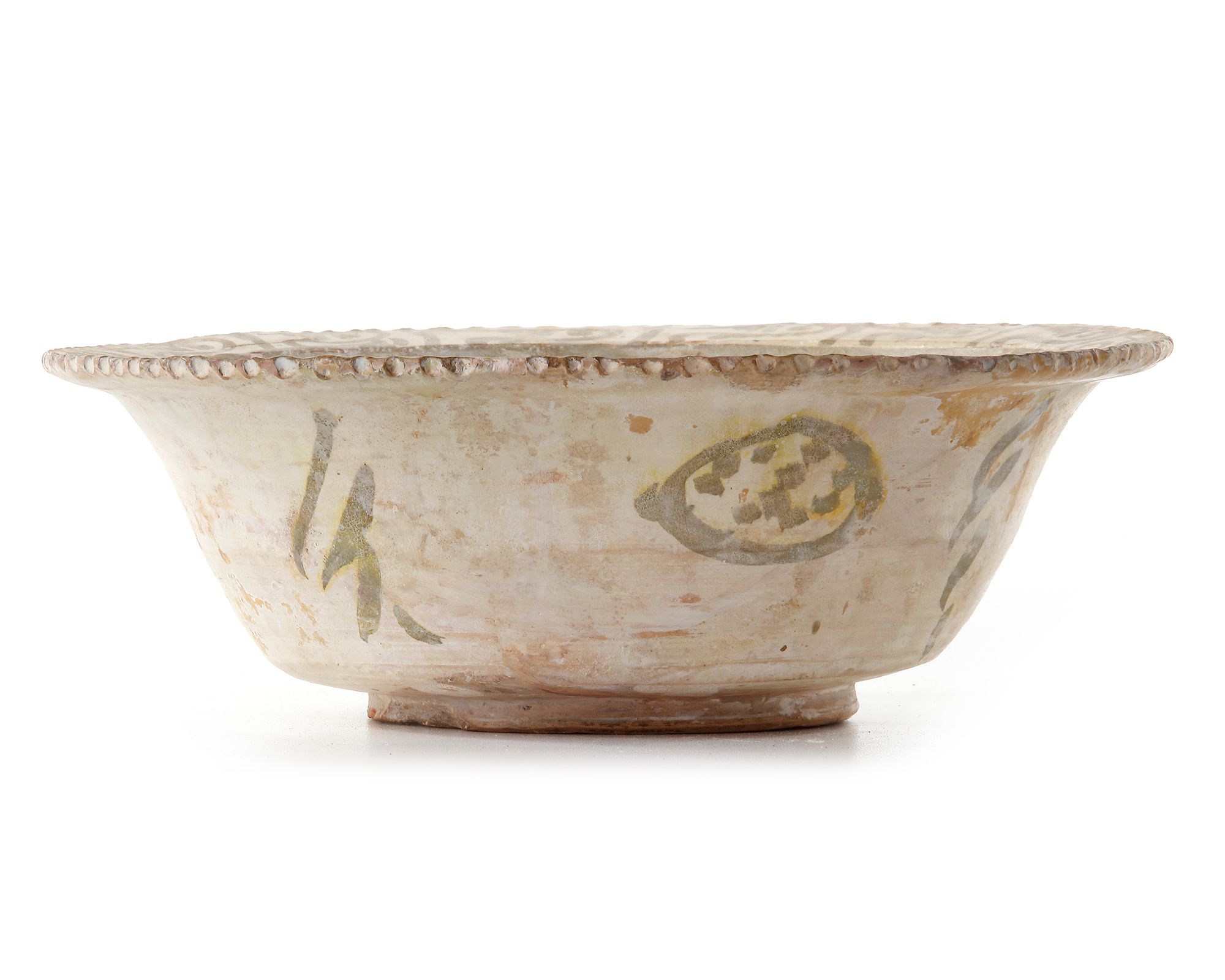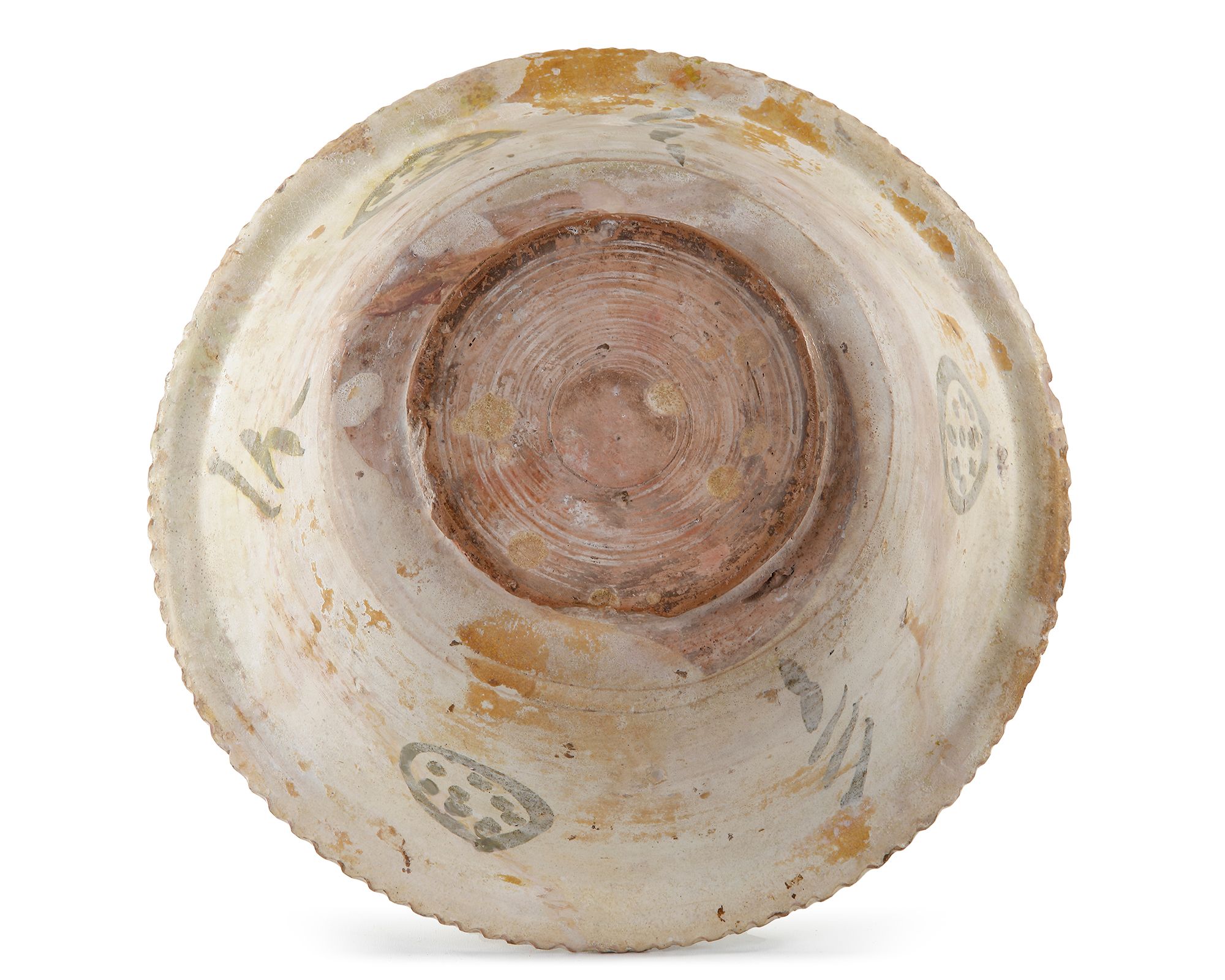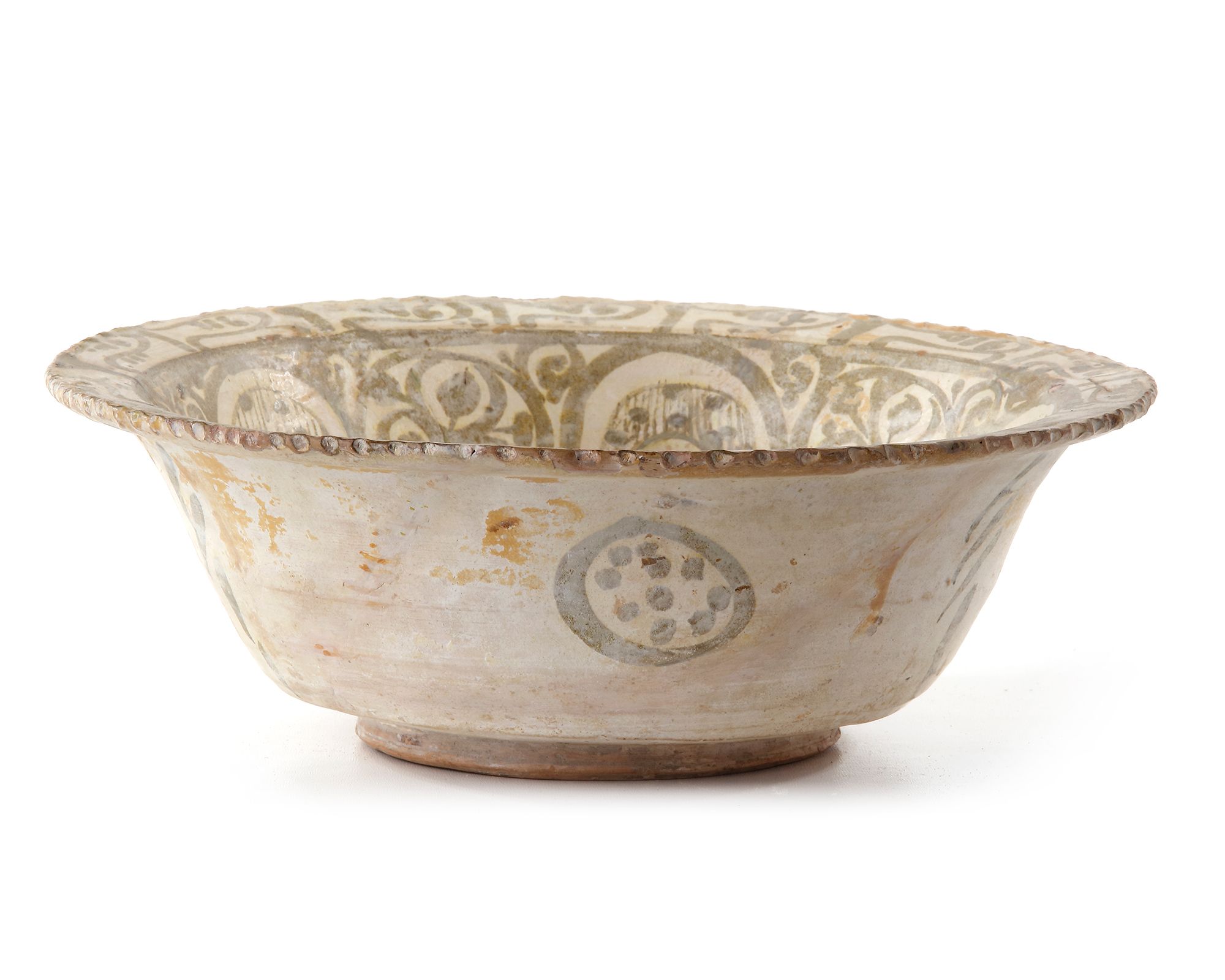 Decorated in brown with abstract floral motifs and rope designs on a white slip ground. 8.5 cm. height, 26 cm. diam.