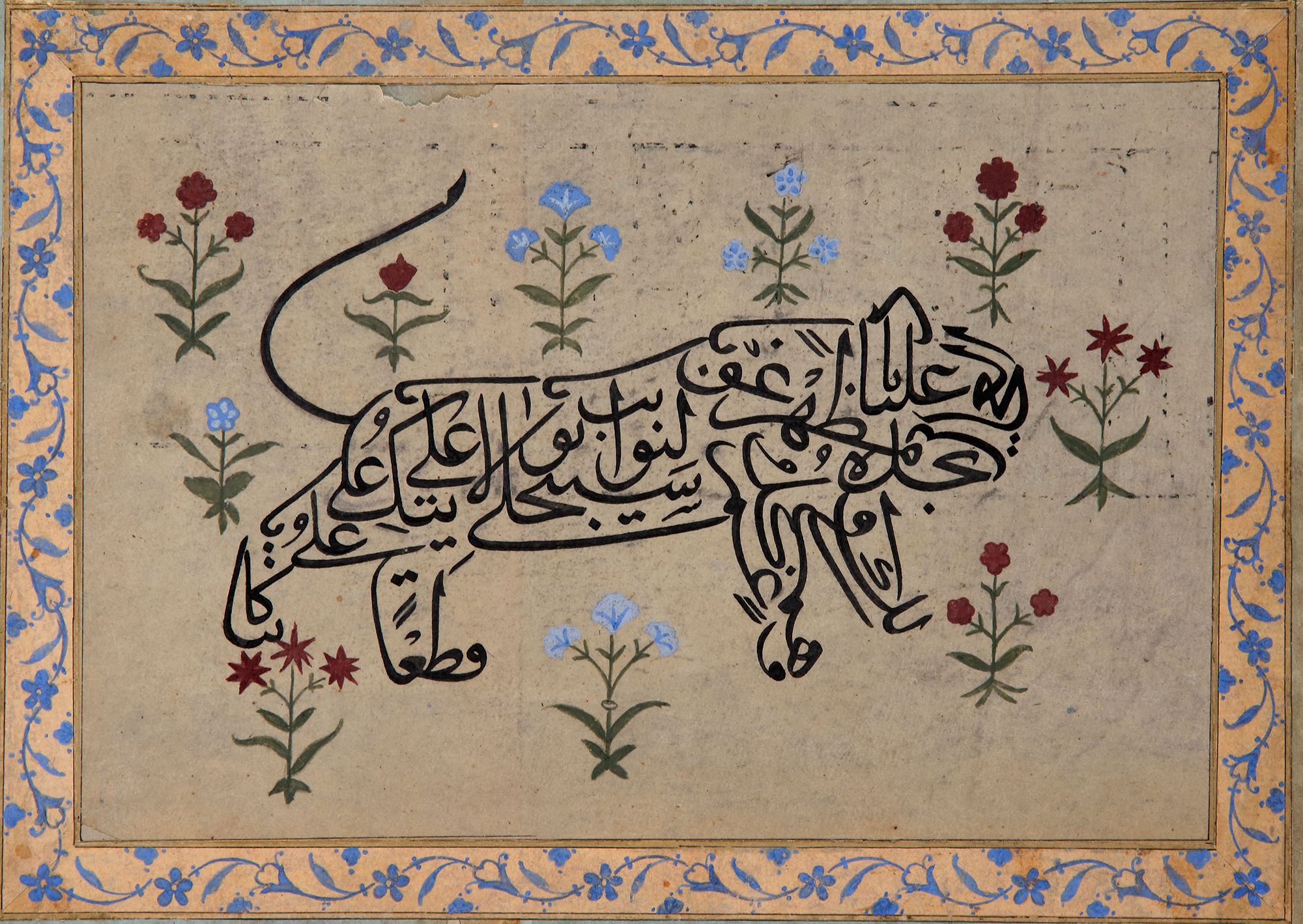 Opaque lapis-lazuli based paint, and gold on paper. This splendid calligraphic lion is an example of zoomorphic writing where calligraphers blended the arts of writing and drawing by using words to form animal and human shapes. The choice of the lion is quite pertinent since the Arabic text is a supplication to ‘Ali, the Prophet Muhammad’s cousin and son-in-law, who was the fourth Caliph and first imam. Because of his courage and valor, ‘Ali was known to Sunni and Shia Muslims by the epithet ‘The Lion of God’. The prayer, known as Nad-e ‘Ali, was typically used by Shia Muslims to seek ‘Ali’s help and support in times of stress and sorrow.