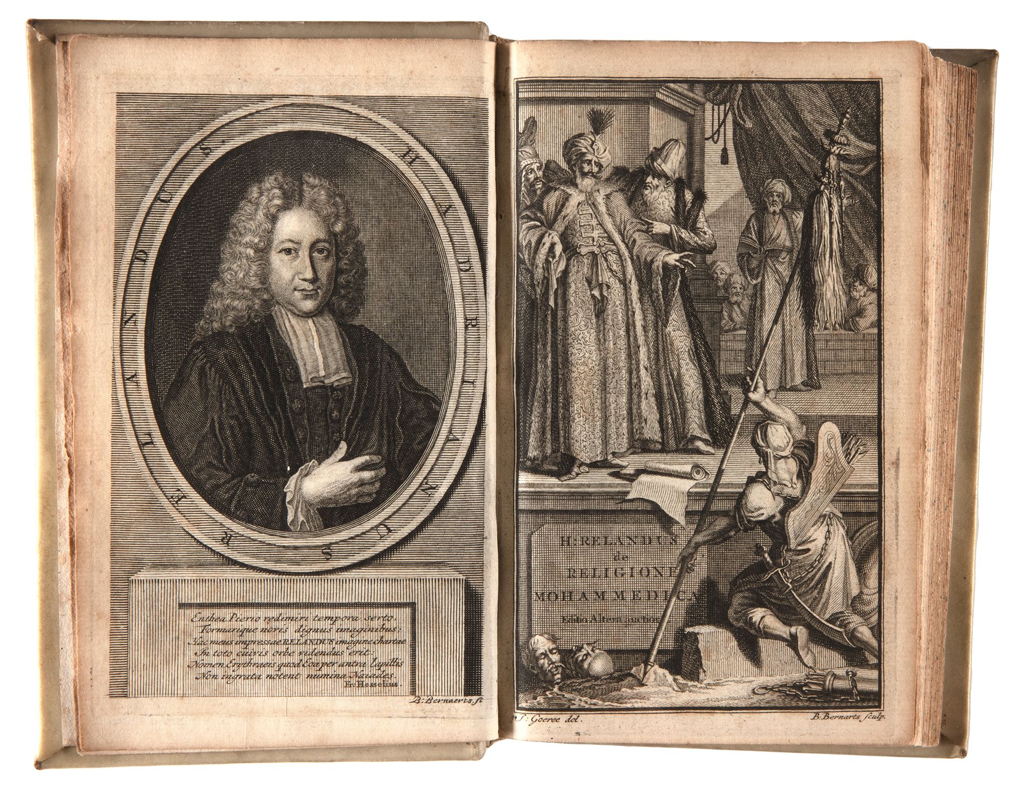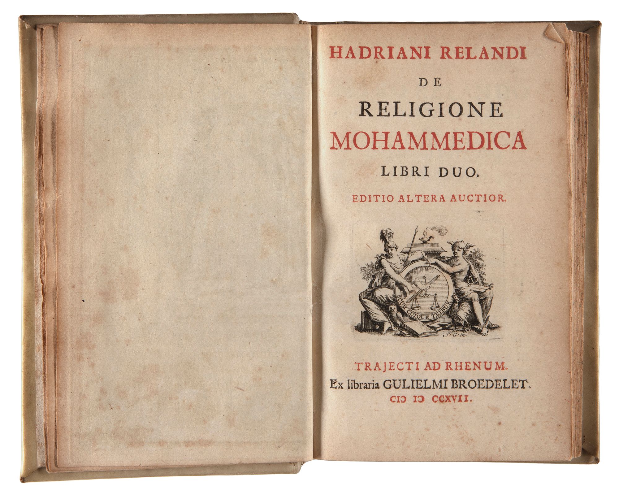 RELAND, A. De religione Mohammedica libri II. Ed. 2a auctior. Utrecht, G. Broedelet, 1717. W. engr. front.-portr., engr. ti., ti-vign., 3 fold. engr. (of which 1 large fold. depicting Mecca) & 1 fold. table. Sm-8º. Cont. vellum. (Slightly browned).