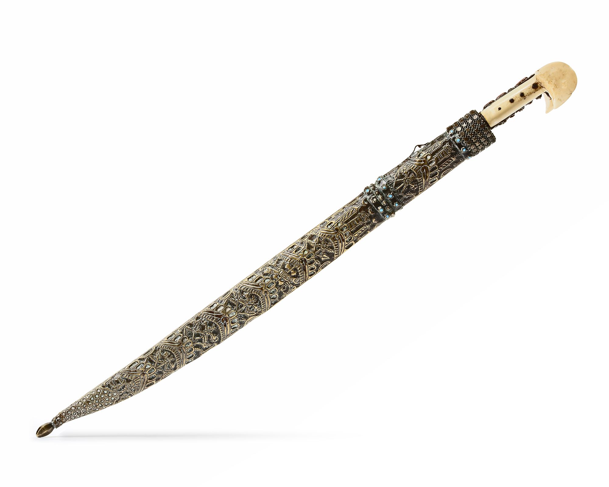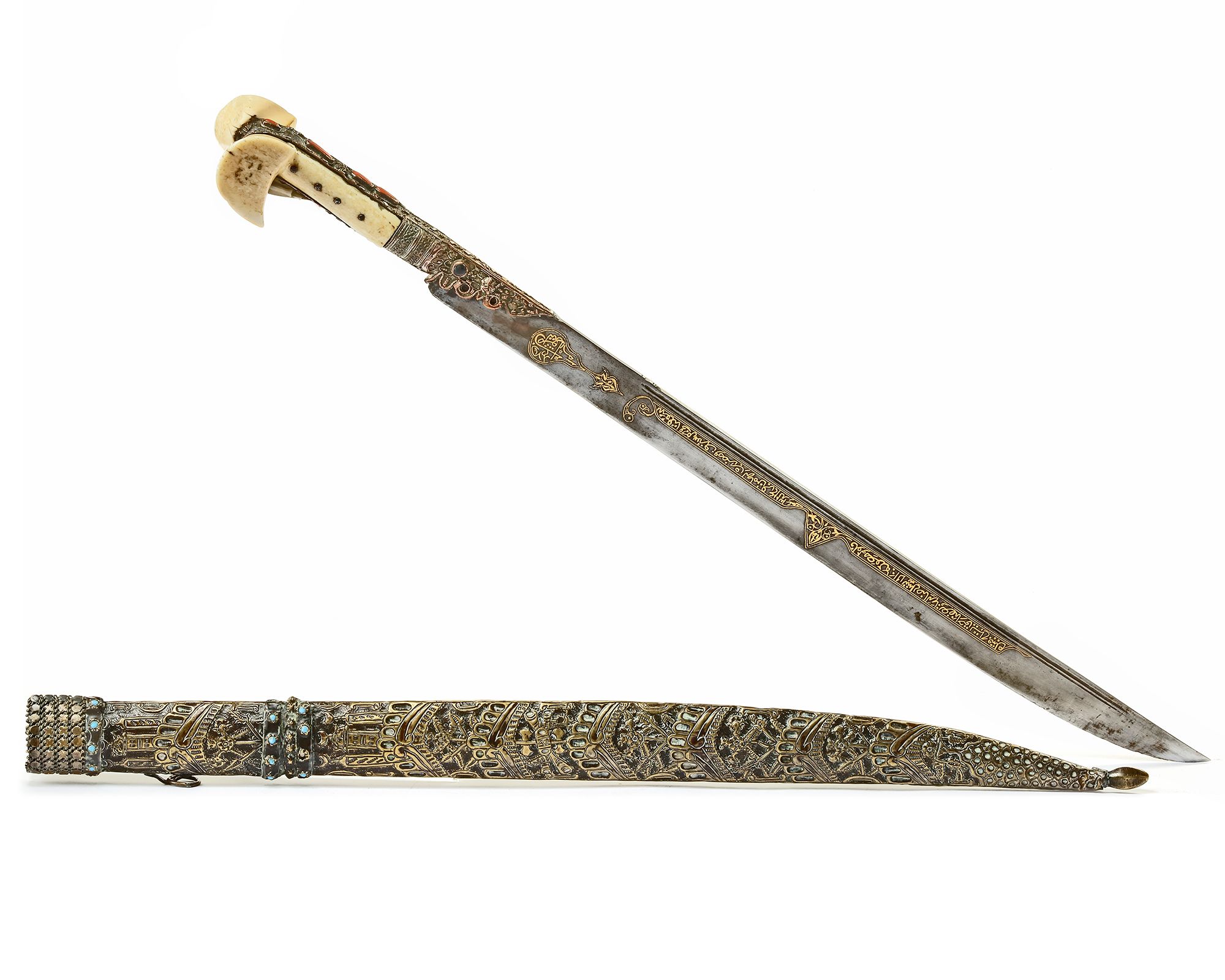 With slightly curved tapering single edged steel blade, walrus ivory hilt, prominent ears forming the pommel, the forte and center of the hilt mounted with appliqué silver studs, the blade decorated with a gold damascened pole medallion on one side, an inscription filled cartouche on the other, its wood scabbard entirely covered in silver elaborately embossed with rococo style foliage and urns containing floral sprays. L 77 cm.