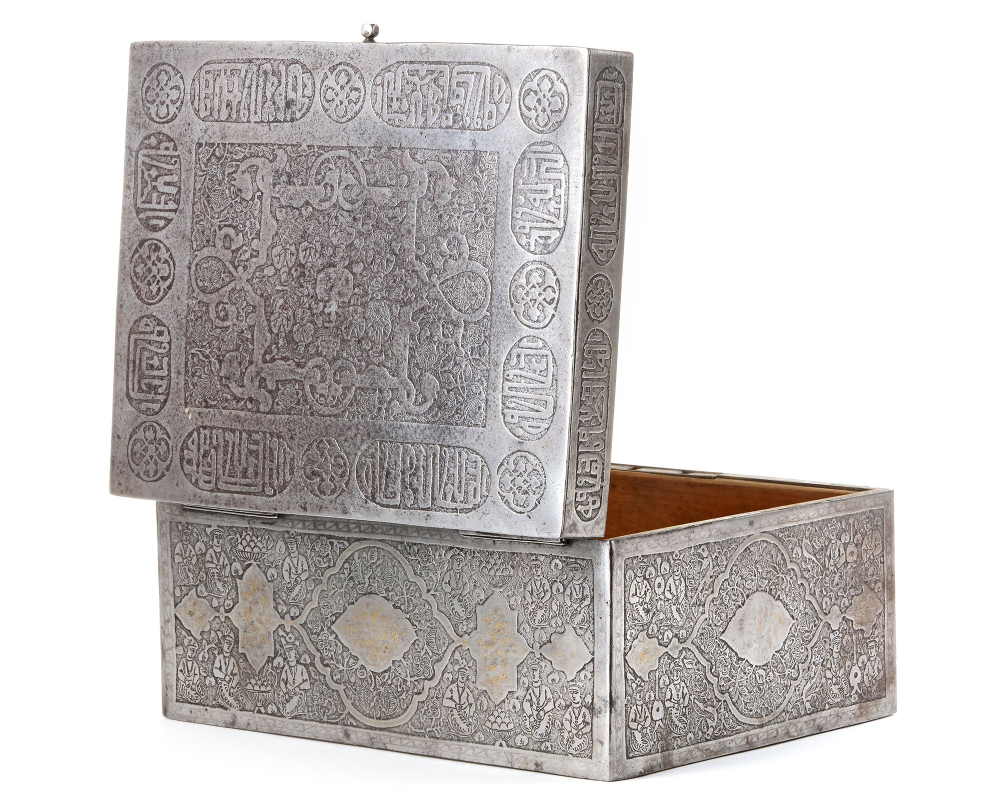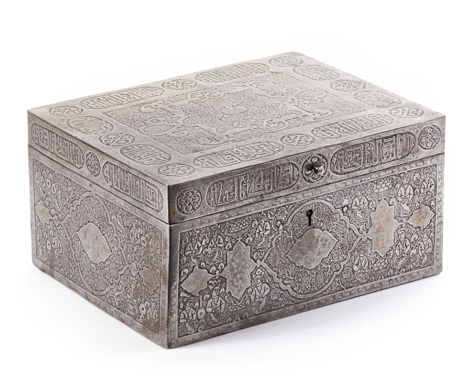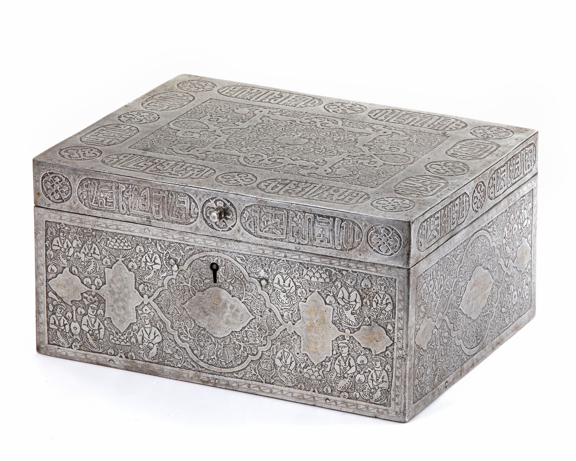 A metal box carved to the cover and the sides with seated figures with foliage and calligraphy. 26 by 20 by 13 cm.