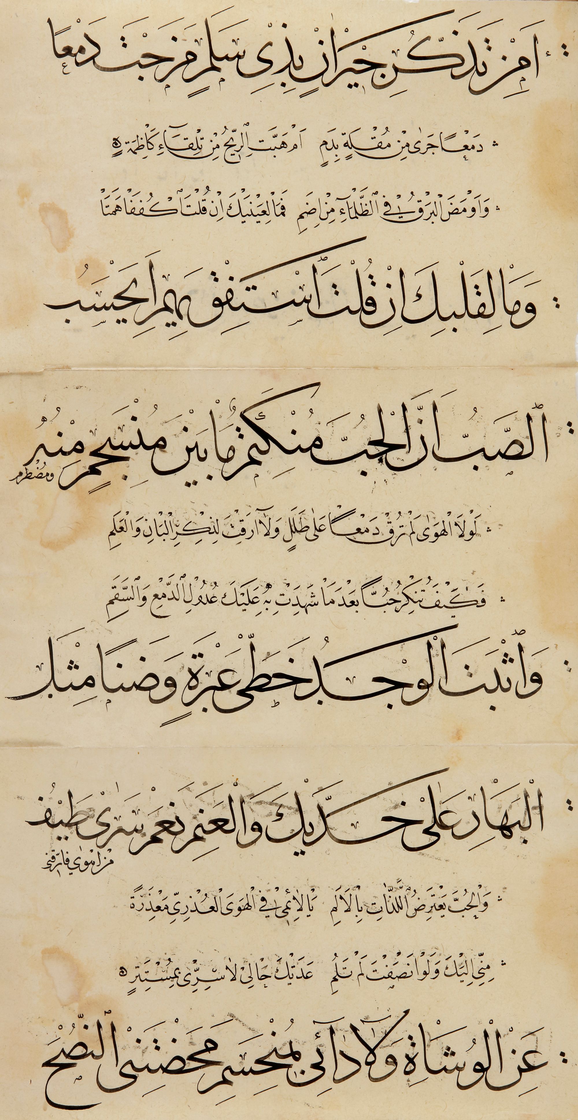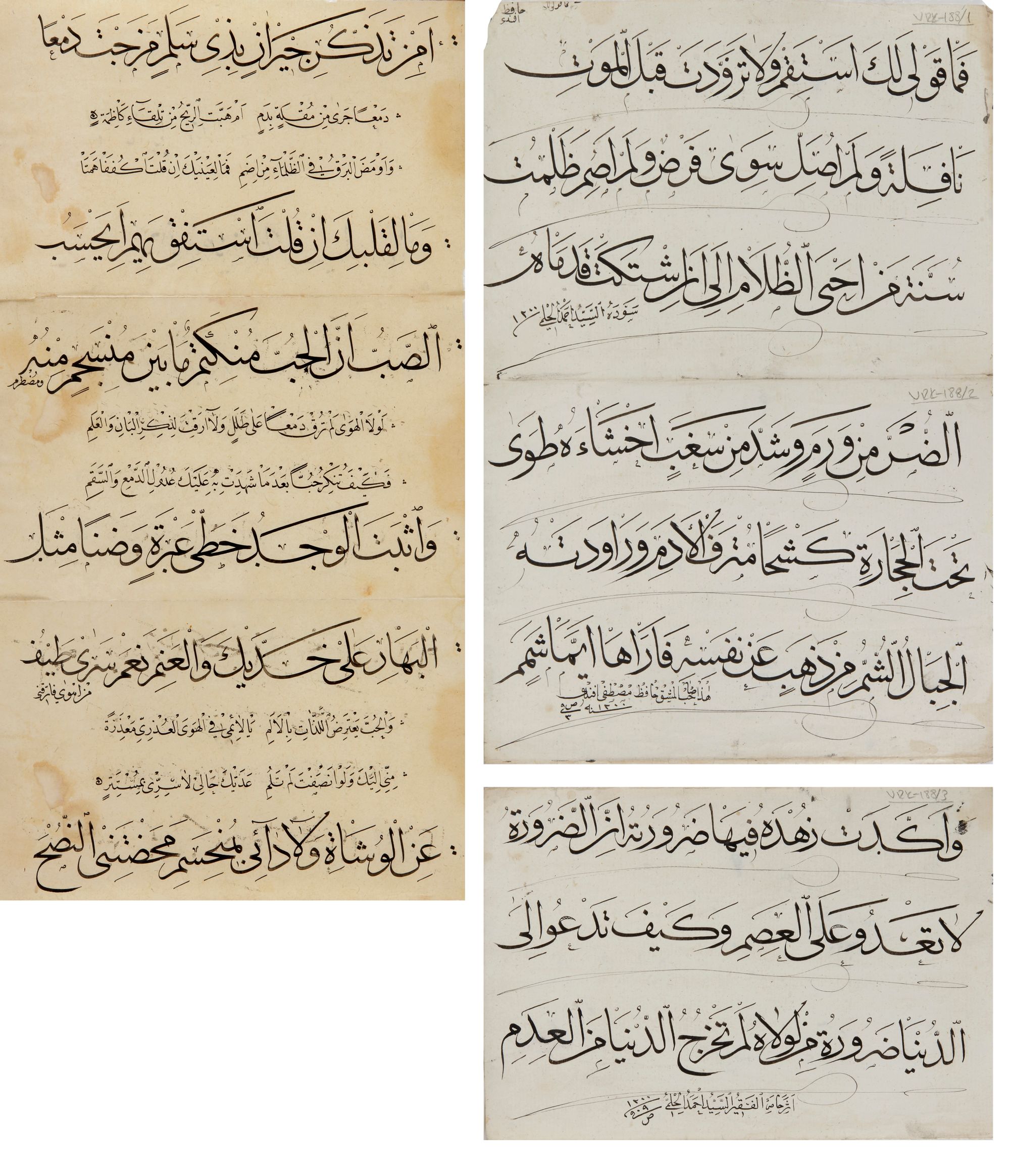 Three calligraphic panels in black naskh script of Arabic and Ottoman poems. Signed by Hafiz Mustafa Rakam Afendi and Ahmed Halim. Calligraphy 31 by 23 cm., 41 by 22 cm., 16 by 22 cm.