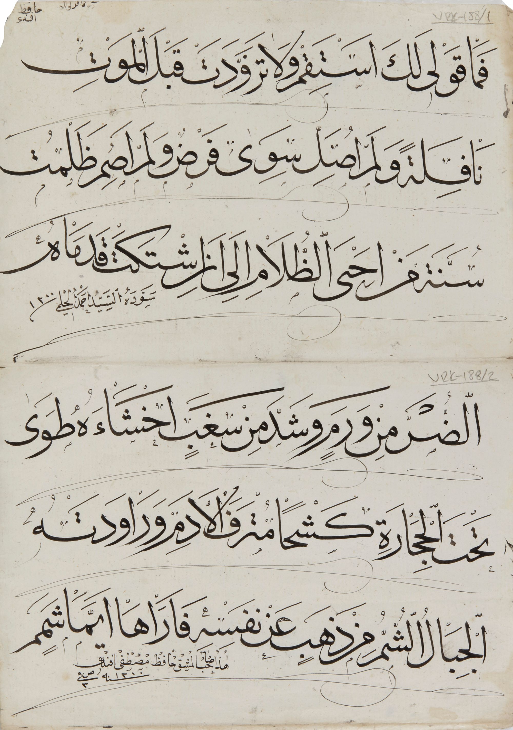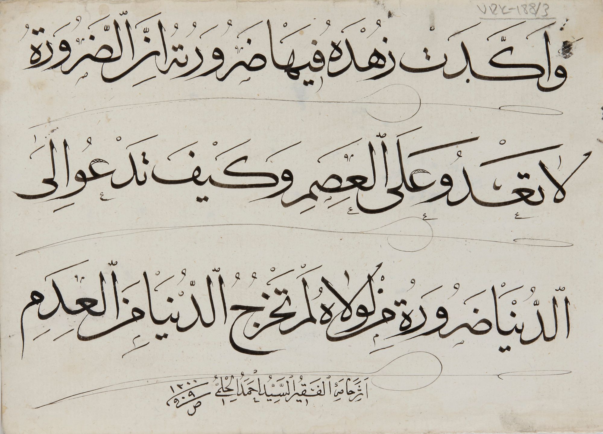 CATALOGUE NOTE Hafiz Mustafa Raqam born in a small city located at the black sea in 1171 AH/1757 AD. He was a student at Darwish Ali III for a while, then began writing lines for statesmen and the wealthy classes in Istanbul. For his creativity the Sultan appointed him as a teacher of the royal palace, and was entrusted to draw the currency and the Sultan Tughra in the firmans issued by the Sultan.