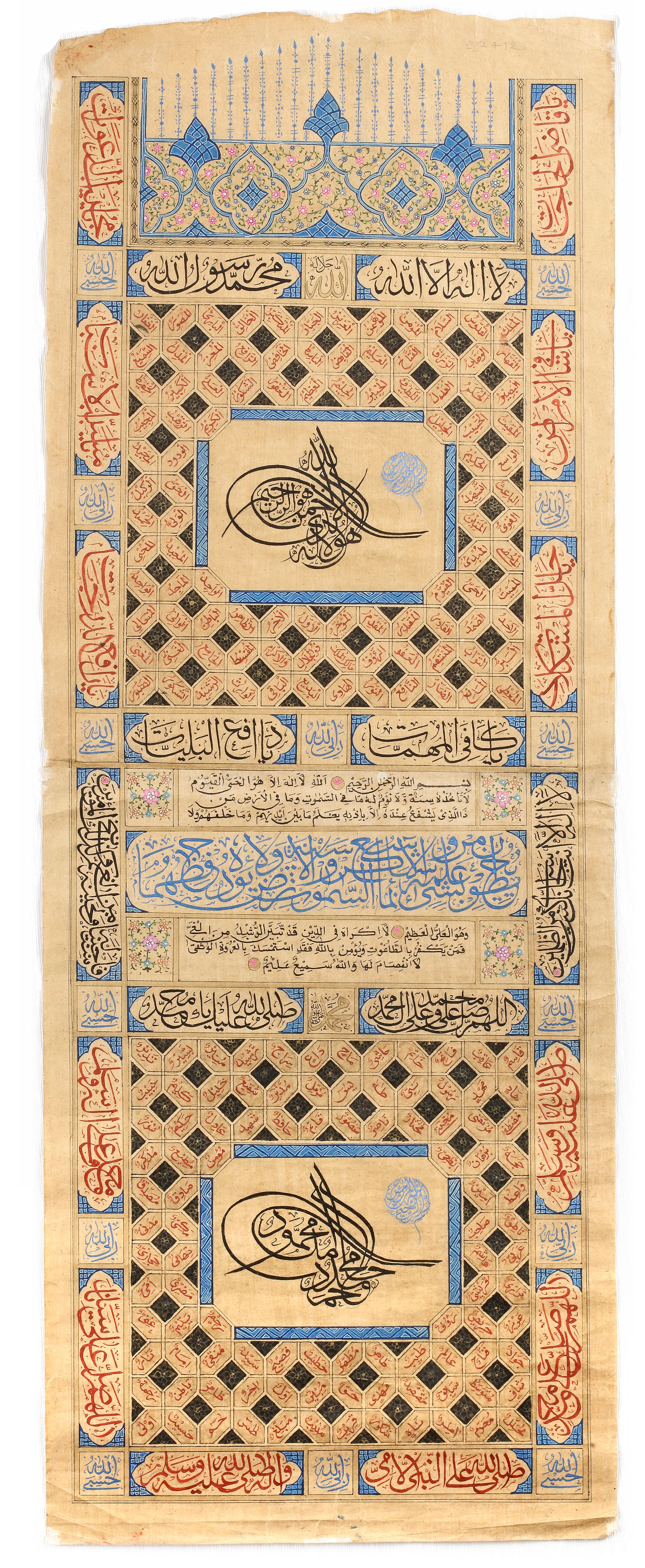 To the center with large panels enclosing Quran 2 surah Al-Baqarah v.255 and v.256. The upper part with a panel enclosing names of ‘Allah’ in tughra script surrounded by geometric designs with the 99 beautiful names of Allah. The lower part with a panel enclosing four known names of the prophet in tughra script with geometric designs enclosing attributed names of the prophet. The sides with cartouches with verses from the Quran and praises to the prophet.