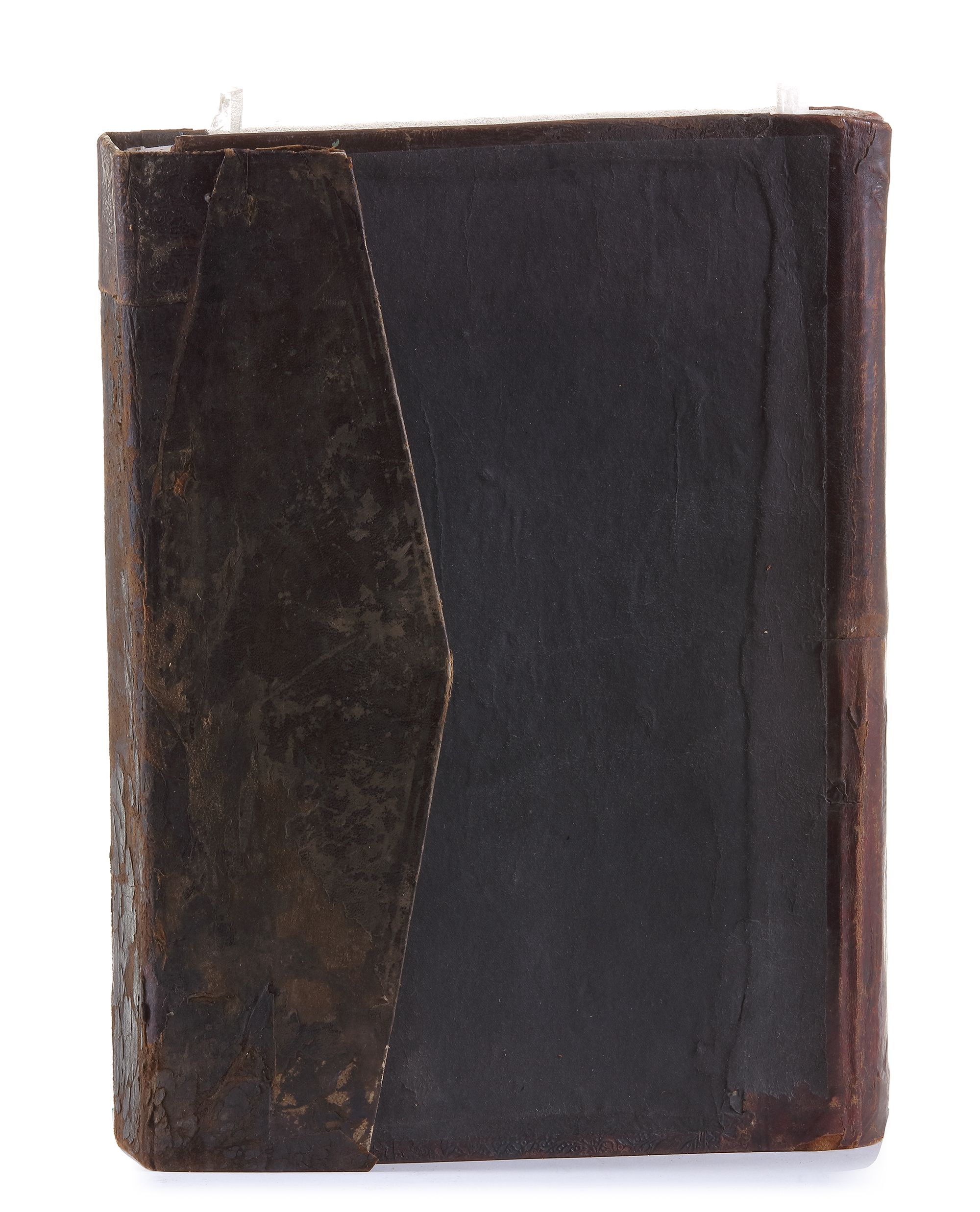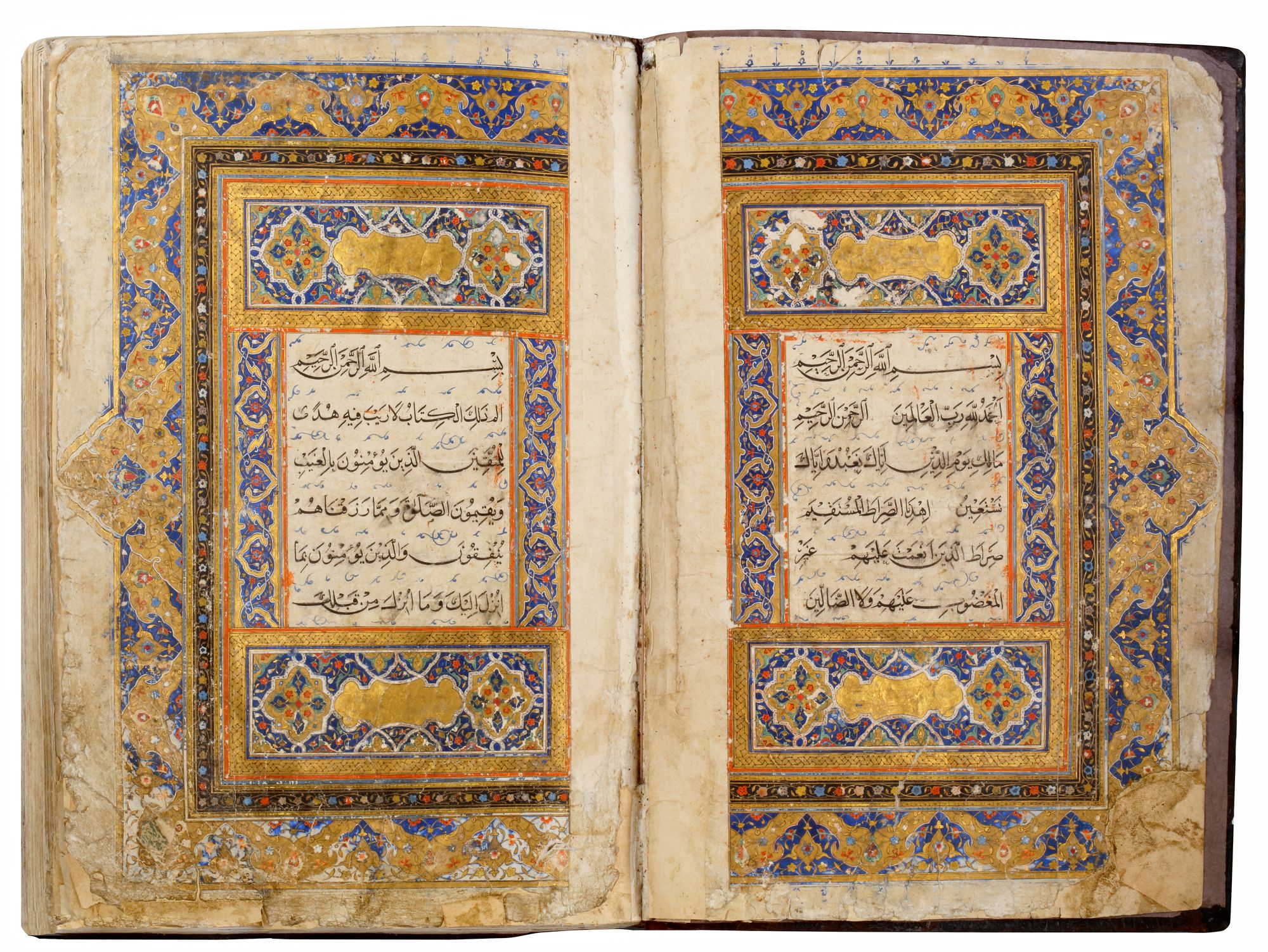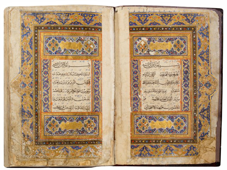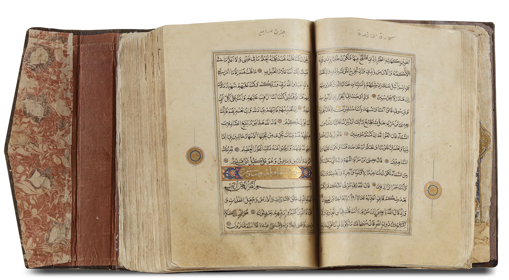 An Arabic manuscript on paper with 288 leaves and two flyleaves, with 14 lines to each page in bold black naskh script with notations in red within double gold and blue borders. A complete Quran, surah headings in white thuluth within gold and polychrome cartouches, gold roundel verse markers surrounded by blue border, gold marginal medallions marking ‘khams and ‘ashr’. Opening bifolium with dense gold and polychrome illumination with arabesque over gold, polychrome and marginal palmettes extending from the sides, brown morocco with flap. 34 by 24 cm.