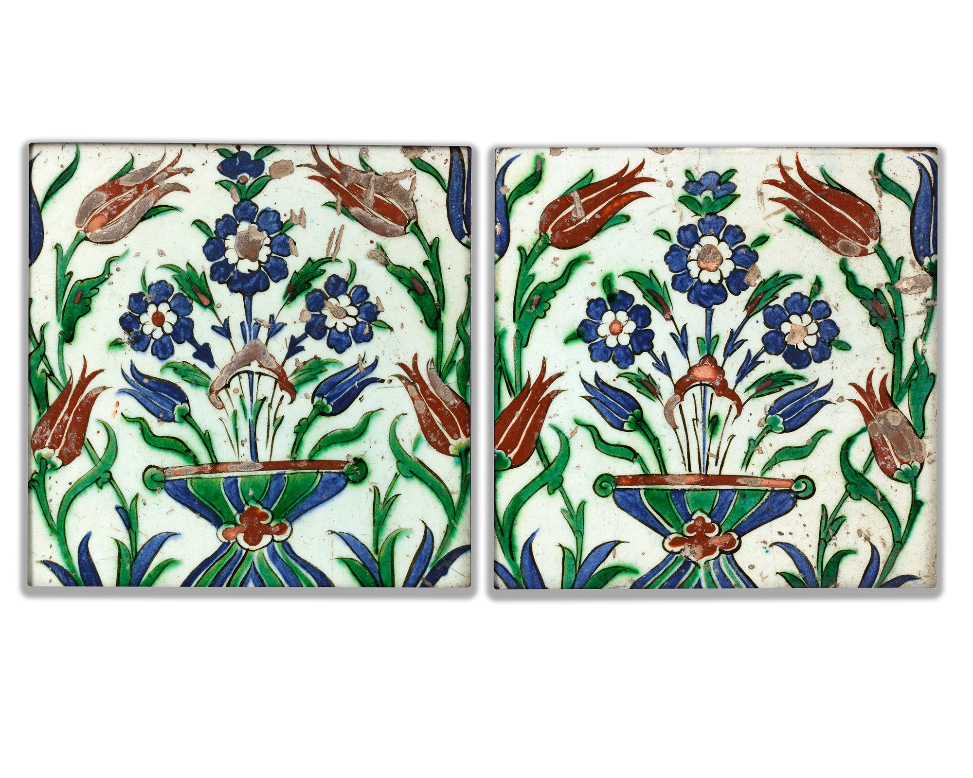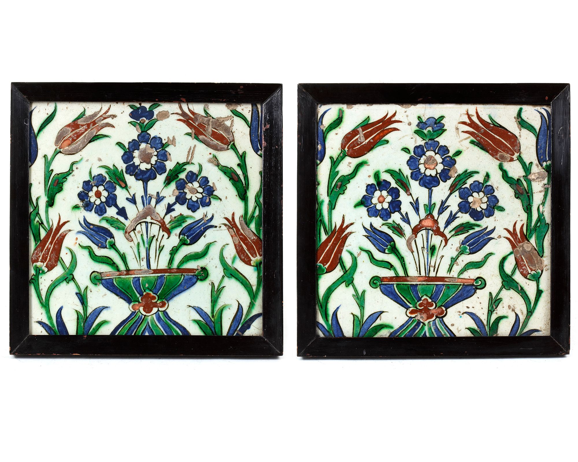 The polychrome painted decoration consisting of a floral spray rising from a vase, flanked by swaying tulips, framed. 24 by 24 cm.