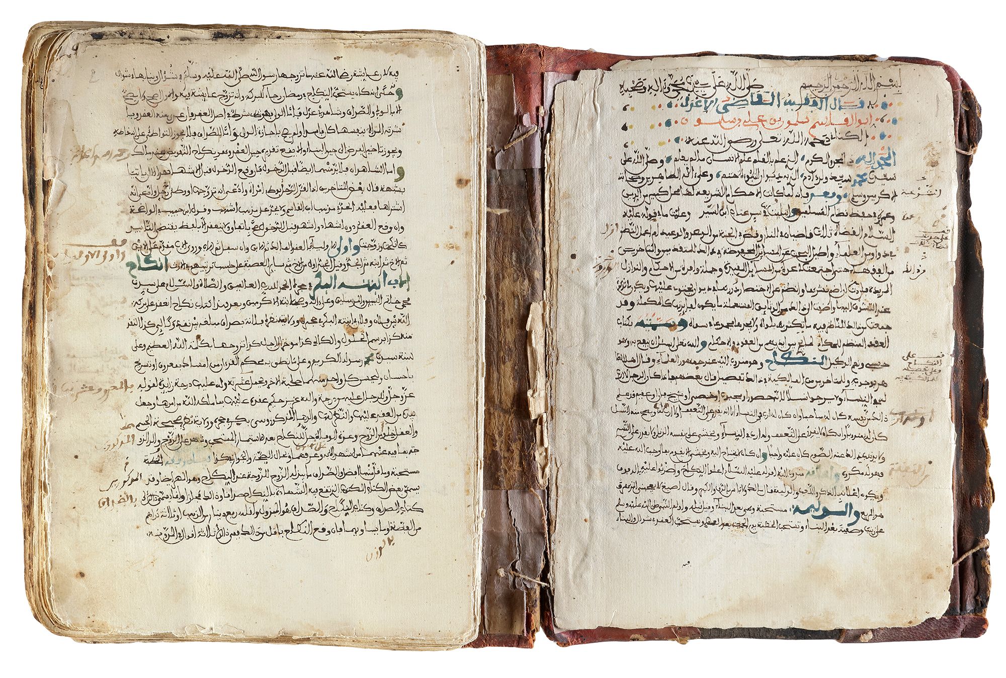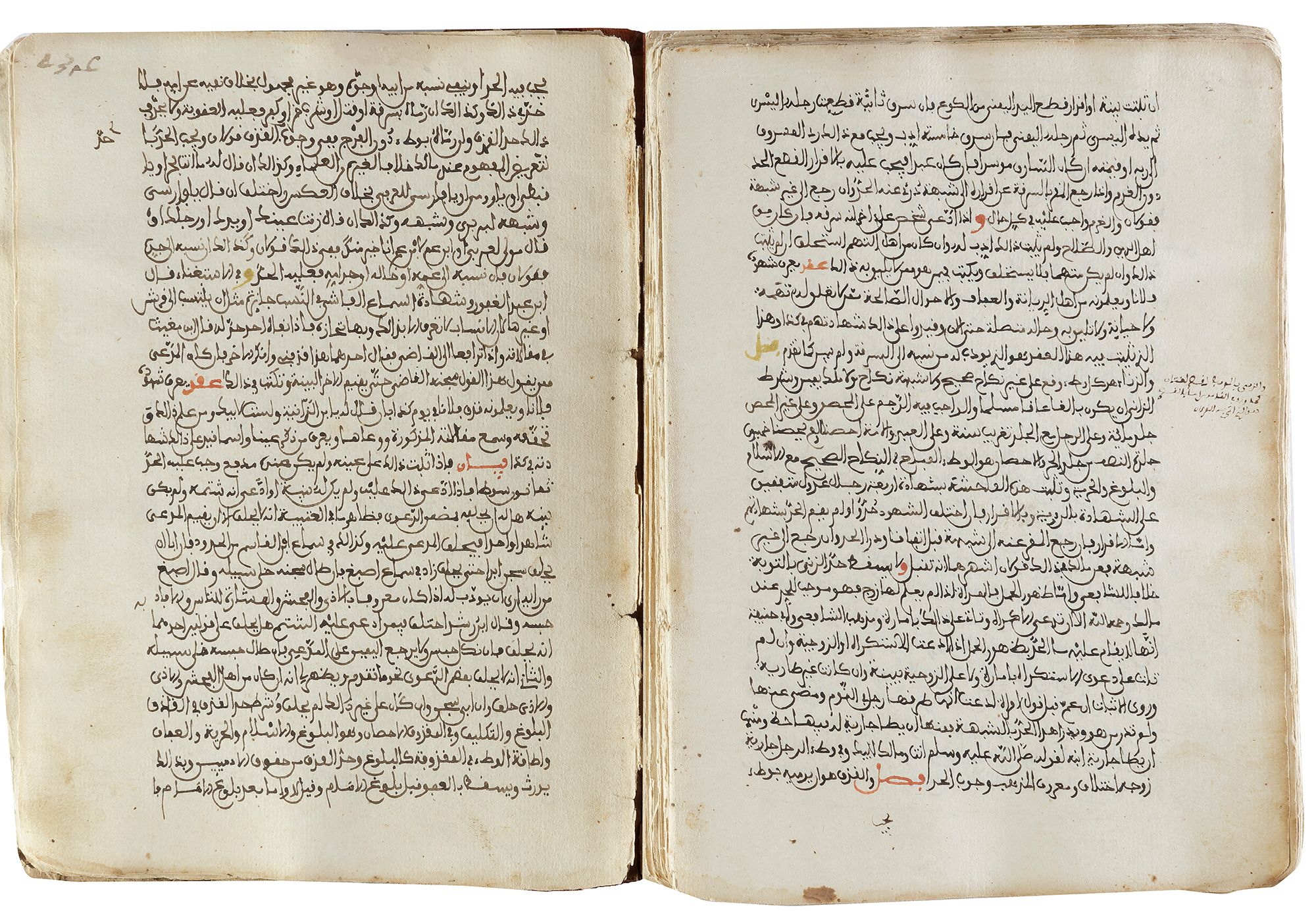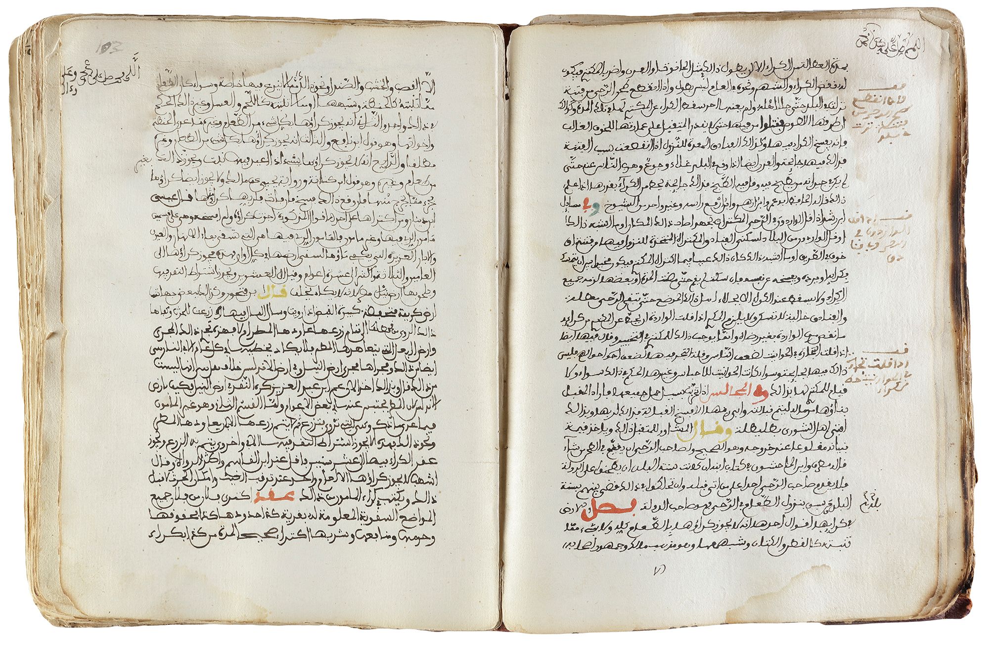 Arabic manuscript on paper, 25 lines to each page, written in black Maghribi script, titles and catchwords in green, red and yellow, occasional marginal notes.