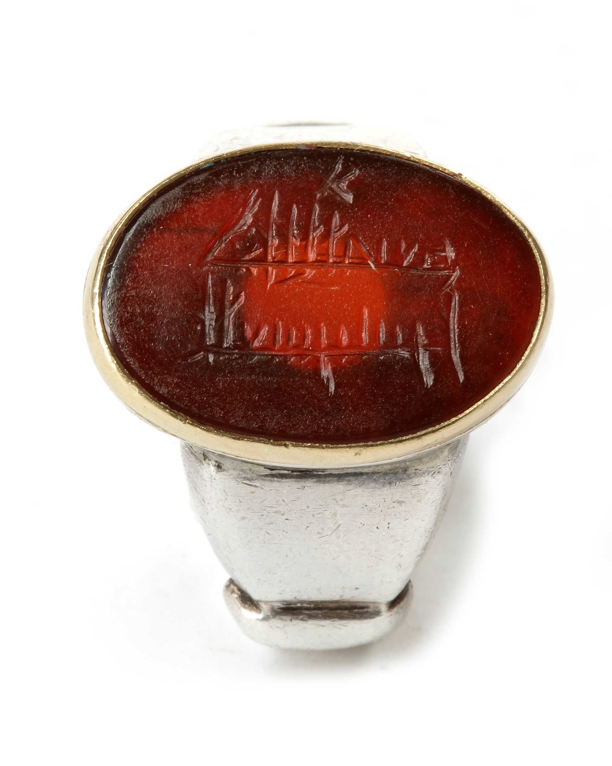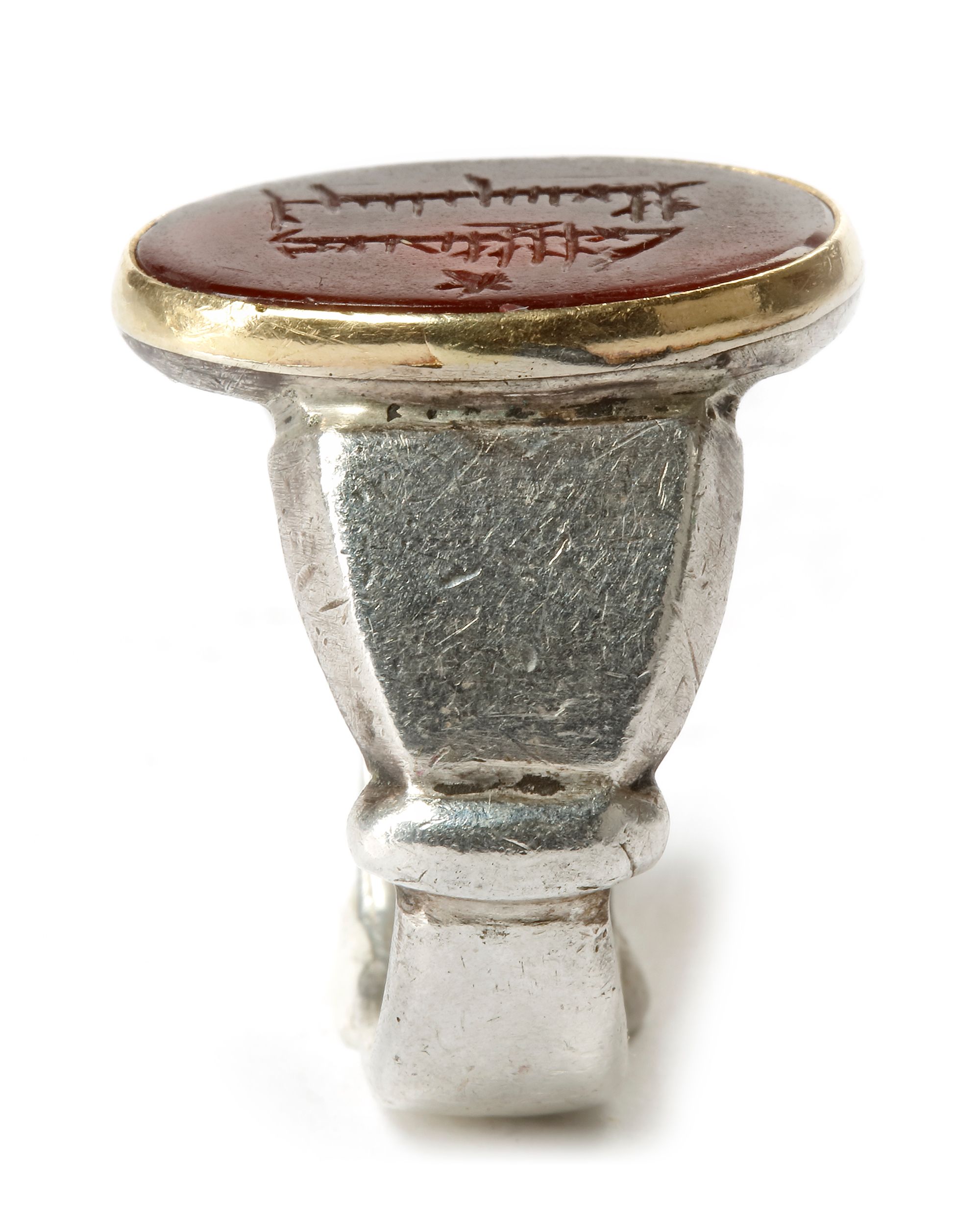 A silver ring with gold mounting around the agate surface, carved with kufic inscriptions (سيجعل الله بعد عسر يسرا) Ringsize:19 mm.