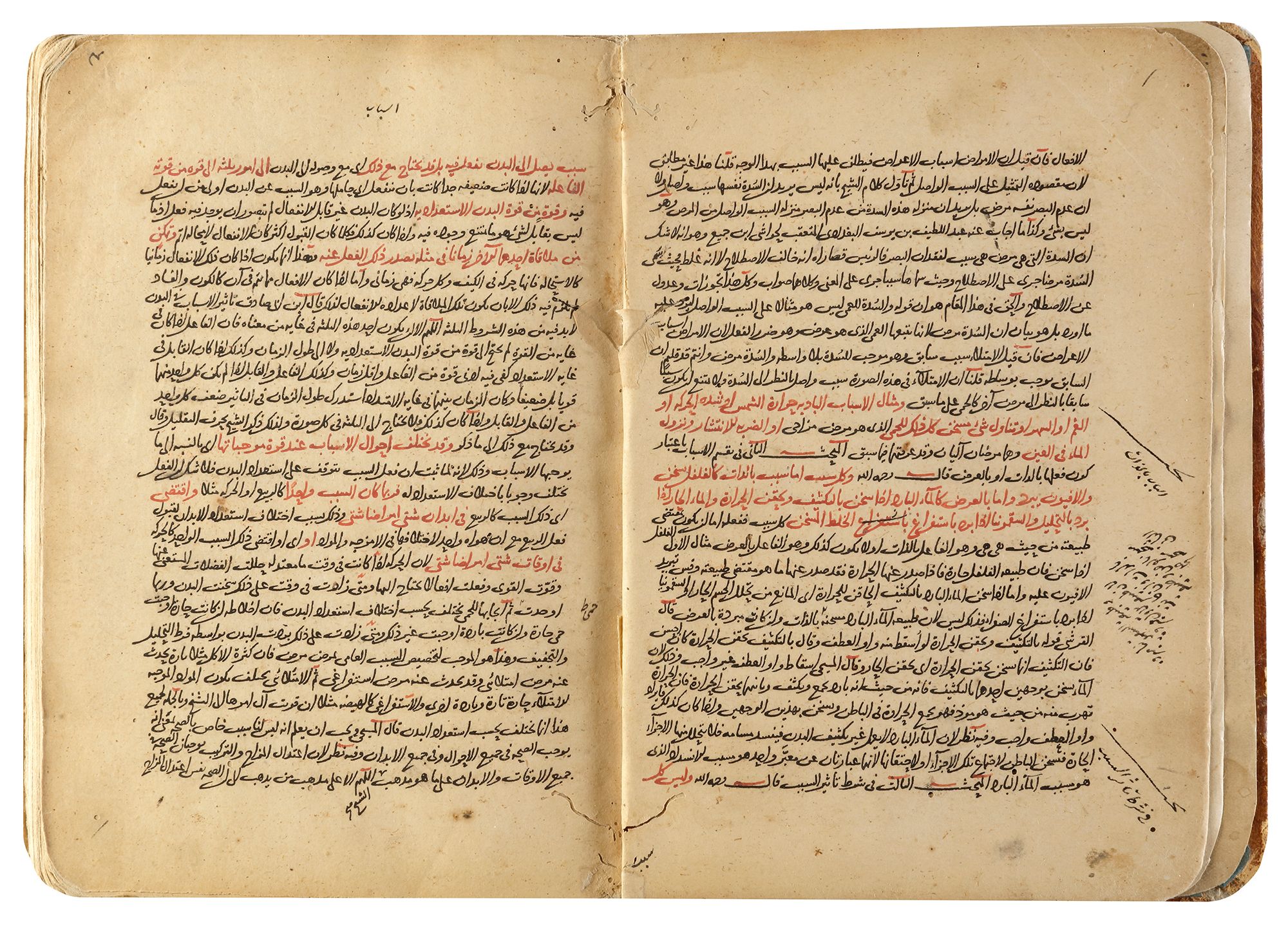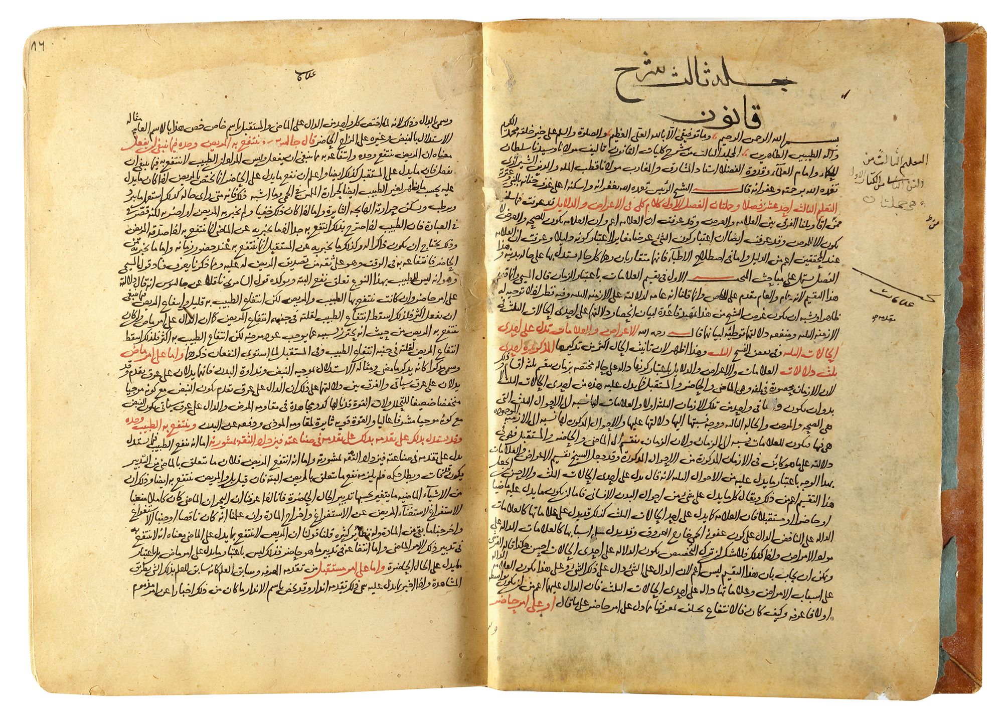 Arabic manuscript on paper, 185 leaves and 180 leaves, both with 27 lines to each page, written in naskh script in black ink, important words, titles and sentences in red. Commentary on the first volume of Ibn sina book Al-Qanun and called Shah Kulliyat Al-Qanun by Qutb al-Din al-Shirazi (1236-1311) 23.2 by 16.2 cm.