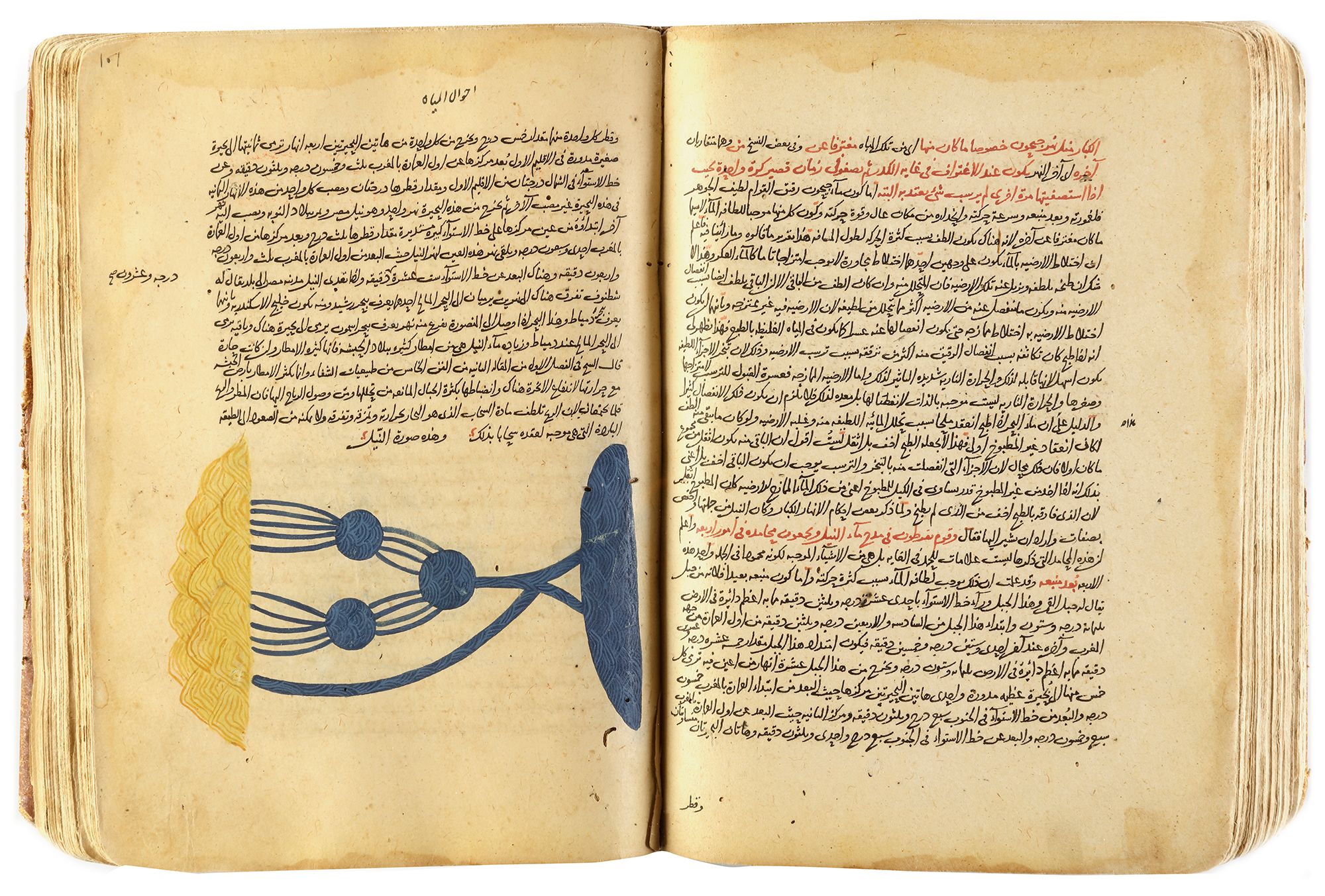 Images of the Nile in commentaries of the Qanun by Ibn Sina are unusual but not unheard of. A drawing of the river is on f.115b of the Sharh kulliyat al-Qanun by Ibn al-Nafis, now in the Bodleian Library (inv.no.MS Huntington 102, Savage-Smith 2011, pl.XXVI), whilst another illustration very similar to the present can be found in a commentary by Ibn al-Nafis attributed to Mamluk Egypt, sold in Sotheby's, 7 October 2015, lot 208.